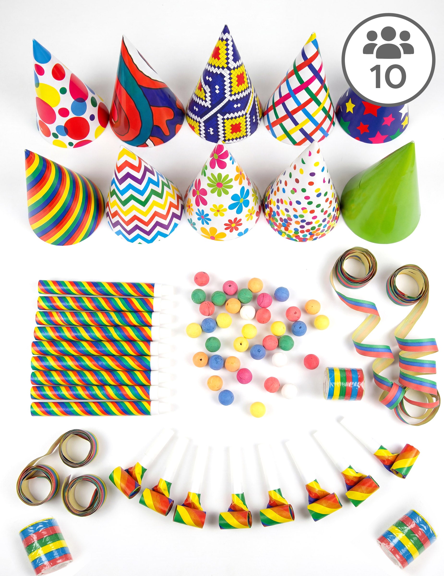 To paket pisanih daril za zabavo Vključuje 10 klobukov, 10 pihalnih pištol s 100 kroglicami, 10 pihal za zabave in 30 spiralnih trakov.