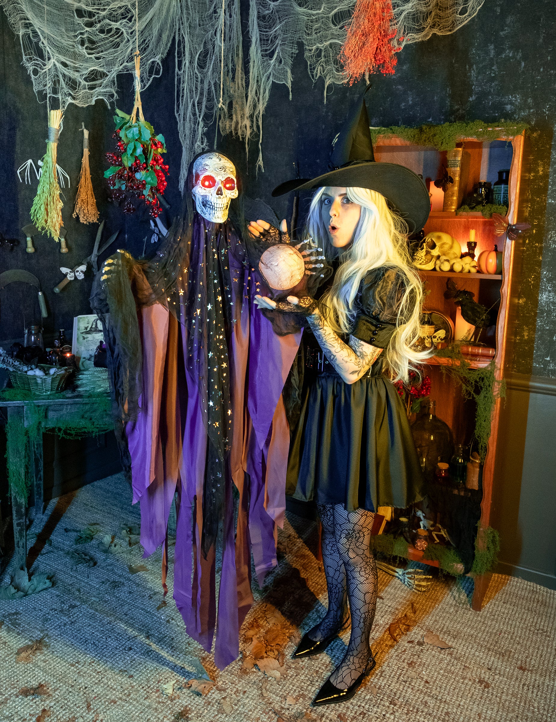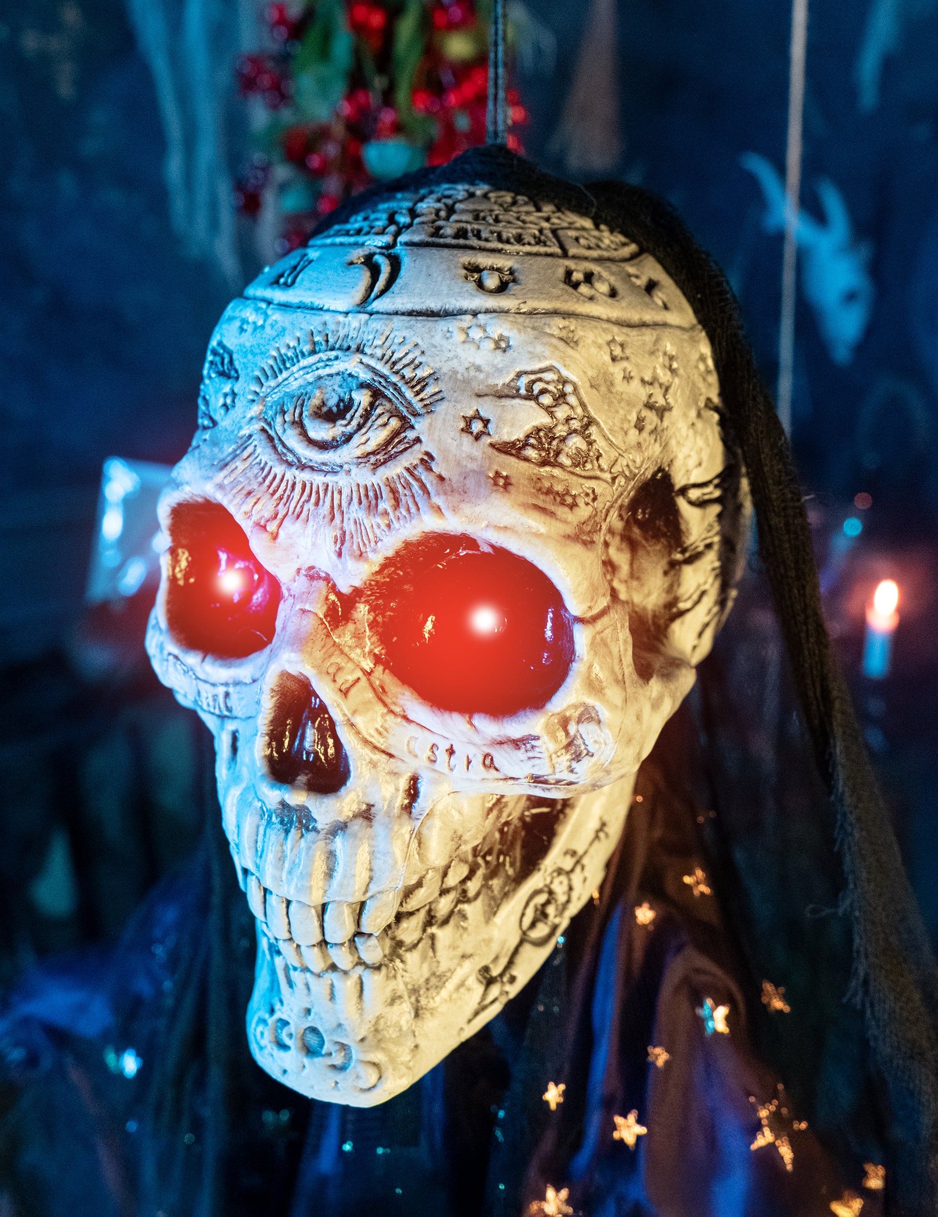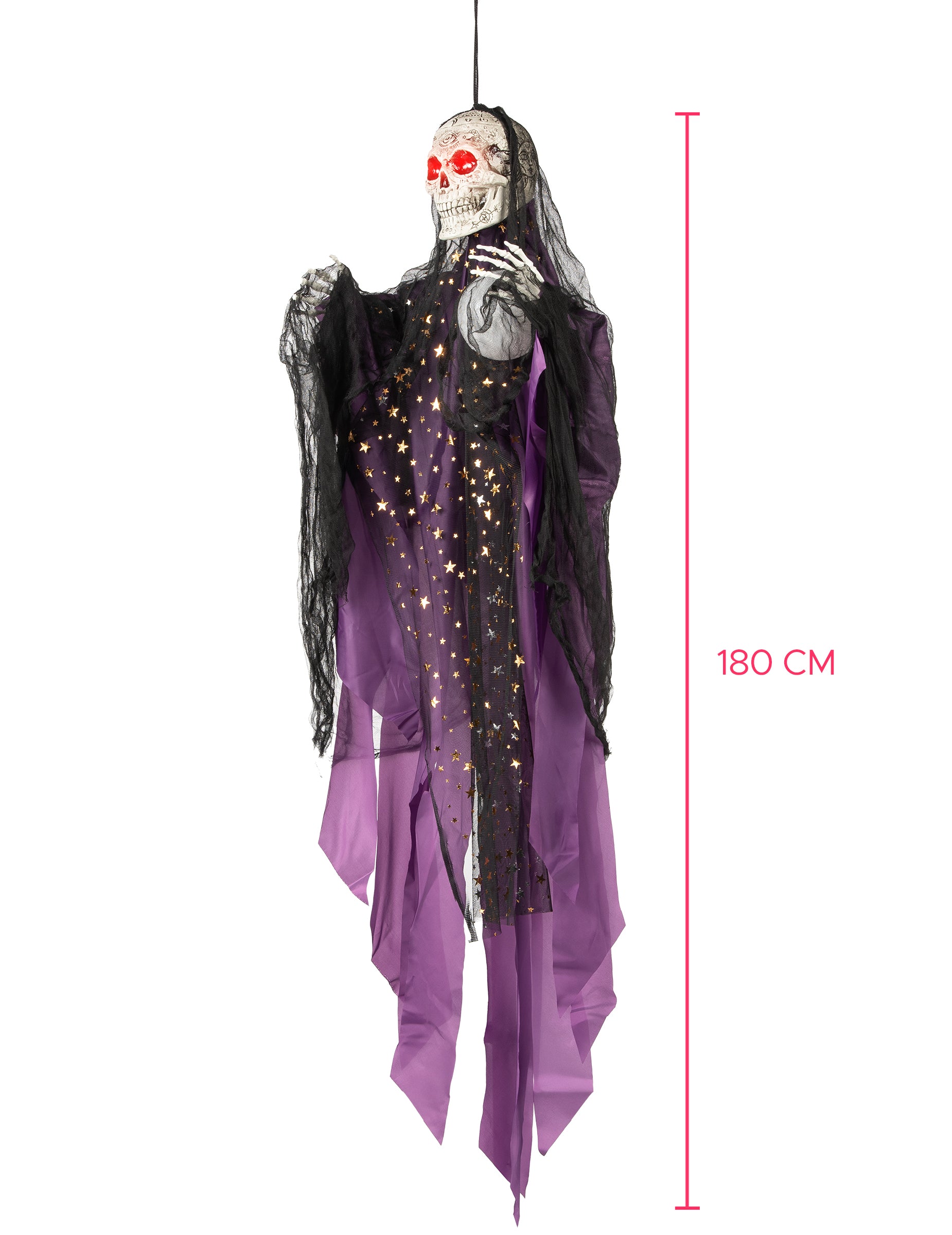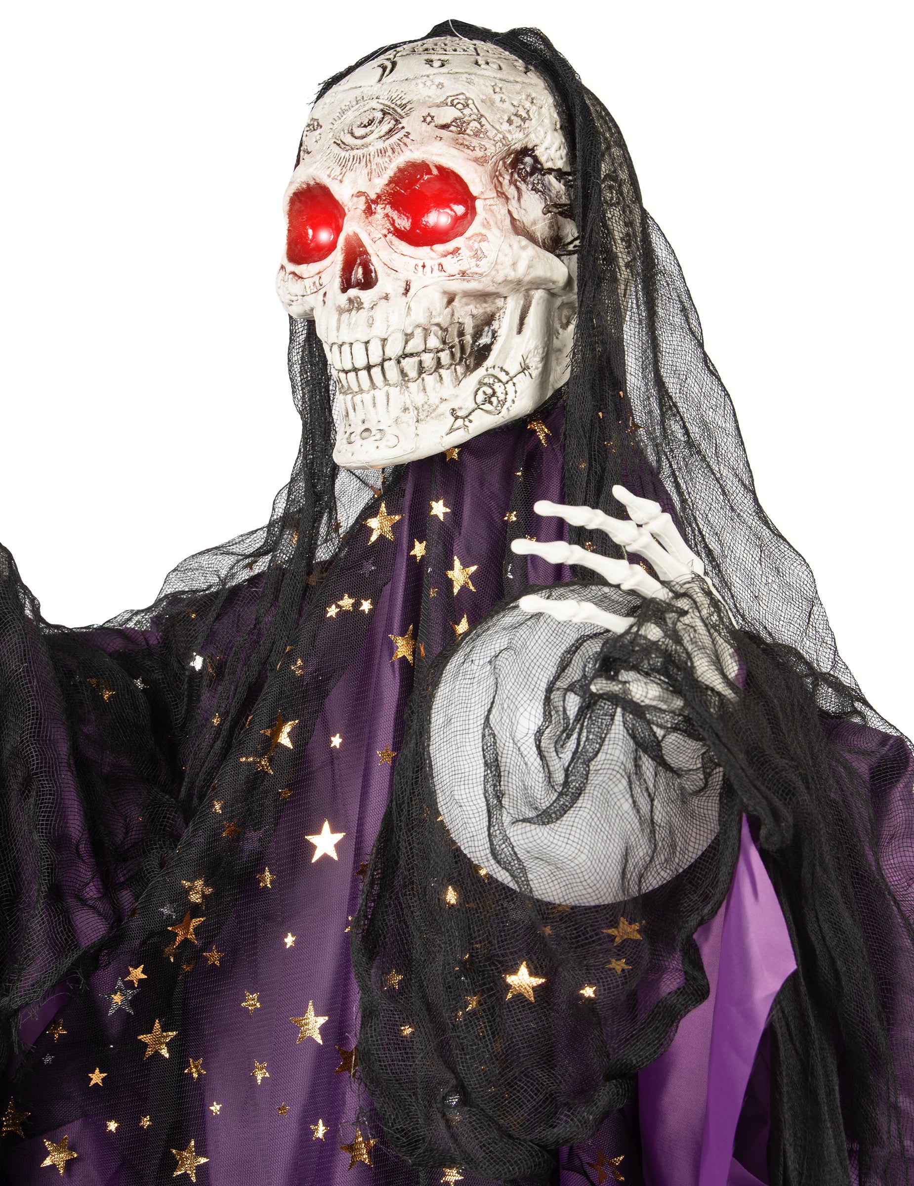 Ta okostje svetlega in zvočnega jasnovidca je visoko 180 cm. Ta viseča dekoracija predstavlja okostje jasnovidca, drapiranega s črno in vijolično tančico, okrašeno z zvezdnimi vzorci. Njegova lobanja je vgravirana s skrivnostnimi simboli, ki vzbujajo uroke, ki lahko zamrznejo vašo kri. Če želite prižgati okostje, samo preklopite stikalo in ob najmanjšem hrupu bo zaživel. Clairvoyant se bo zasmejal, oči se bodo prižgale v rdeči in bliskavici, medtem ko bo njena kristalna kroglo zasijala, da bo razkrila vašo prihodnost. Deluje s 3 aaa baterijami (baterije niso vključene). Ta dekoracija bo kot nalašč za teroriziranje mimoidočih med nočjo noč čarovnic.