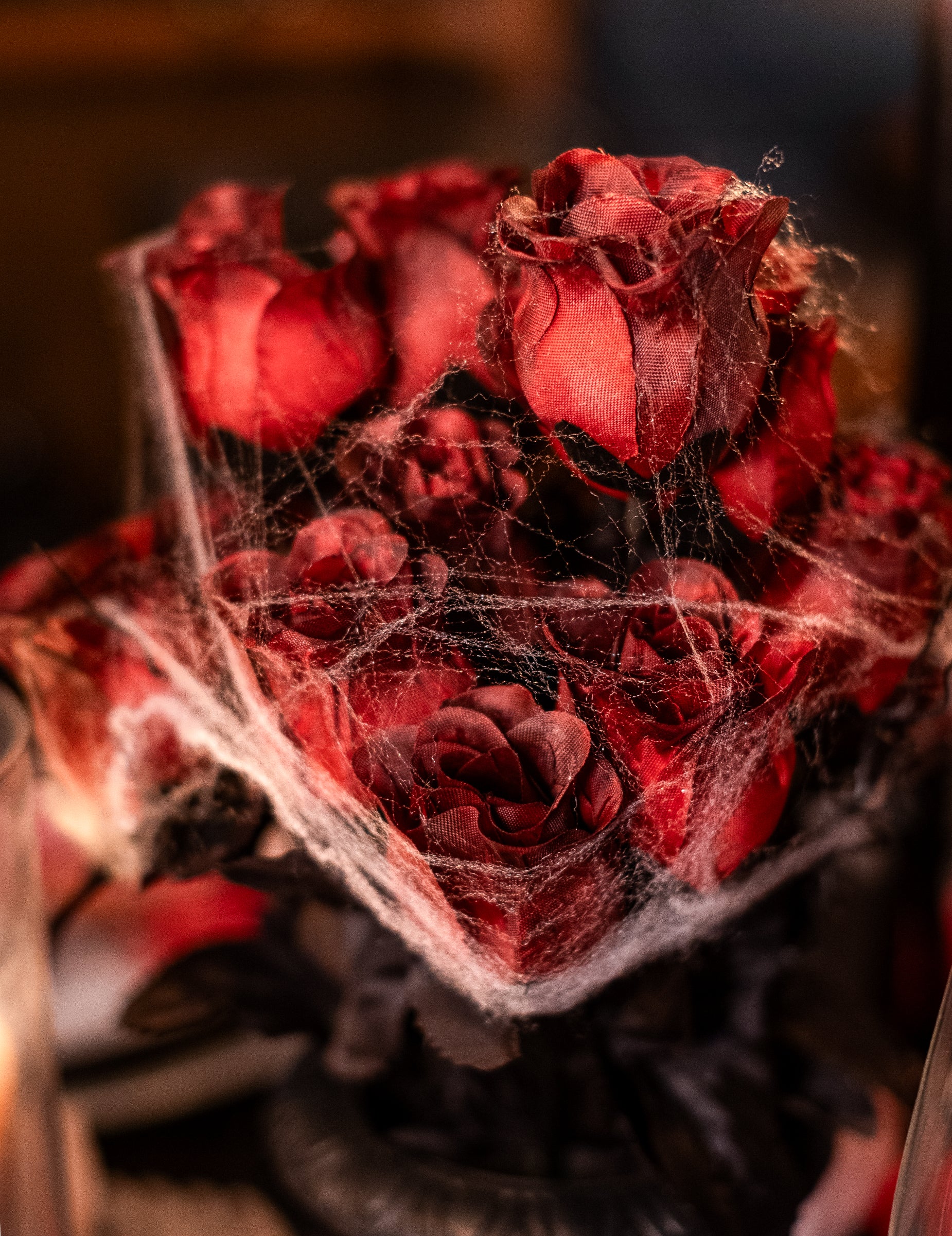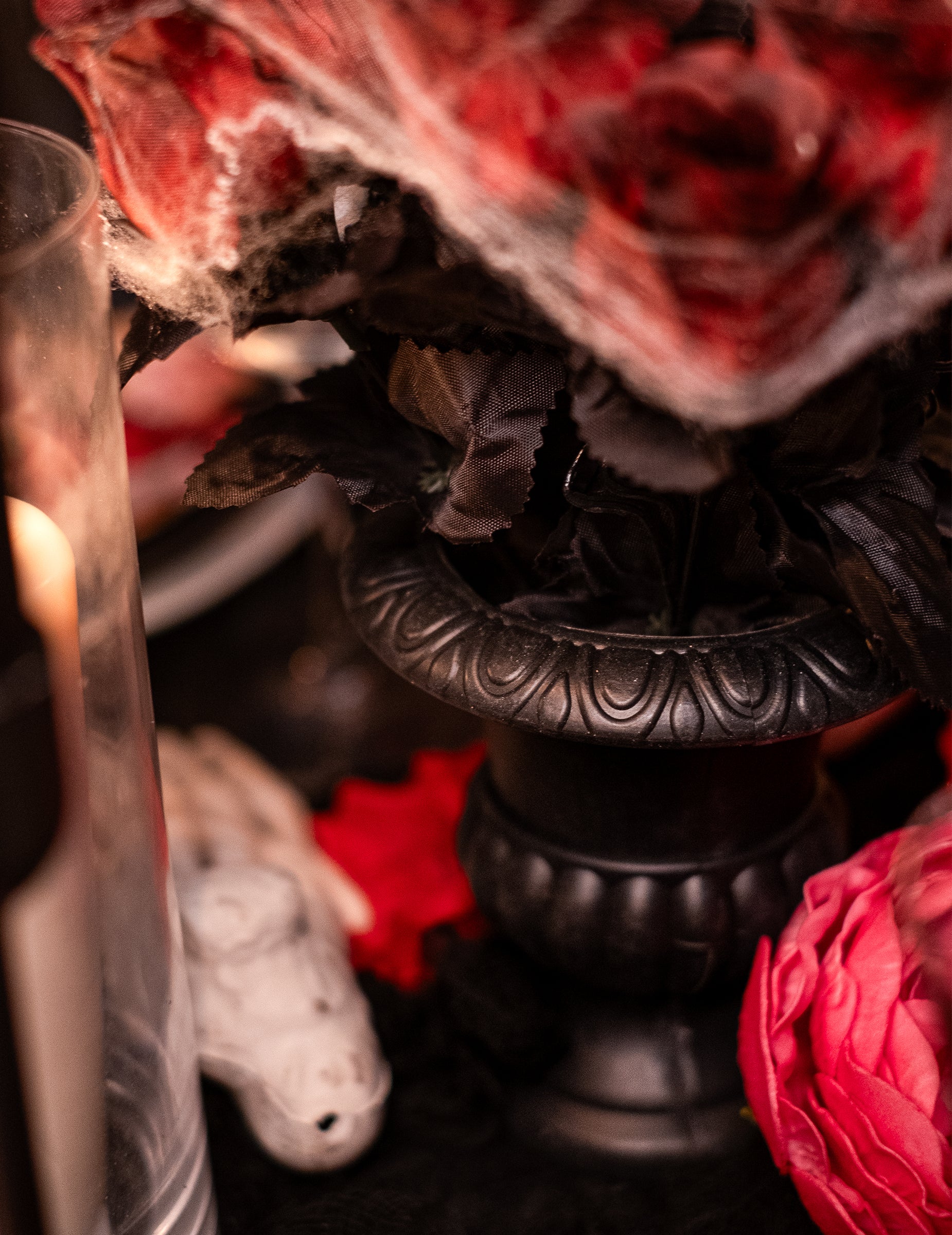 Ta črna dekorativna vaza izgleda, kot da je pravkar prišla iz zapuščene graščine. V notranjosti so ovenele rdeče vrtnice prepletene s temnim listjem, kot bi bil čas obstal. Tanke pajčevine se oprijemajo vaze in poudarjajo prašen in srhljiv učinek.