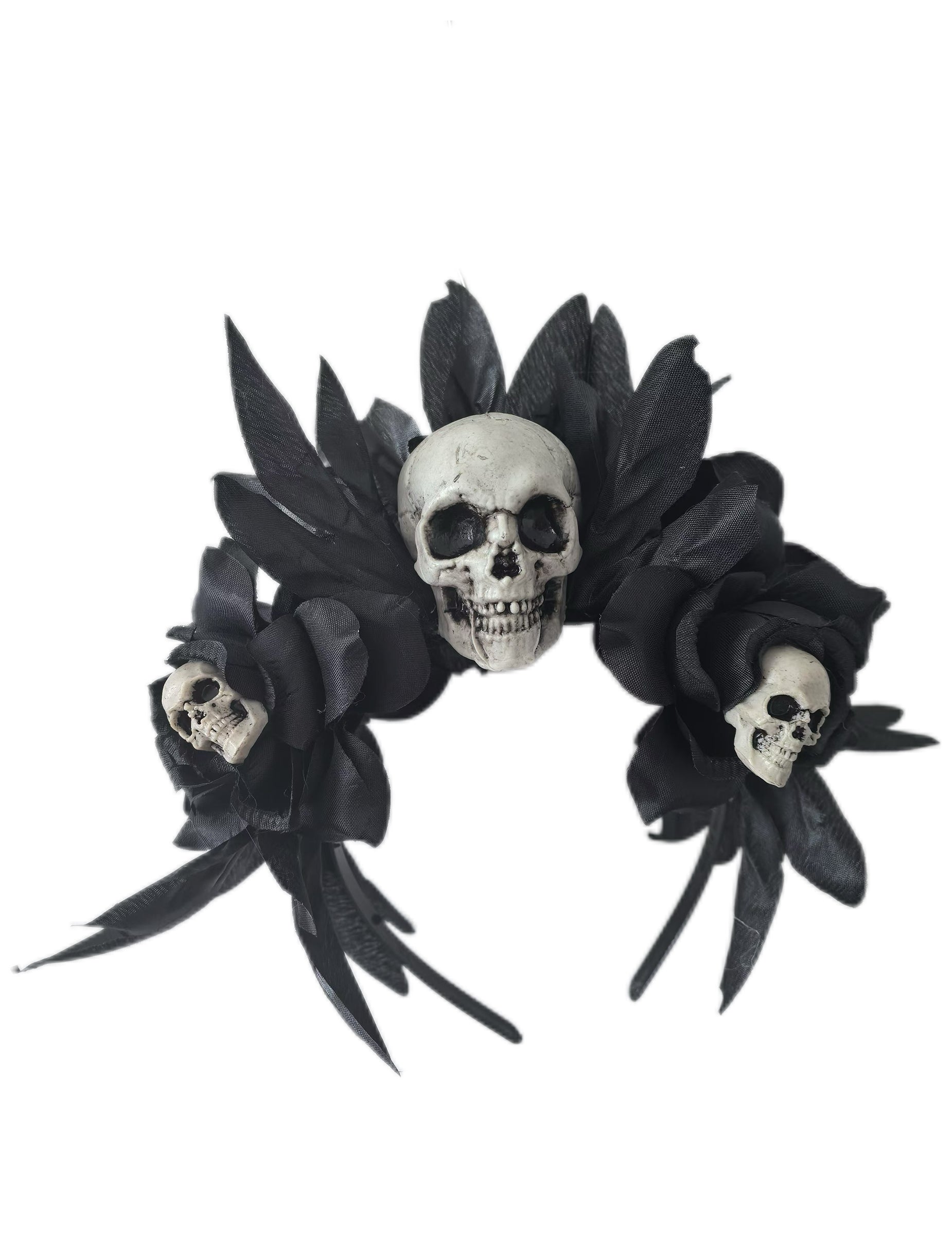 Ce serre-tête orné de roses noires et de crânes est l’élément parfait pour sublimer un look sombre et mystérieux. Les fleurs en tissu noir sont décorées de trois crânes. Idéal pour un déguisement gothique ou Dia de los muertos, une tenue de sorcière ou une soirée d’Halloween, il apporte une touche effrayante mais élégante à votre coiffure.