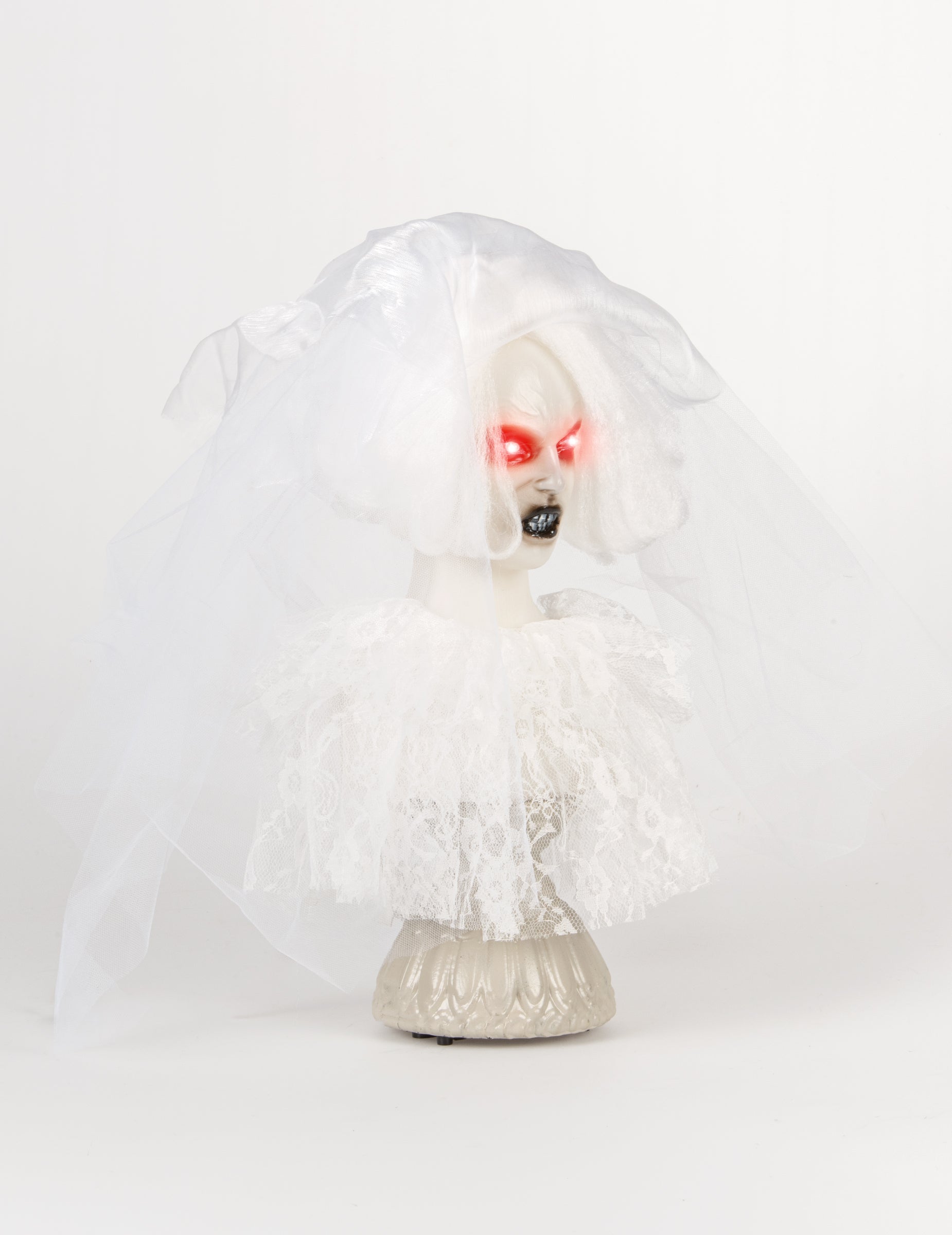 Z belimi tančicami in bledim obrazom, ta duhovita nevesta za mizo 40 cm Zdi se, kot da je zamrznjen med dvema svetovoma. Njegove svetleče rdeče oči prebadajo temo že ob najmanjšem zvoku, ki ga spremlja srhljiv krik. Postavljen na omaro ali konzolno mizico, ponuja zagotovljen srhljiv učinek v majhni velikosti, ki se zlahka integrira v vašo dekoracijo. Potrebne so 3 baterije AAA (priložene). Popolna izbira za ustvarjanje mračnega vzdušja v zaprtih prostorih.