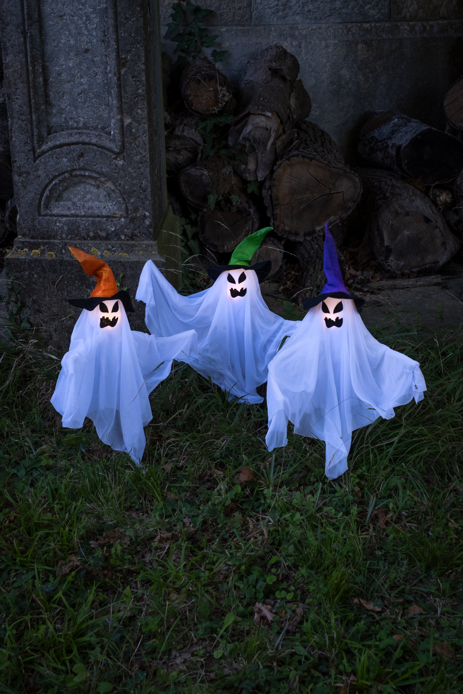 Ti trije duhovi na staveh s svojimi zračnimi oblikami privabljajo vse oči. Vsak lik nosi barvit koničasti klobuk in razkrije osvetljen obraz, saj čarobni učinek, ko pade zvečer, pade. Preprosta stiskalna stikala je dovolj, da njihove glave žarejo, kar ustvarja popolno vzdušje za vaše noč čarovnic. Poravnajte se po dovozu ali pred vrati za dobrodošlico, ki je tako zabavna, kot je zastrašujoča. Deluje na 3 aa baterijah (ni vključeno). Preprosta in učinkovita izbira za uspešno zunanjo dekoracijo.