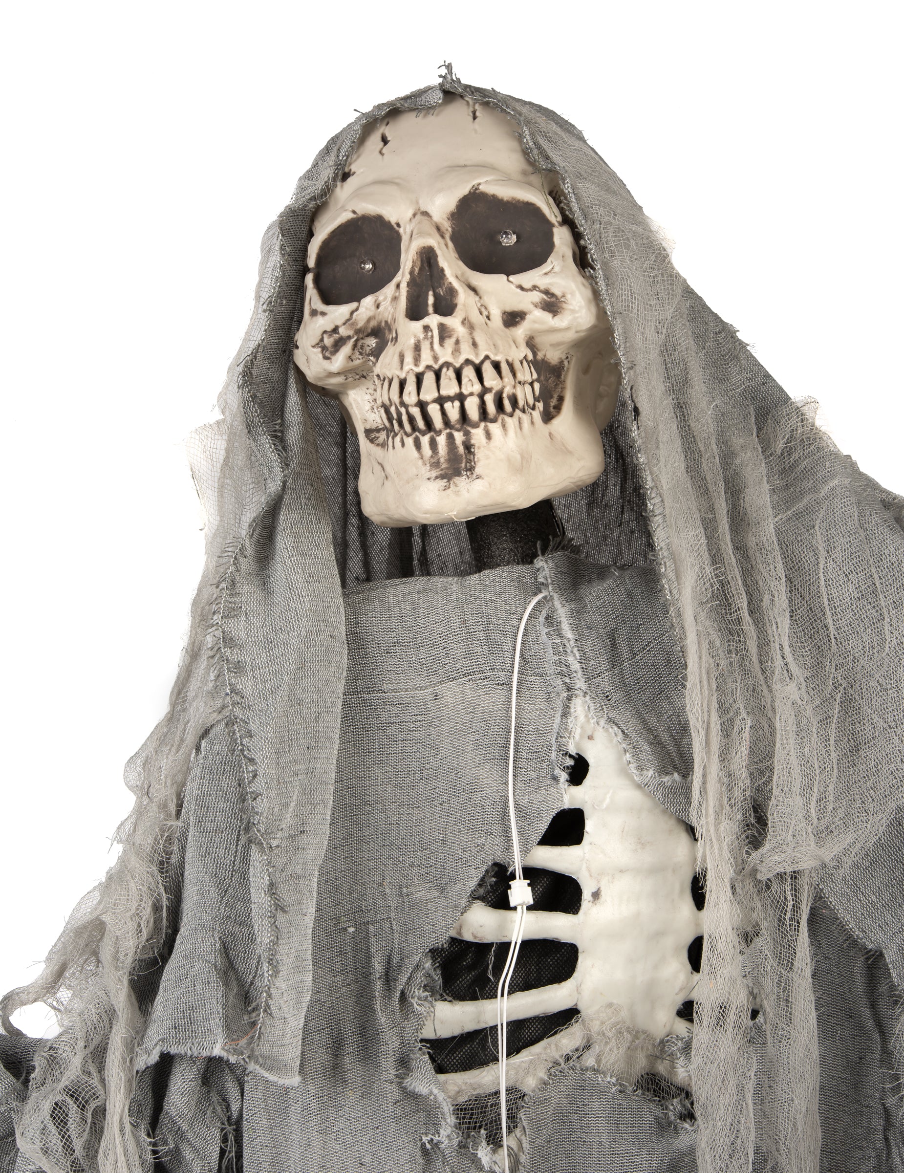 S svojimi 183 cm Visok in strašljiv lebdeči žanjec pritegne pozornost. Ogrnjen z raztrganimi sivimi tančicami in z impozantno črno koso v roki ustvarja iluzijo duha, ki lebdi v zraku in je pripravljen na udarec. Ob najmanjšem zvoku se njegova glava prebudi, rdeče oči se zasvetijo in izbruhne zlovešč krik. Aktivira se s stikalom, ki ga s preprostim pritiskom preklopi v stanje pripravljenosti. Dekoracija deluje na 3 AA baterije (priložene). Postavite jo v hodnik ali temen kot, da ustvarite osupljivo vzdušje vsakič, ko gre kdo mimo. (3 AA baterije priložene)