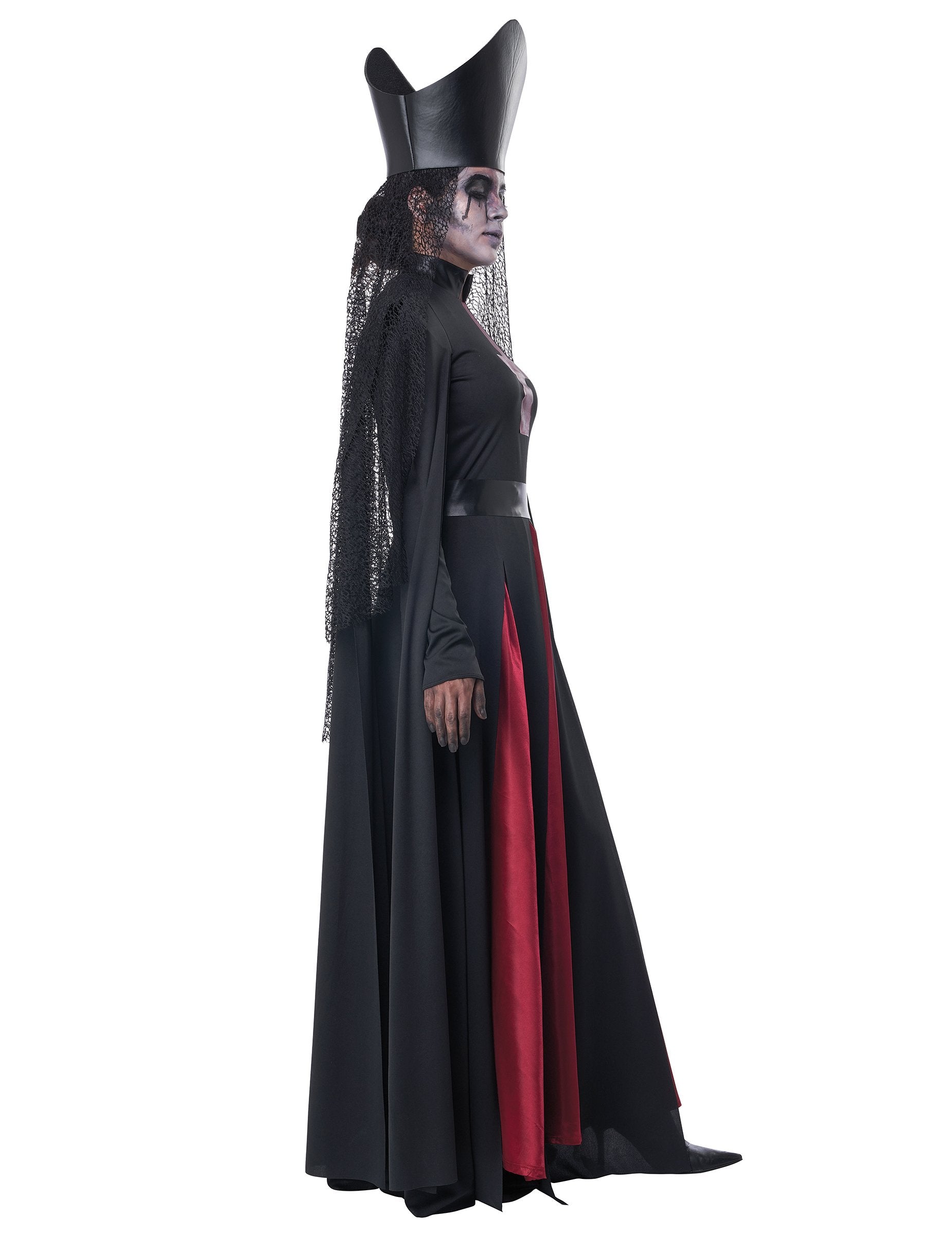 Ce déguisement mystique et inquiétant vous métamorphose en une prêtresse des ténèbres prête à accomplir ses rituels les plus mystérieux. Il comprend une robe noire longue ornée d’une imposante croix rouge sur le torse, avec des fentes révélant un tissu rouge intense, renforçant son aura ténébreuse. La robe est superposée à une jupe rouge foncé, ajustable grâce à une bande élastique, offrant confort et élégance. Une cape noire aux motifs occultes enveloppe la silhouette avec sophistication, tandis que le voile en dentelle ajoute une dimension dramatique et mystique. L’élément central du costume, la coiffe pontificale imposante, sublimée de symboles ésotériques, apporte une prestance captivante. Une ceinture noire complète harmonieusement l’ensemble. Parfait pour Halloween, une soirée à thème démoniaque ou un cosplay sombre, ce costume de prêtresse occulte est idéal pour incarner un personnage à la fois fascinant et redoutable. Associez-le à un maquillage intense et quelques accessoires ésotériques pour un effet encore plus saisissant et mémorable !