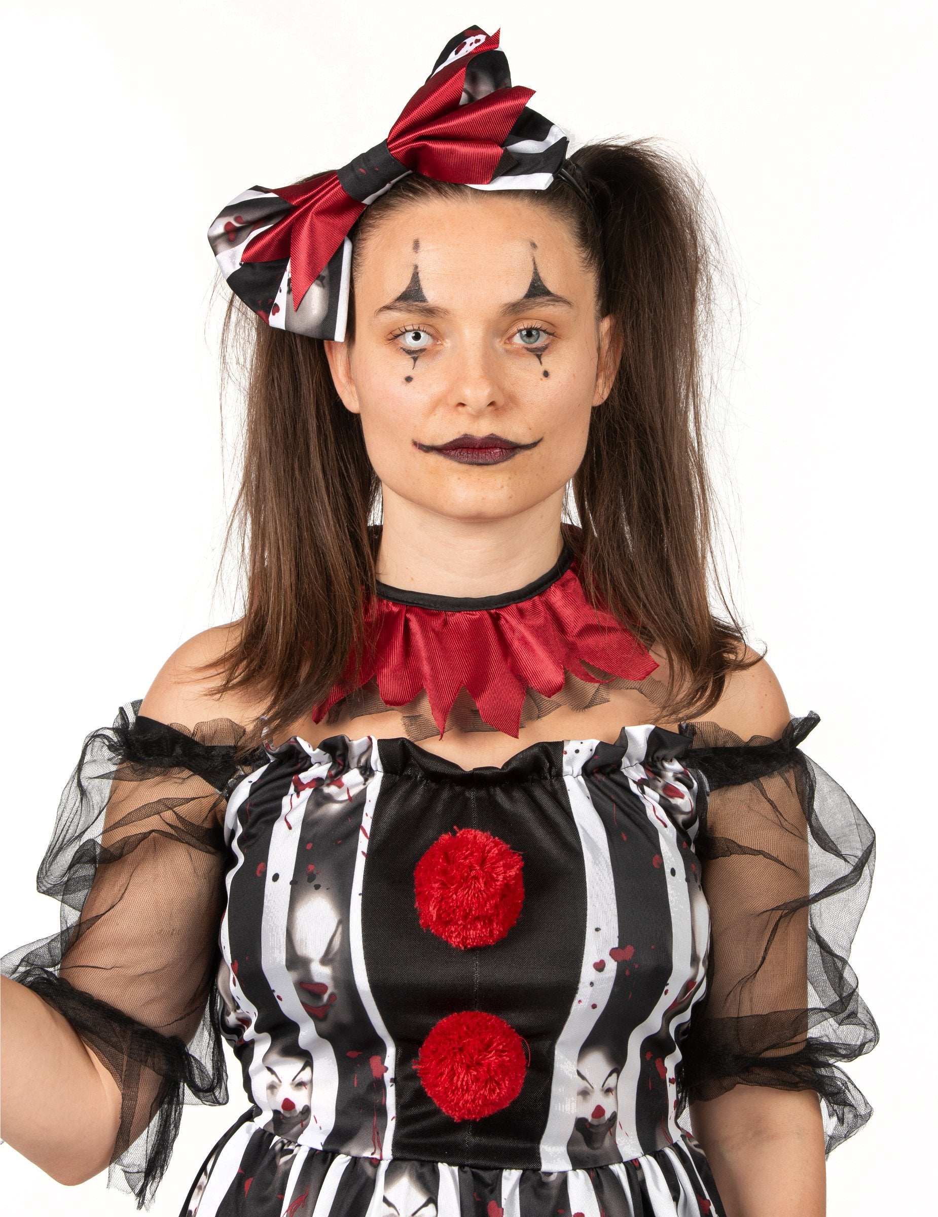 Ta nora klovn kostum za ženske v luksuzni različici vključuje obleko, ovratnik, spodnji del in trak za premca. Kratka, vgrajena obleka, okrašena s črno -belimi črtami in motečimi klovnovskimi motivi, poudarjajo črni rokavi iz tila, ki dodajo pridih elegance. Rdeči pompomi na poprsju spominjajo na tradicionalni slog klovn. Ustrezni ovratnik elegantno poudarja vrat, medtem ko petticoat olajša obleko za zastrašujoč učinek. Trad za glavo s svojim velikim lokom prinaša končni pridih norosti v ta strašljiv kostum. Idealna izbira za noč čarovnic, domišljijsko obleko ali za posejanje terorja z nočnim pogledom klovn!