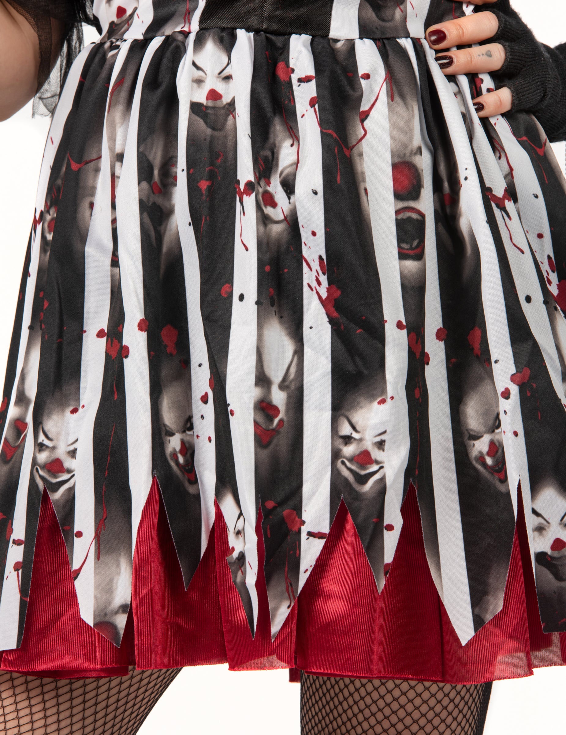 Kratka, oprijeta obleka, okrašena s črno-belimi črtami in motečimi klovnovskimi motivi, je poudarjena s črnimi til rokavi, ki ji dodajo pridih elegance. Rdeči rese na stezniku spominjajo na tradicionalni slog klovn.