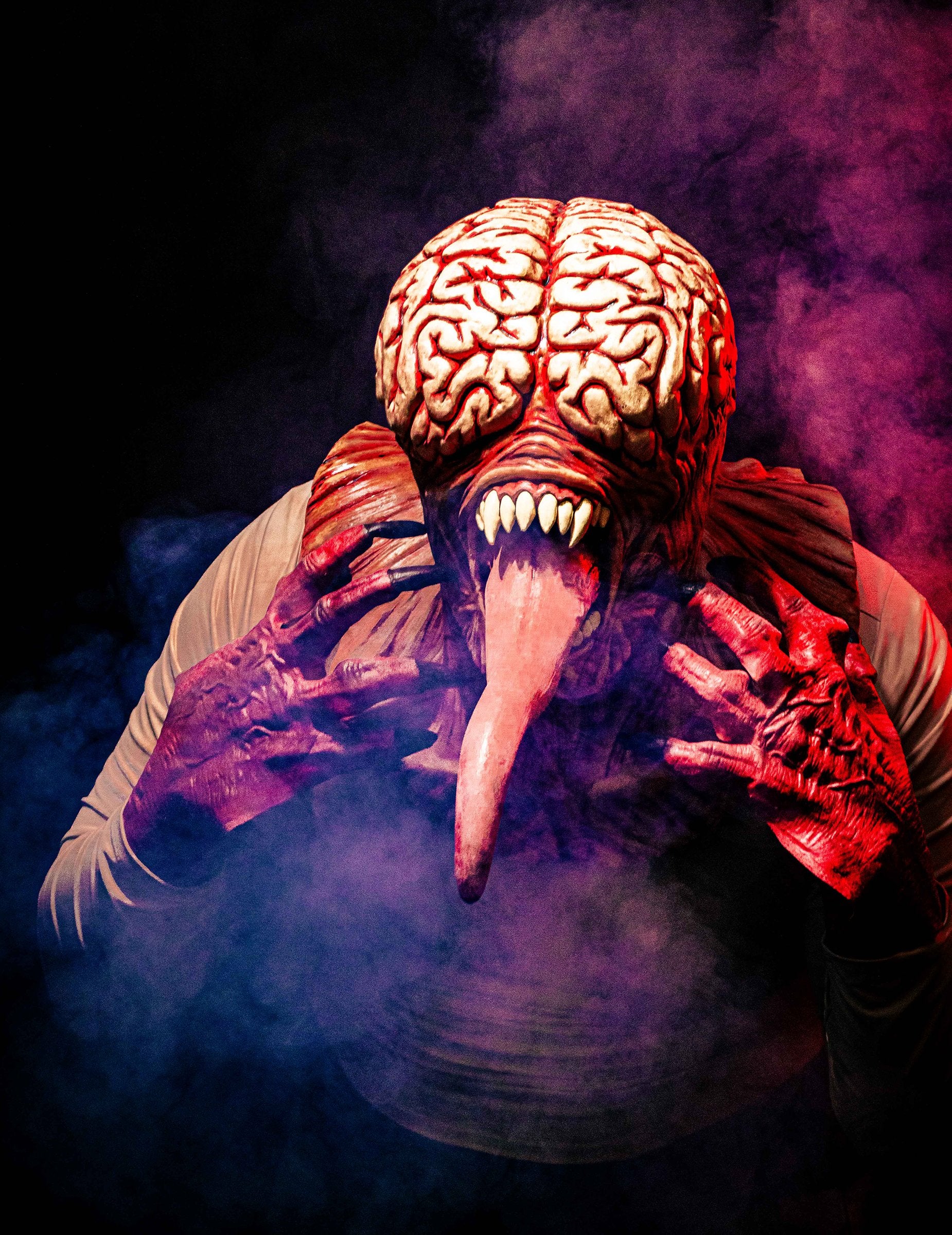 Ta maska s polnim obrazom vas spremeni v grozljivo pošast z navideznimi možgani. S svojo tesno, žilavo kožo, zasukanimi usti z ostrimi zobmi in dolgim viskoznim jezikom se zdi naravnost iz neuspelega eksperimenta ali peklenskega sveta. Njegova odprta lobanja, ki razkriva podrobne možgane, z oteklimi žilami in rdečimi odtenki, krepi njegov zastrašujoč videz. Realistična tekstura in skrbna dodelava dajeta vtis surovega mesa, zaradi česar je ta ultra realistična maska še bolj hladna. Ta grozljiva maska je popolnoma pokrivala glavo in zgornji trup, idealna za noč čarovnic, grozljivo zabavo ali tematski dogodek. Z njim igrajte kot gnusoba, ki izhaja iz globine groze!