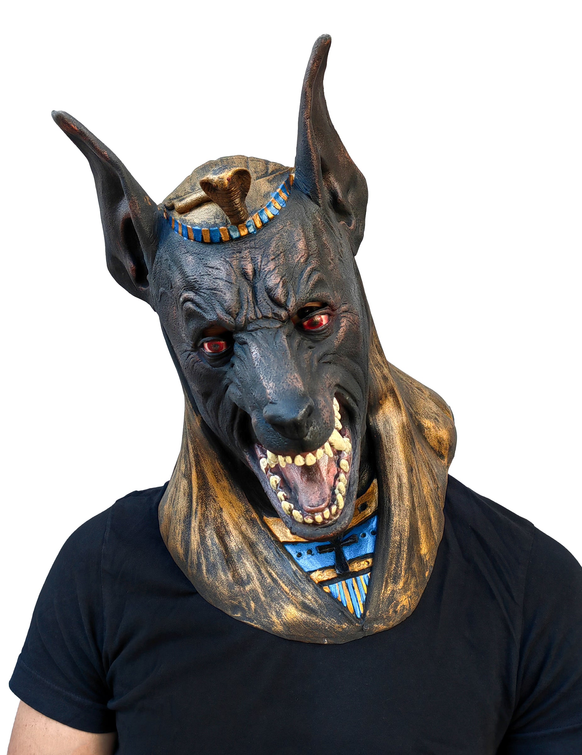 Ce masque intégral en latex vous transforme en Anubis, le célèbre dieu à tête de chacal de l’Égypte ancienne. Avec son regard rouge perçant, sa peau sombre et ridée, et sa gueule grande ouverte laissant apparaître des crocs acérés, il inspire la crainte. Sur son front, un diadème doré orné d’un cobra royal renforce son apparence divine. Sa large collerette dorée entoure le cou et les épaules pour un effet imposant et réaliste. Ce masque impressionnant, qui couvre toute la tête et le haut du torse, est parfait pour une soirée à thème, un événement mythologique ou Halloween. Avec lui, incarnez une figure légendaire et semez la terreur sur votre passage !