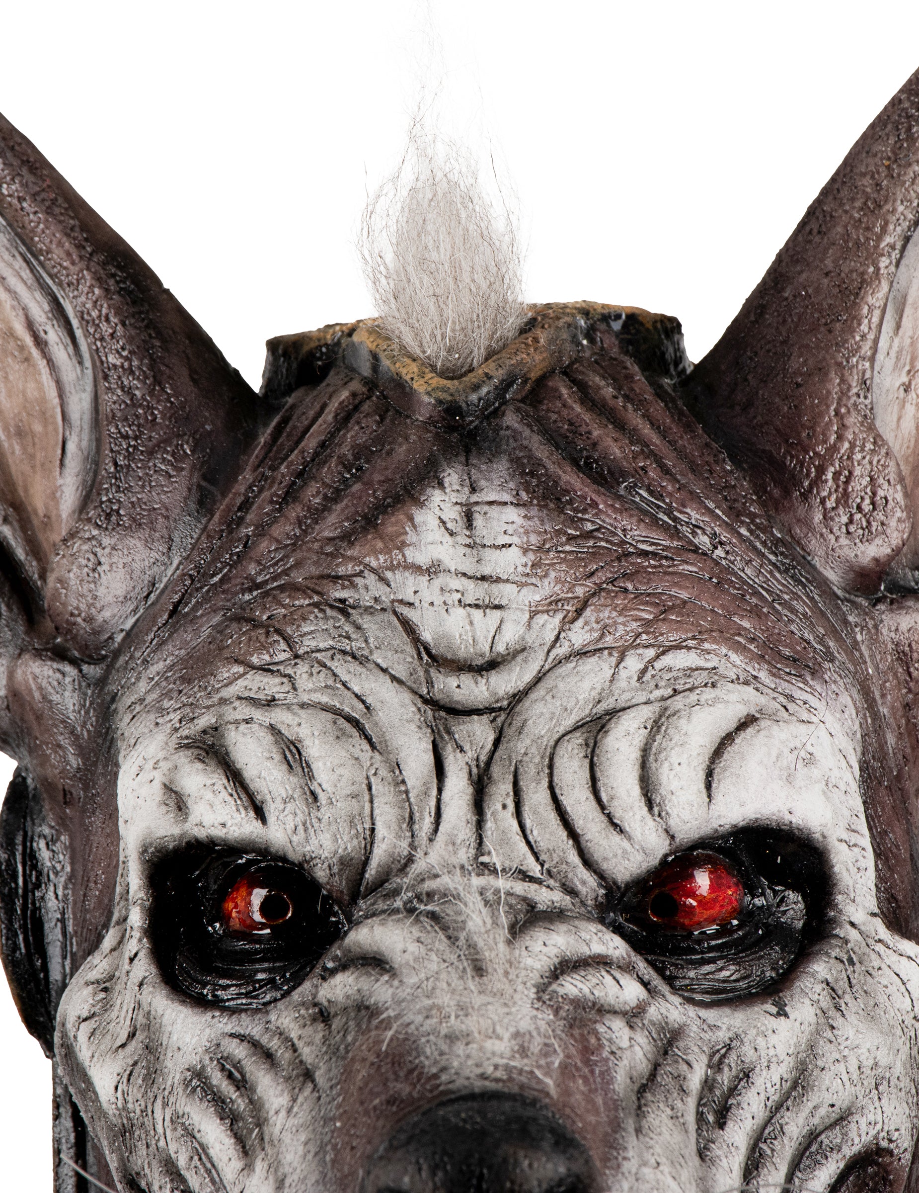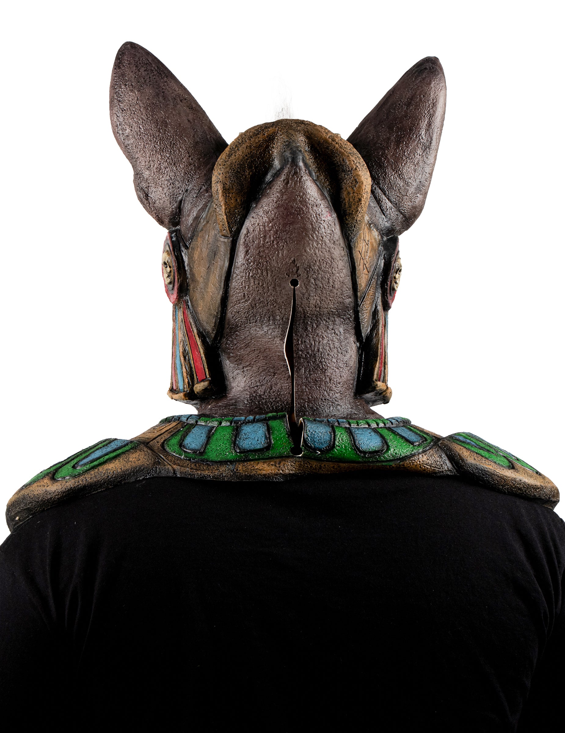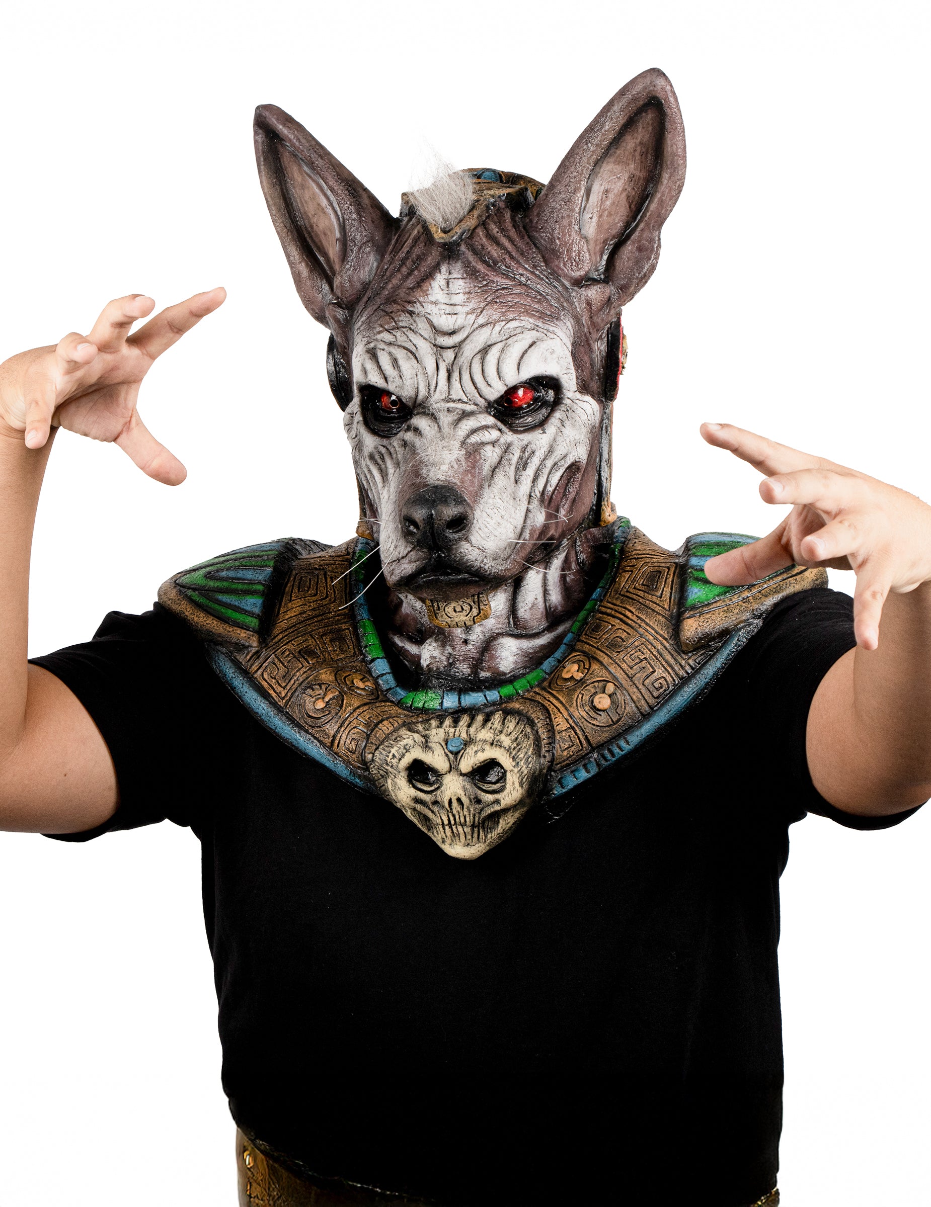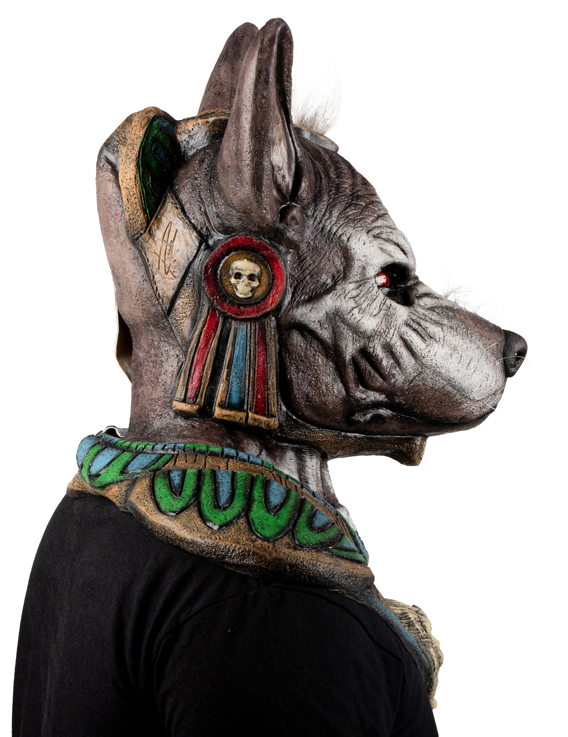 Ta polna maska vas spremeni v strašljivo bitje s pasjo glavo, navdihnjeno z staro Egipt. S svojim prodornim rdečim pogledom, gobcem, zaznamovanim z brazgotinami, in velikimi pokončnimi ušesi izžareva zloveščo prisotnost.