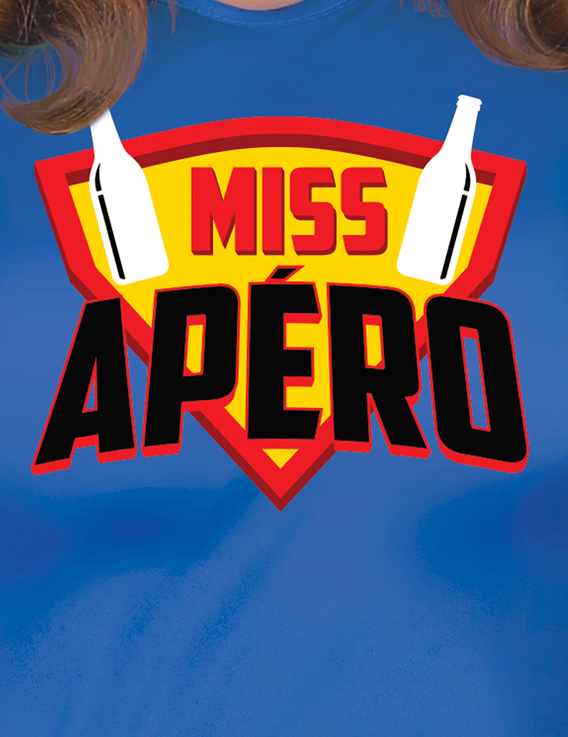 To Kostum gospodične Apéro Ženski komplet vključuje svetlo oprijeto obleko, rdečo pelerino, rumen pas in priročen držalo za skodelice, da boste imeli pijačo pri roki.