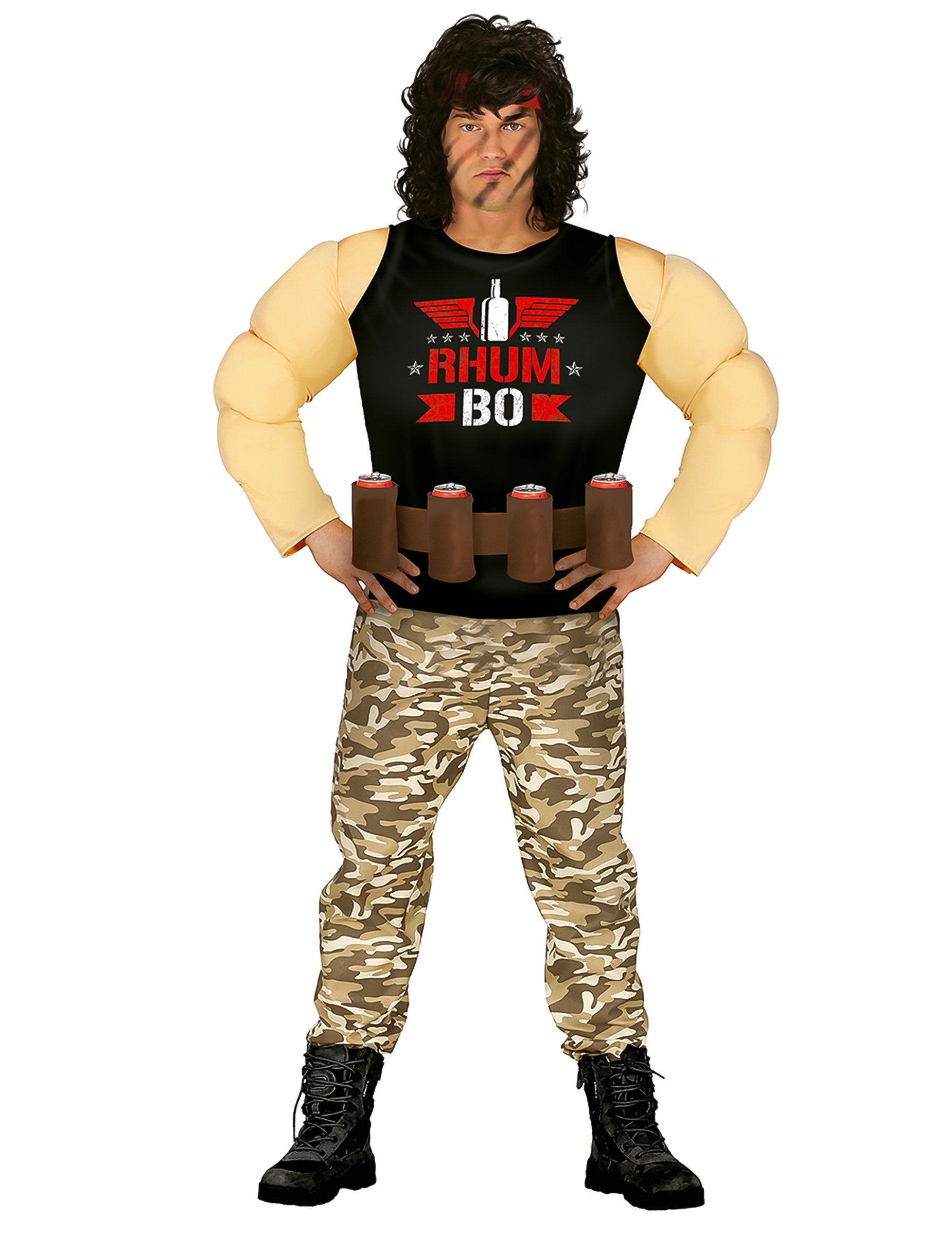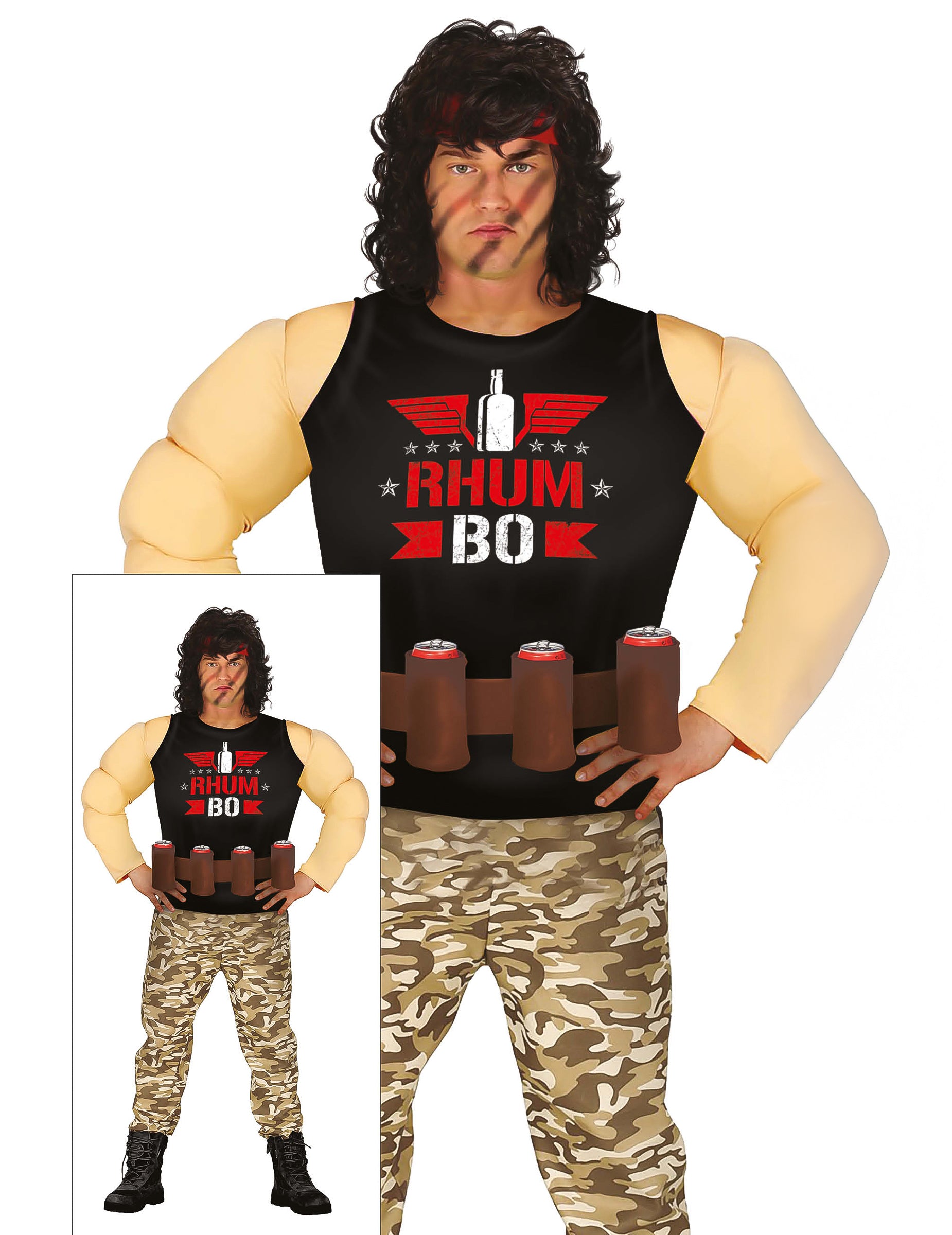 Ta prikrivanje stroškov za odrasle je sestavljeno iz črnega vrha z oblazinjenimi mišicami, kamuflažnimi hlačami in nosilnim pasom, da lahko vaše pijače pri roki. Ta kostum je s svojim zabavnim napisom "Rum Bo" in oblikovanjem navdihnjen z akcijskimi filmi kot nalašč za utelešenje pravega bojevnika ... bara! Pas v stilu kartuše doda originalni in osupljiv dotik. Idealna za zabavo, ta preobleka zagotavlja eksplozivno in praznično vzdušje!