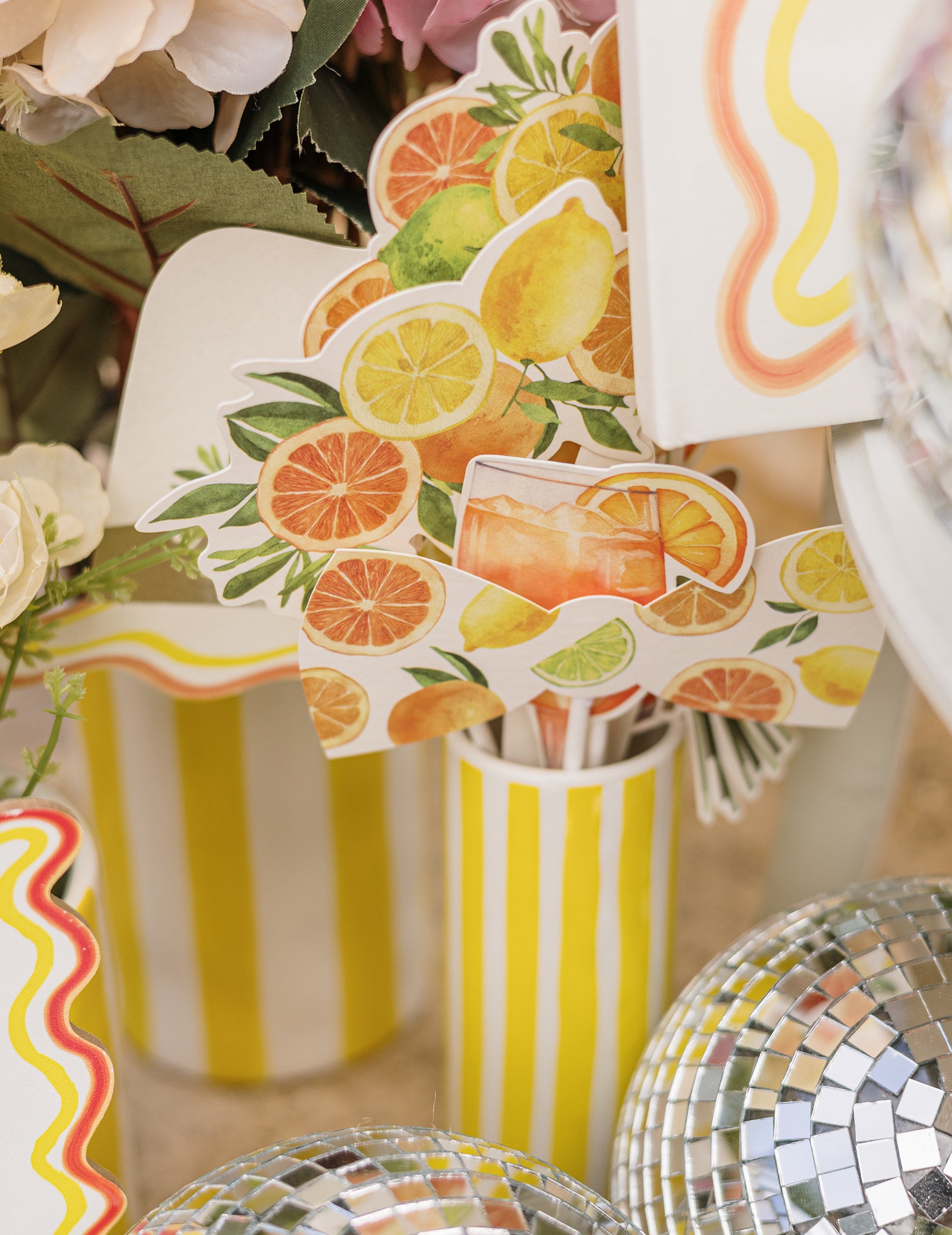 Komplet za fotokabino Fizz Citrus s kremnim, oranžnim in zlatim papirjem ter prazničnimi dodatki