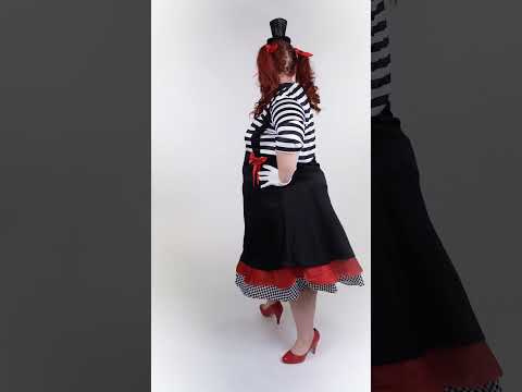 Ta pustna kostumska oprava mime v večji velikosti za ženske vsebuje črno-rdečo obleko in ujemajočo se metuljčico.
