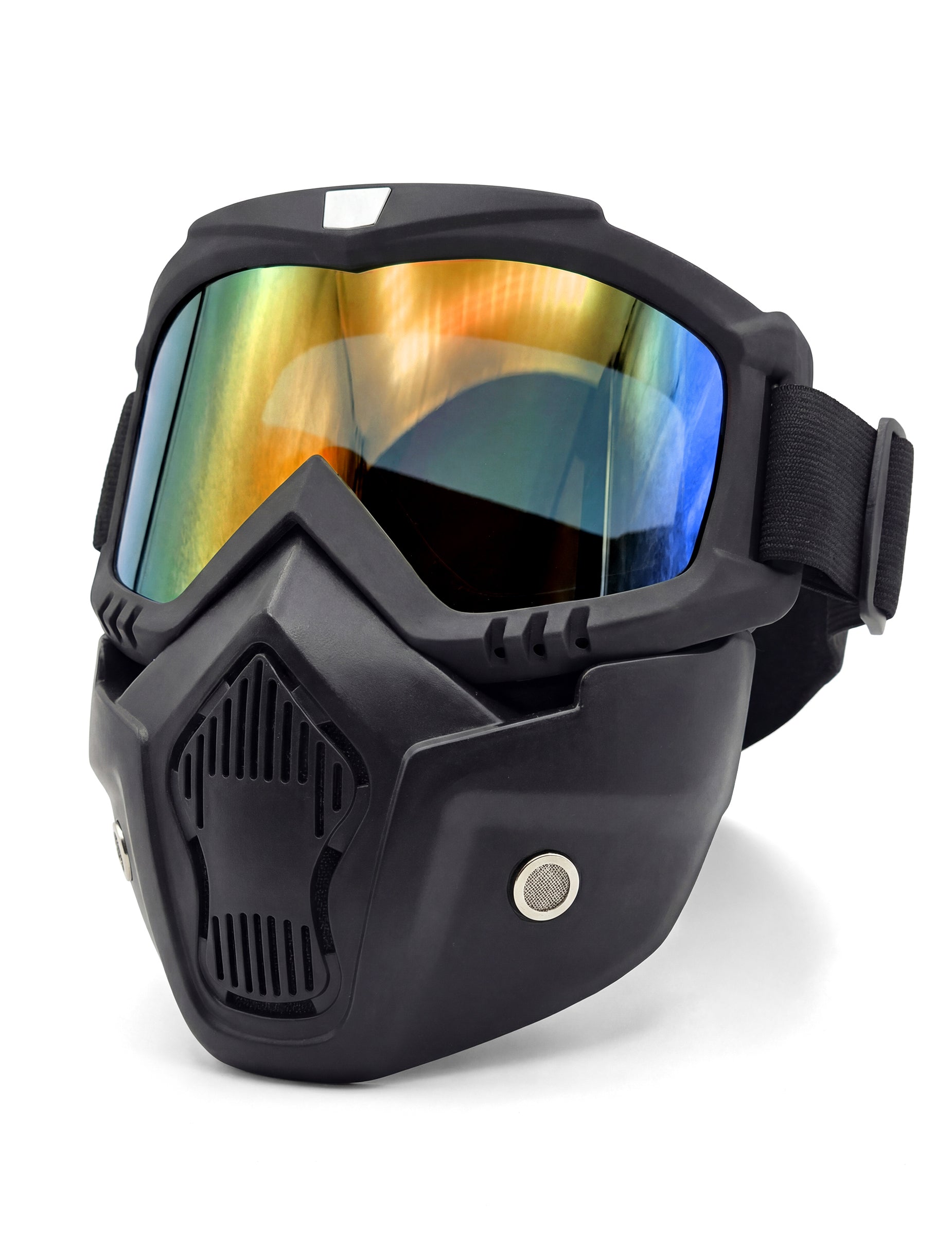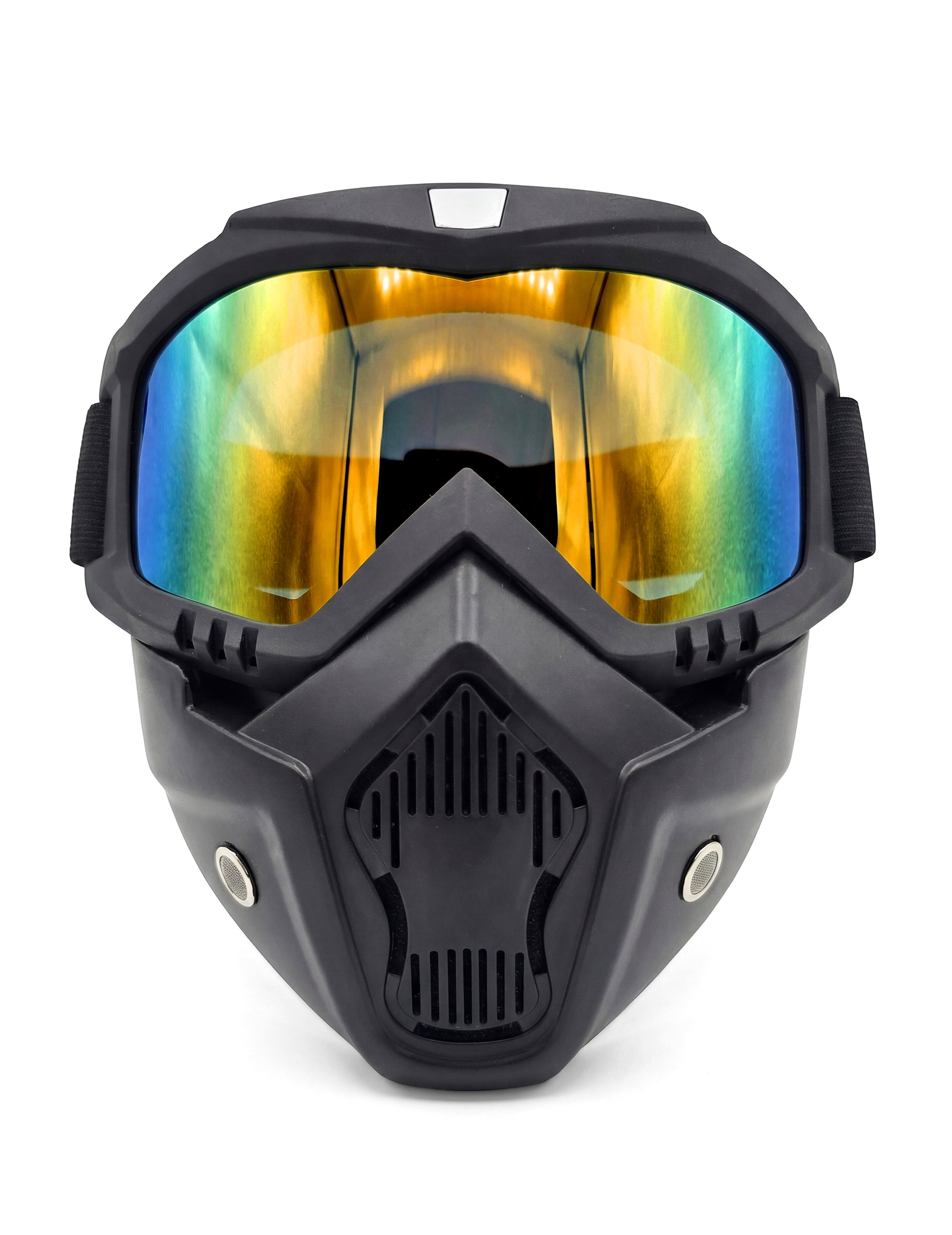 Maska je izdelana iz črne plastike in ima del, podoben očalom, z mavrično odsevnimi lečami, kar ustvarja vizualni učinek, ki se spreminja glede na svetlobo. Okrogla oblika pokriva spodnji del obraza in predel okoli oči, toga struktura pa je kombinirana s širokim elastičnim trakom na zadnji strani, ki drži masko na mestu. Notranjost ima vidno penasto oblazinjenje okoli robov za varno prileganje obrazu.