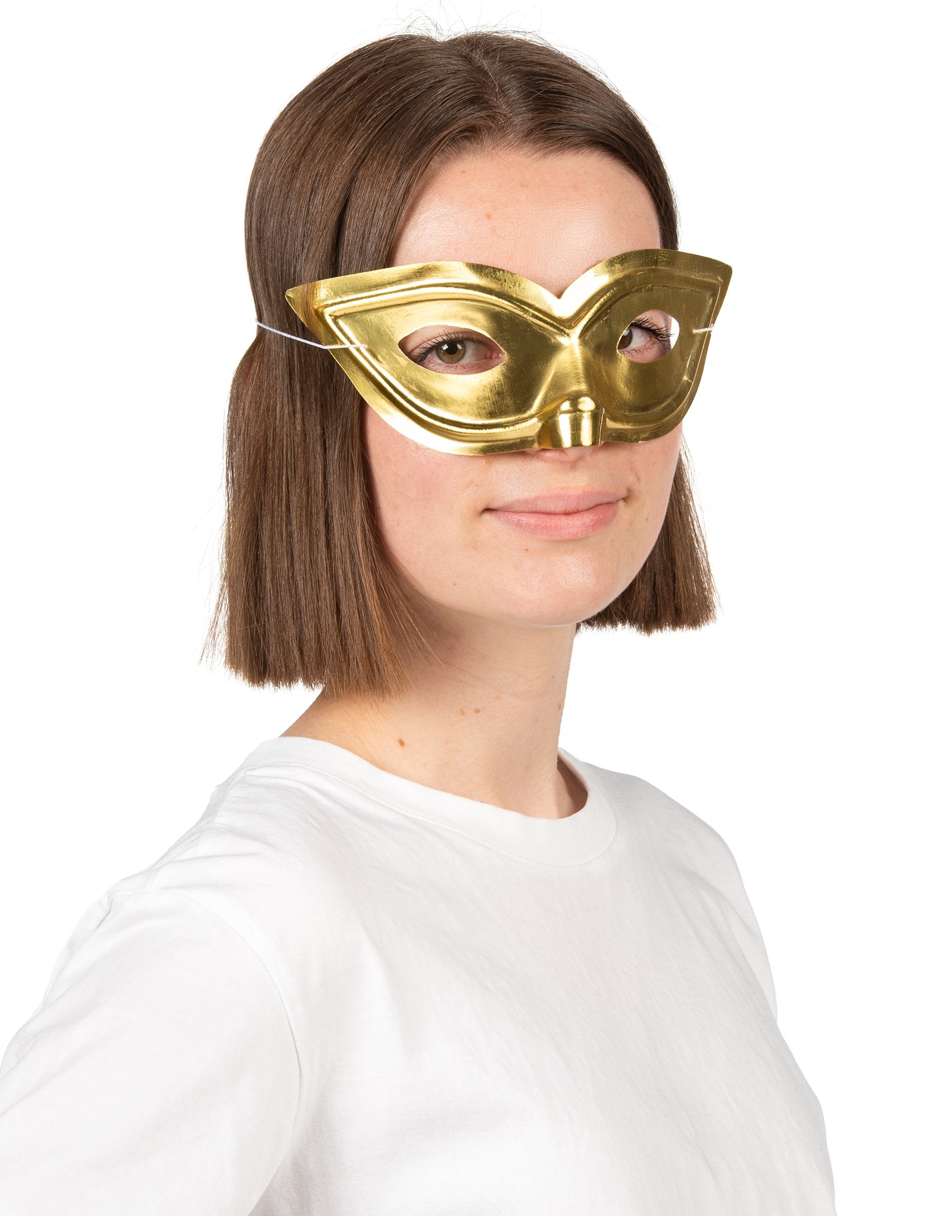 Ta bleščeča zlata maska za odrasle je izdelana iz tanke plastike s kovinskim zaključkom za svetleč in eleganten učinek. Njena elegantna oblika se prilega konturam obraza in se enostavno zapne z diskretno elastiko, kar zagotavlja udobno prileganje ves večer. Popoln dodatek, ki dopolni kostum za ples v maskah, karneval ali kostumsko zabavo, hkrati pa vašemu videzu doda bleščeč zlati pridih.