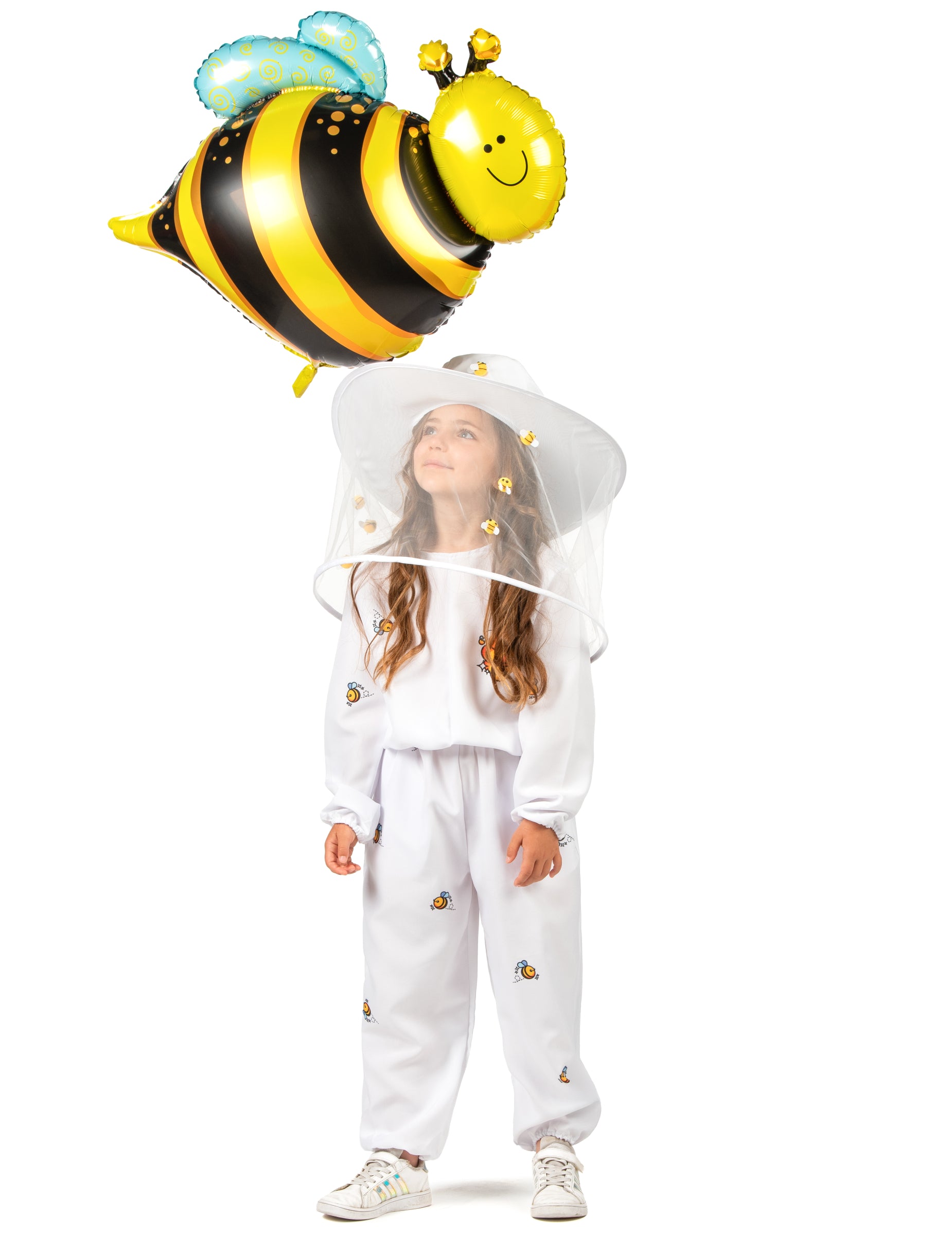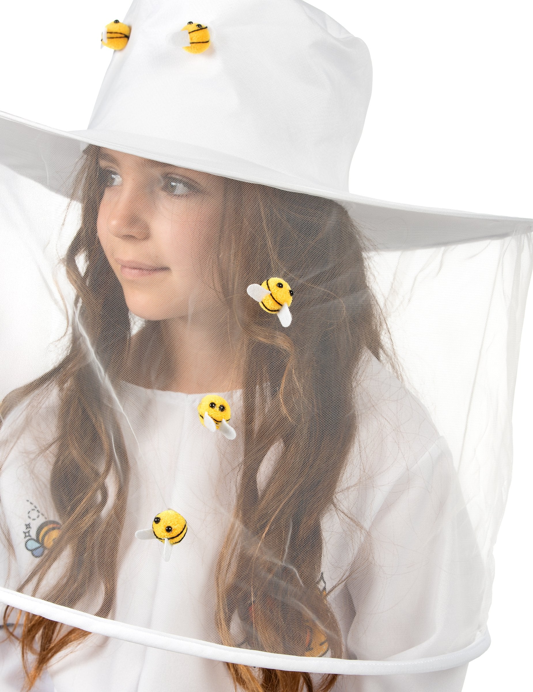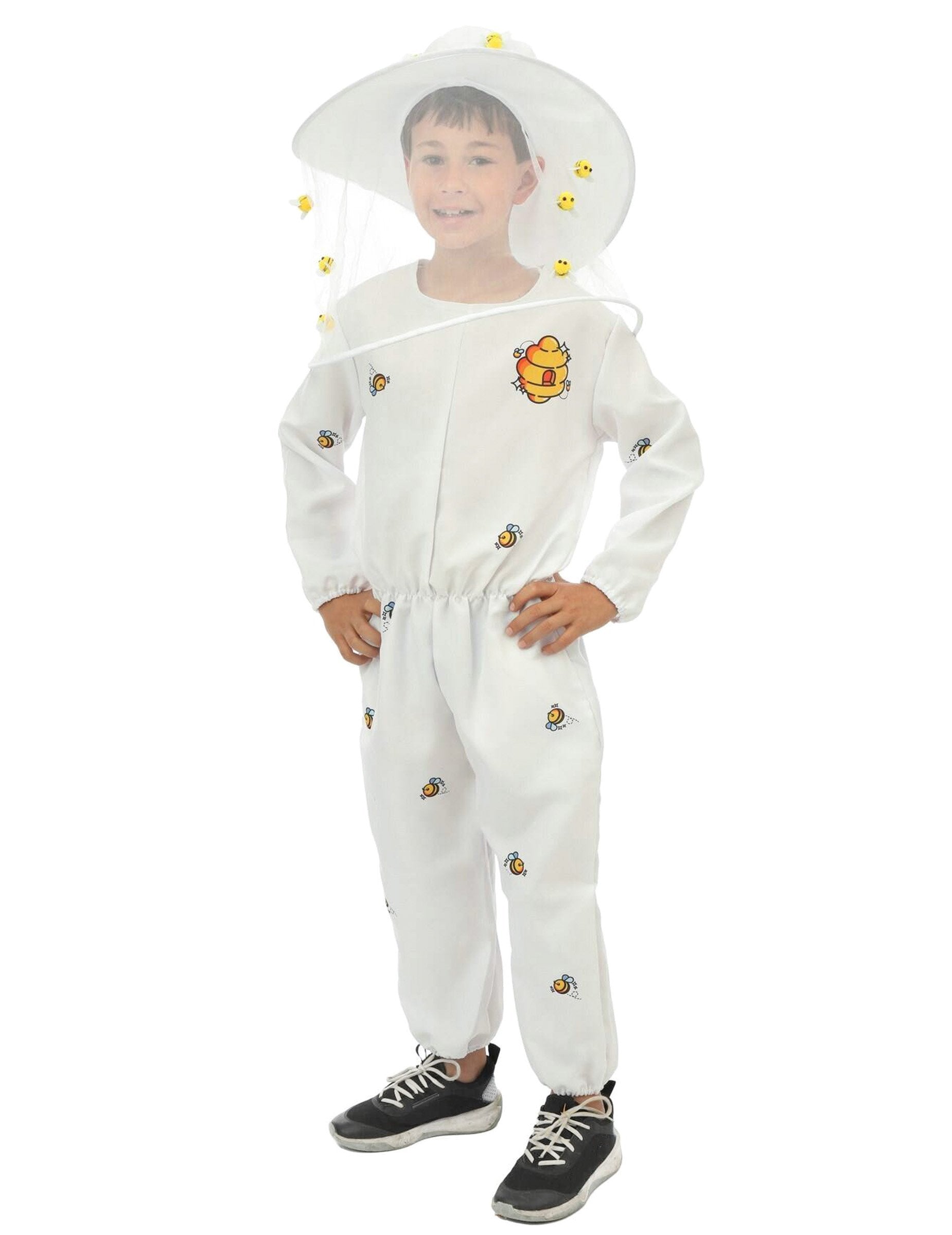 Ce déguisement d’apiculteur pour enfant se compose d’un chapeau avec voile et d’une combinaison blanche assortie pour un look fidèle aux vrais gardiens des ruches. Le chapeau à large bord est recouvert d’un voile en tulle transparent, orné de petites abeilles en tissu pour un rendu amusant et réaliste. La combinaison à manches longues, élastiquée à la taille, aux poignets et aux chevilles, est décorée de motifs d’abeilles et d’une ruche sur la poitrine. Un costume original et éducatif, parfait pour un Carnaval, un spectacle scolaire ou une fête à thème nature.