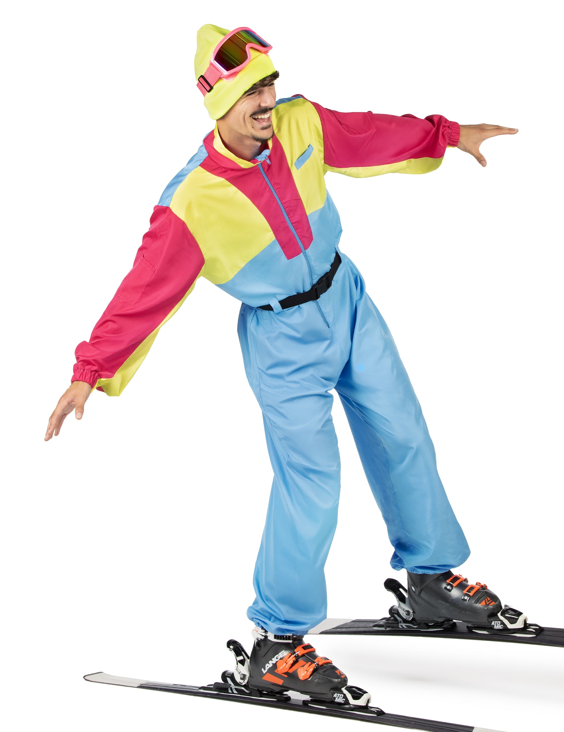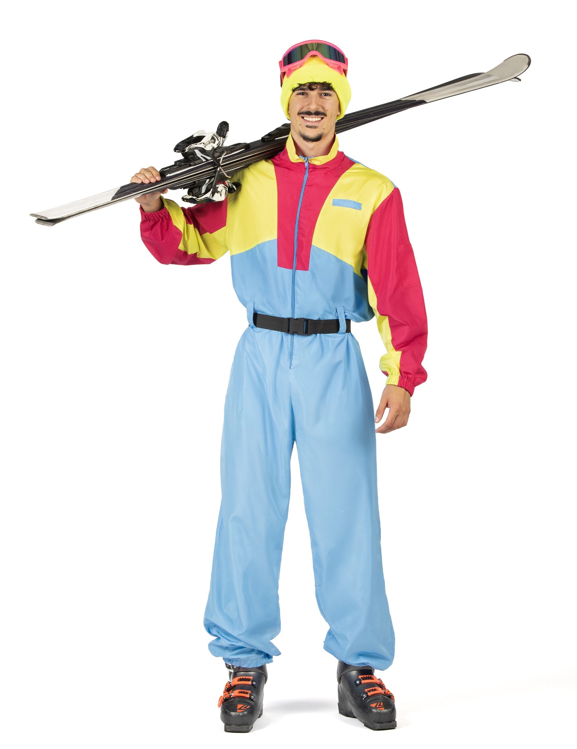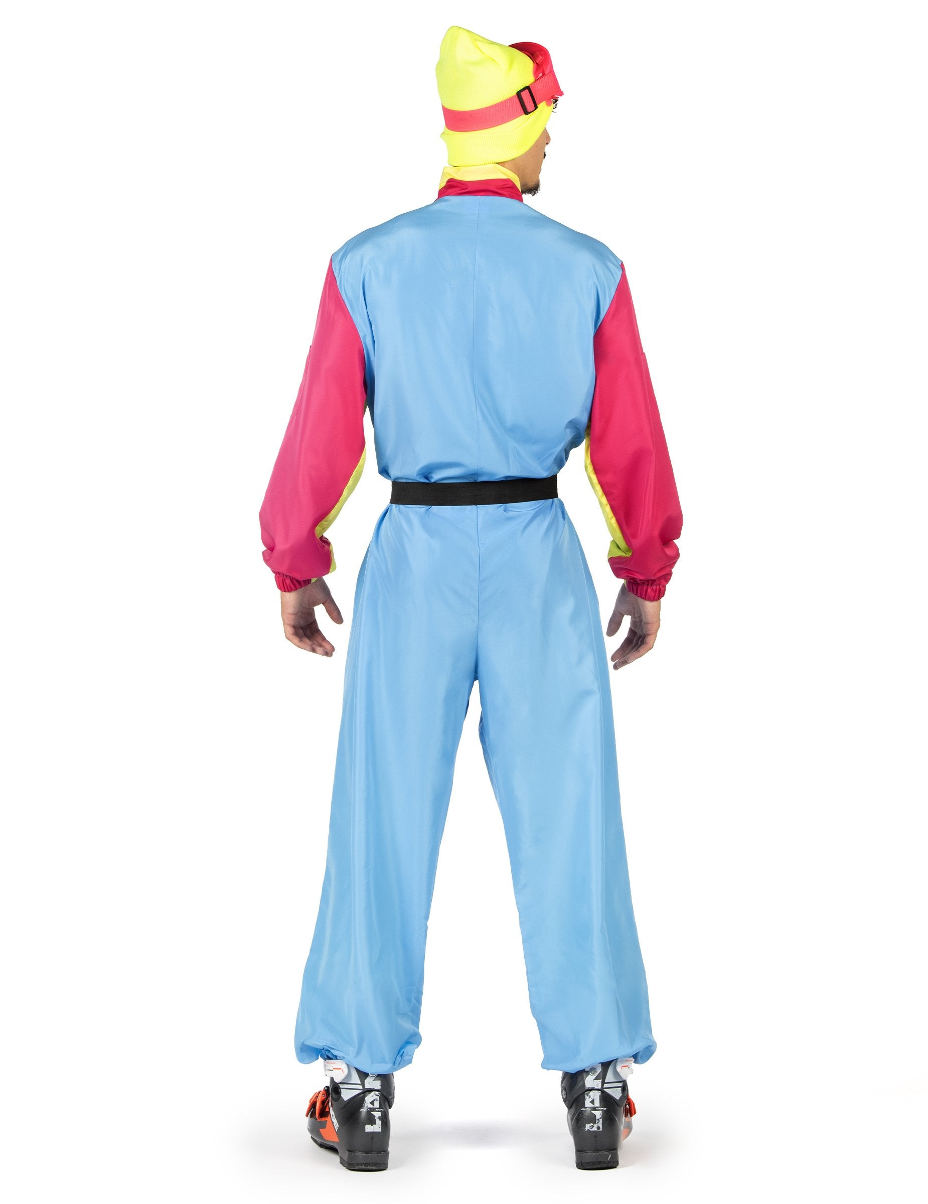 Ta vintage moška smučarska kombinezon te popelje v svet retro smučarskih počitnic. S svojimi barvnimi bloki pastelno modre, sončno rumene in češnjevo rdeče prikliče nora leta zimskih radosti.