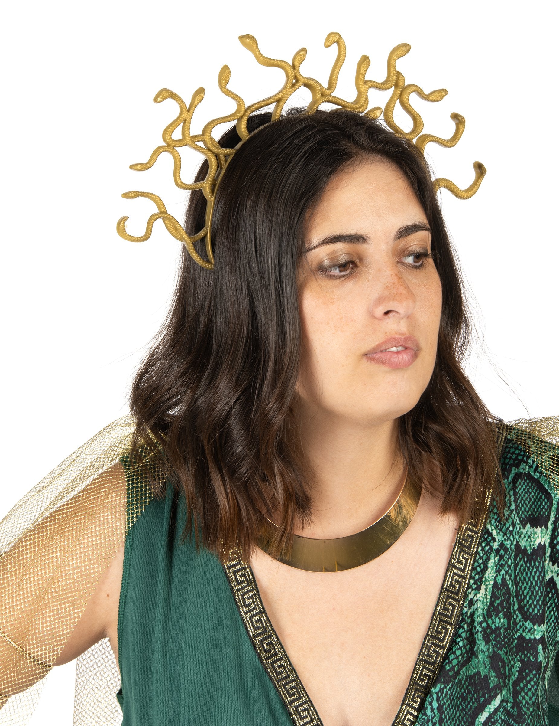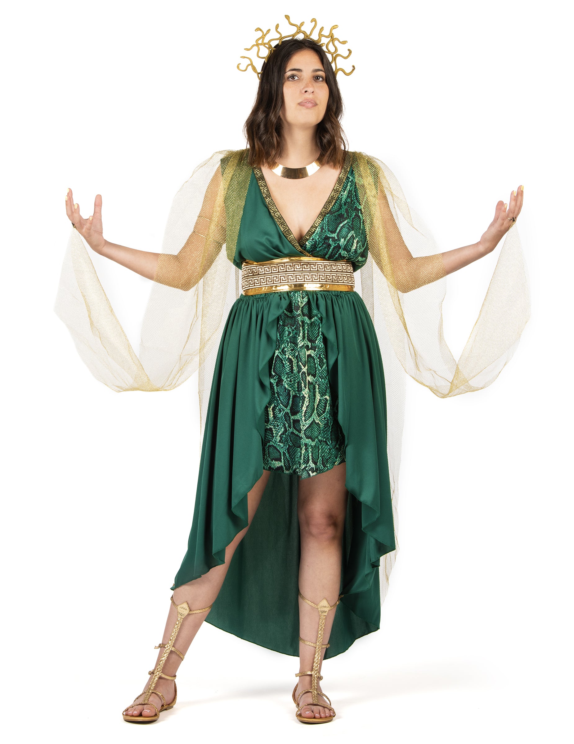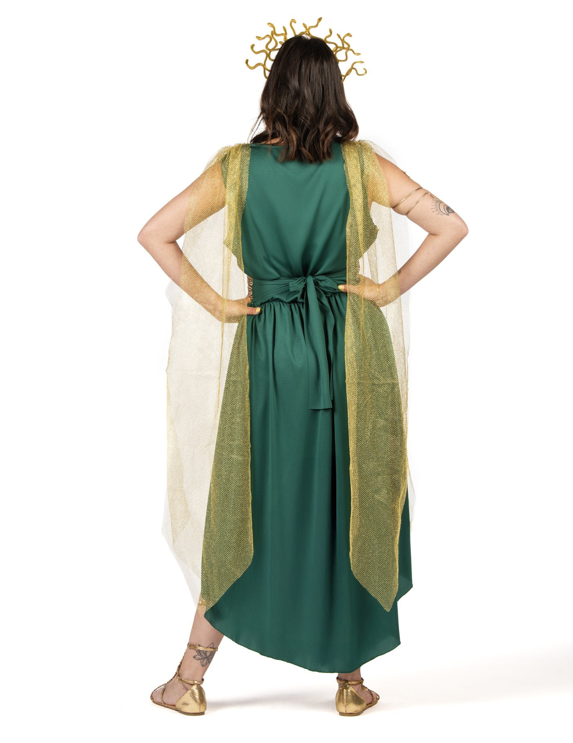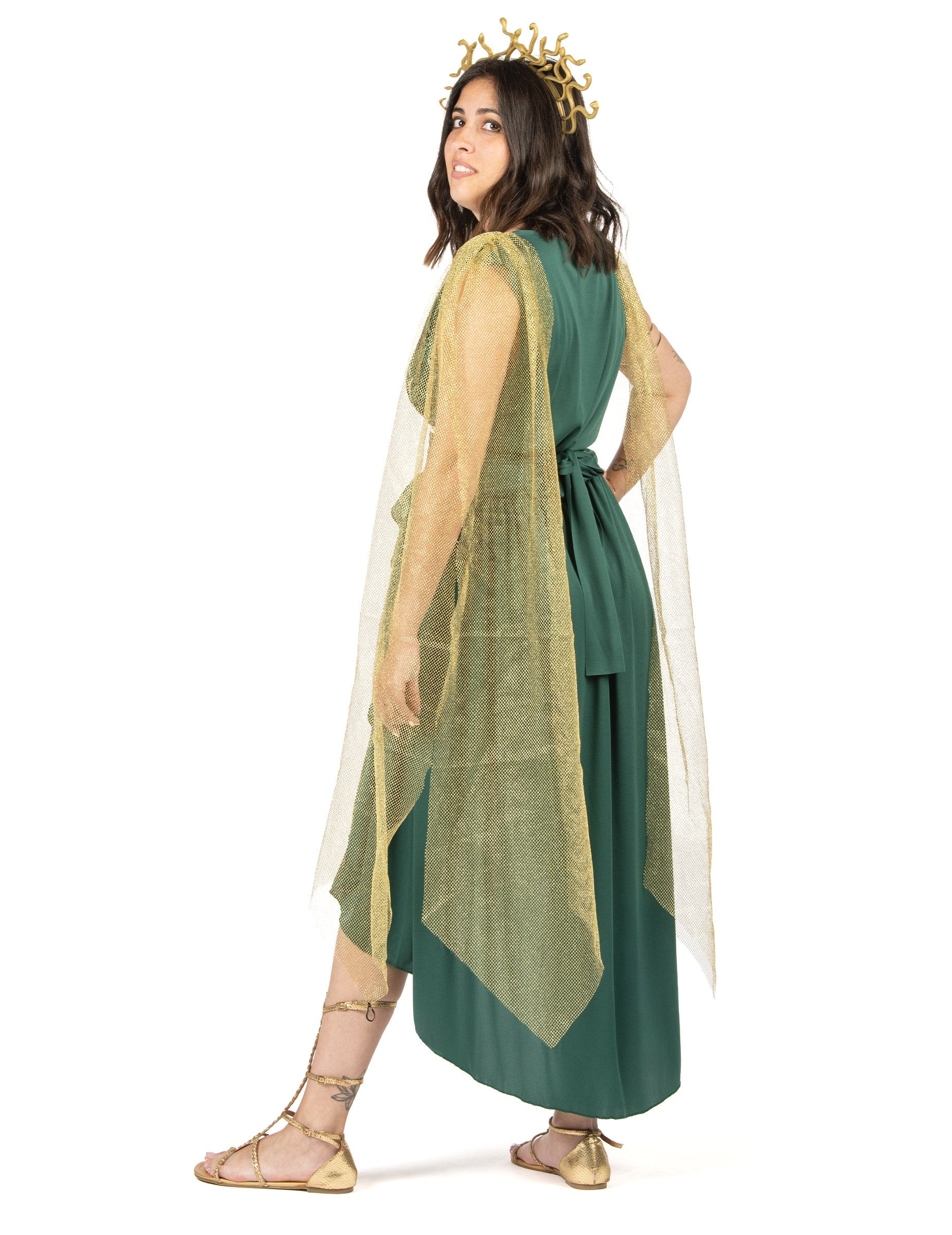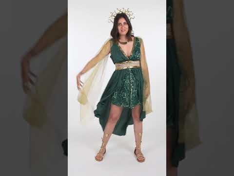 To Kostum boginje Meduze Ženska kolekcija vključuje padajočo zeleno obleko z drapiranim učinkom, ki jo poudari sprednji del s kačjim potiskom. Zlati pas z vzorcem grškega ključa poudarja pas, zlata ogrinjala iz tila pa nežno pada čez ramena.