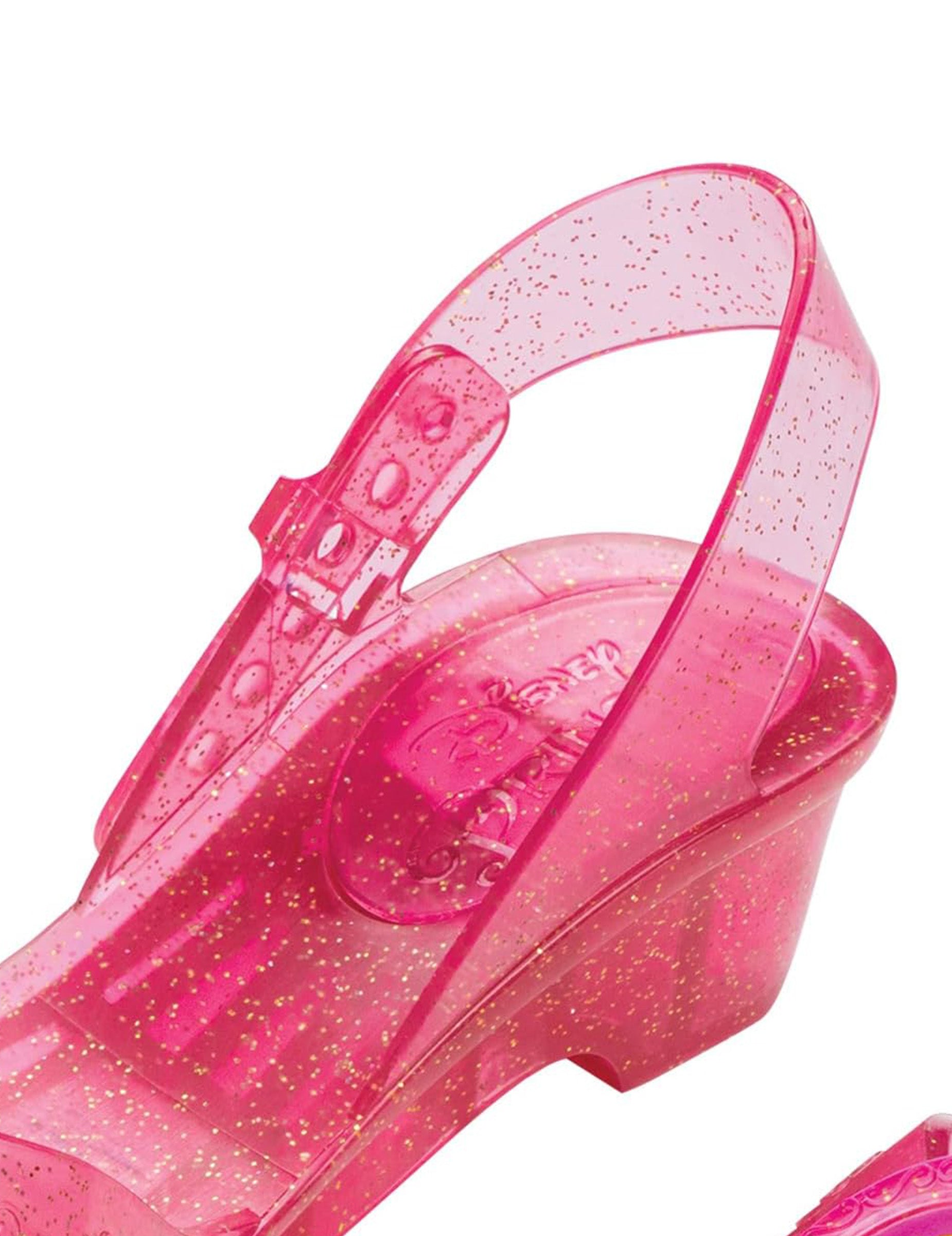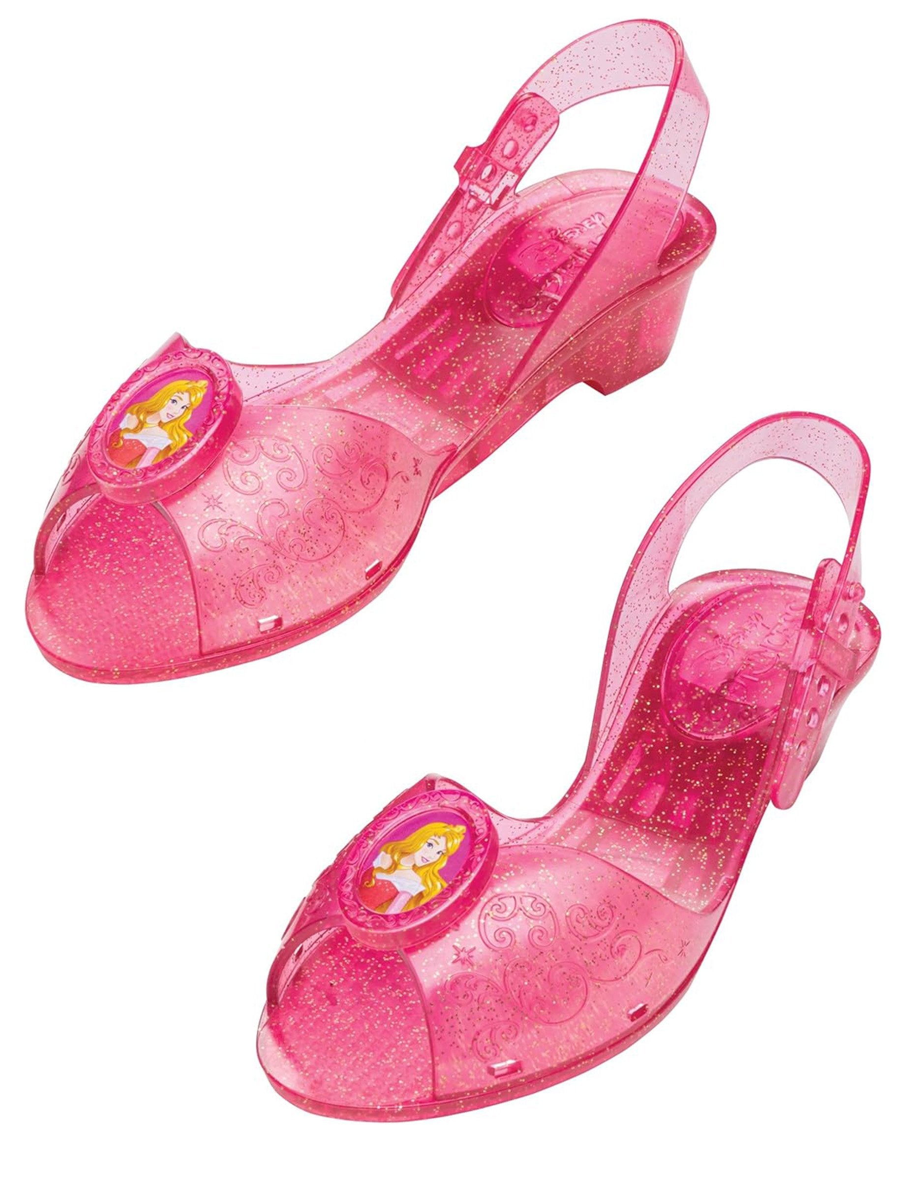 Ti uradno licencirani otroški spalni lepotični čevlji merijo približno 18 cm. V bleščeči prosojni roza barvi so okrašeni z medaljonom, ki nosi podobo Aurore na vrhu, za čarobni učinek. Oblikovanje odprtega dela spominja na pravljične čevlje. Z majhno peto in nastavljivim jermenom na zadnji strani nudijo dobro podporo, hkrati pa odlično dopolnjujejo princesovo obleko. Kot nalašč za spremljanje kraljevega kostuma za rojstni dan, karneval ali očarano žogo.