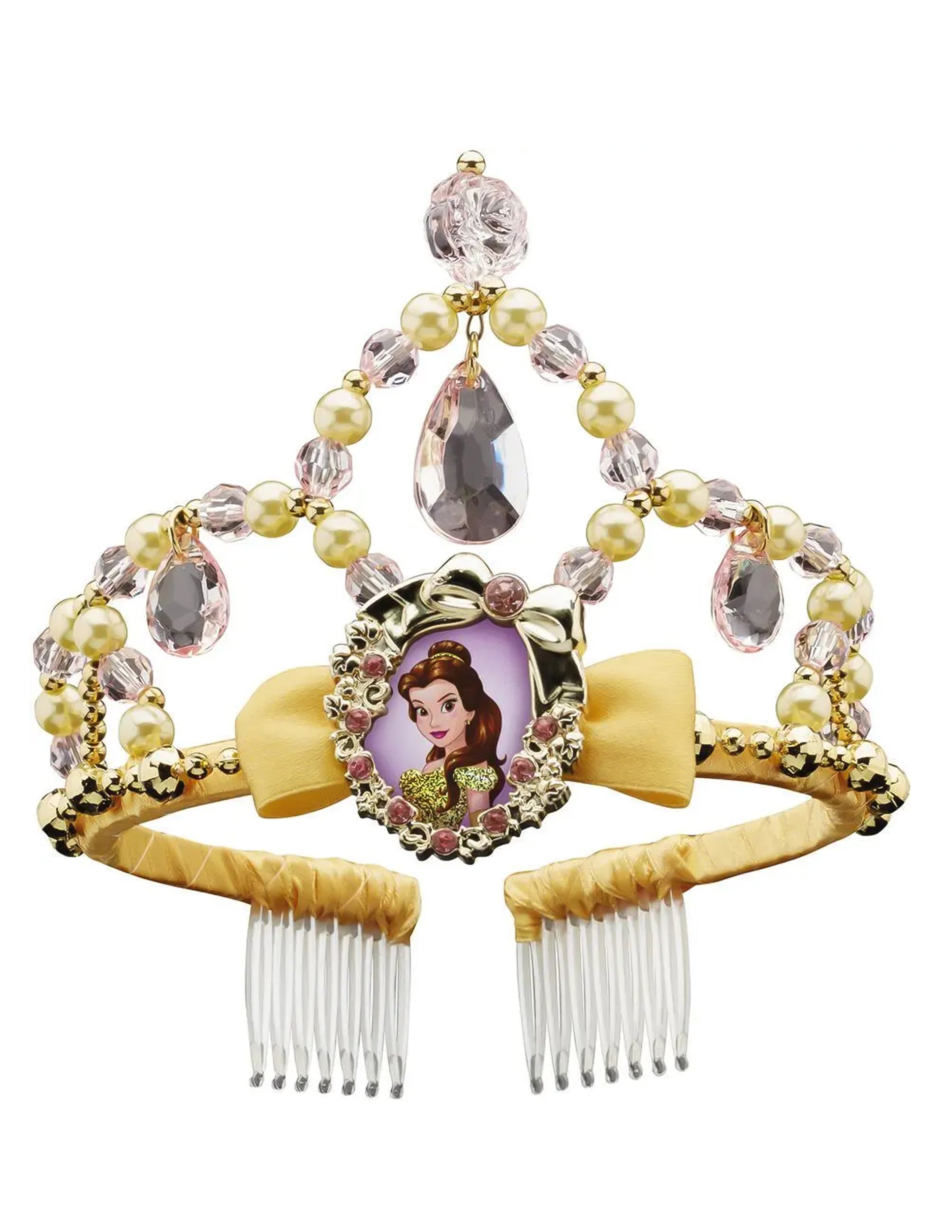 Ta tiara, navdihnjena z Belle, je kot nalašč za otroke, ki imajo radi očarane zgodbe. Okrašena je z medaljonom na podobi Belle, obdana z rumenimi in roza biseri in ustreznim satenastim trakom. Na vrhu sedi majhna zlata krona, da okrepi kraljevski videz. Integrirani glavniki zagotavljajo dobro podporo med igrami ali zabavami. Idealen dodatek, da se spremenite v princeso, bodisi za rojstni dan, karneval ali čarobni dan.