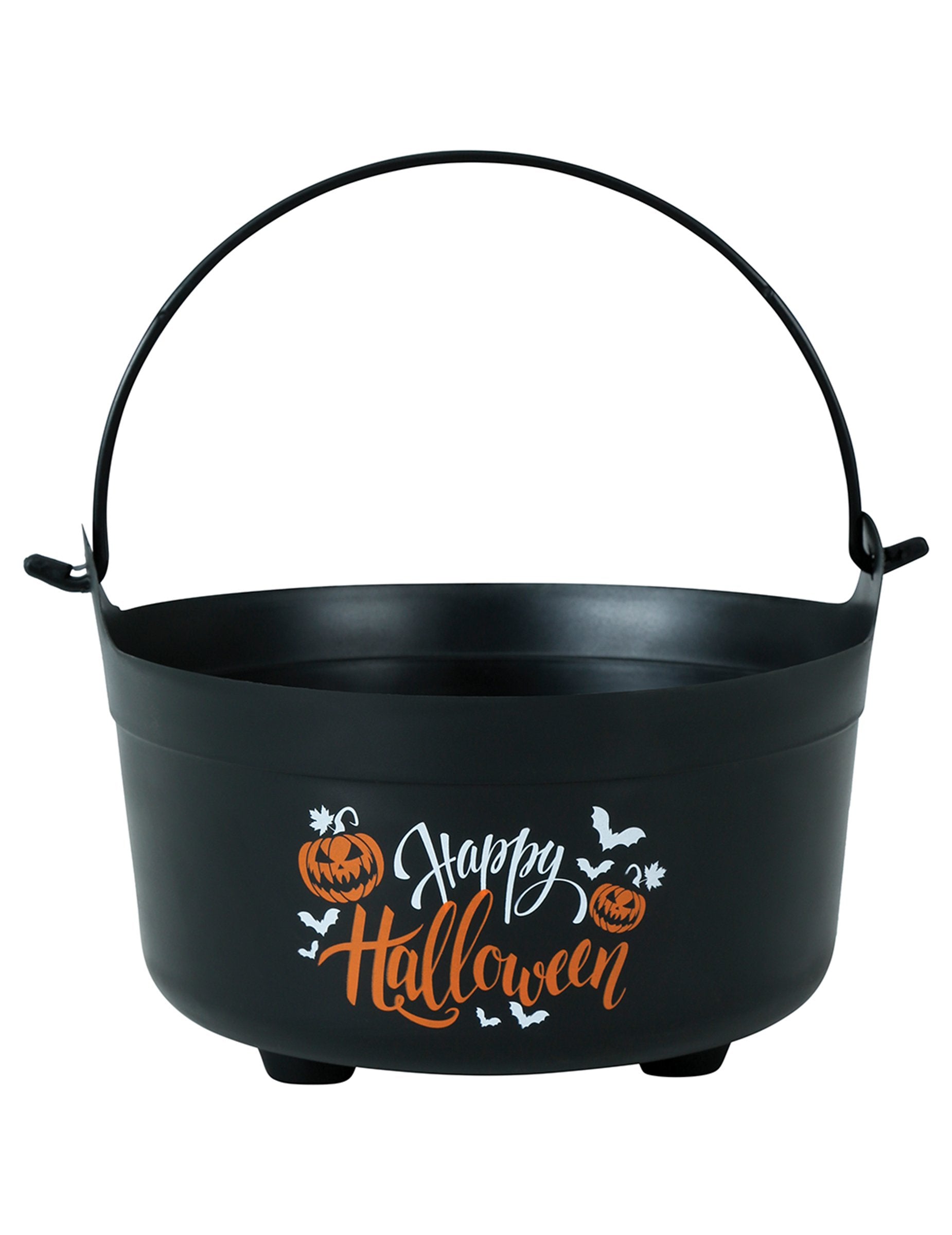 Ce chaudron noir Happy Halloween mesure environ 24 x 23 x 15 cm et affiche une inscription festive entourée de citrouilles grimaçantes et de chauves-souris blanches. Il est parfait pour récolter ou distribuer des friandises le soir d’Halloween. Un accessoire incontournable pour les petits monstres comme pour les grandes sorcières !