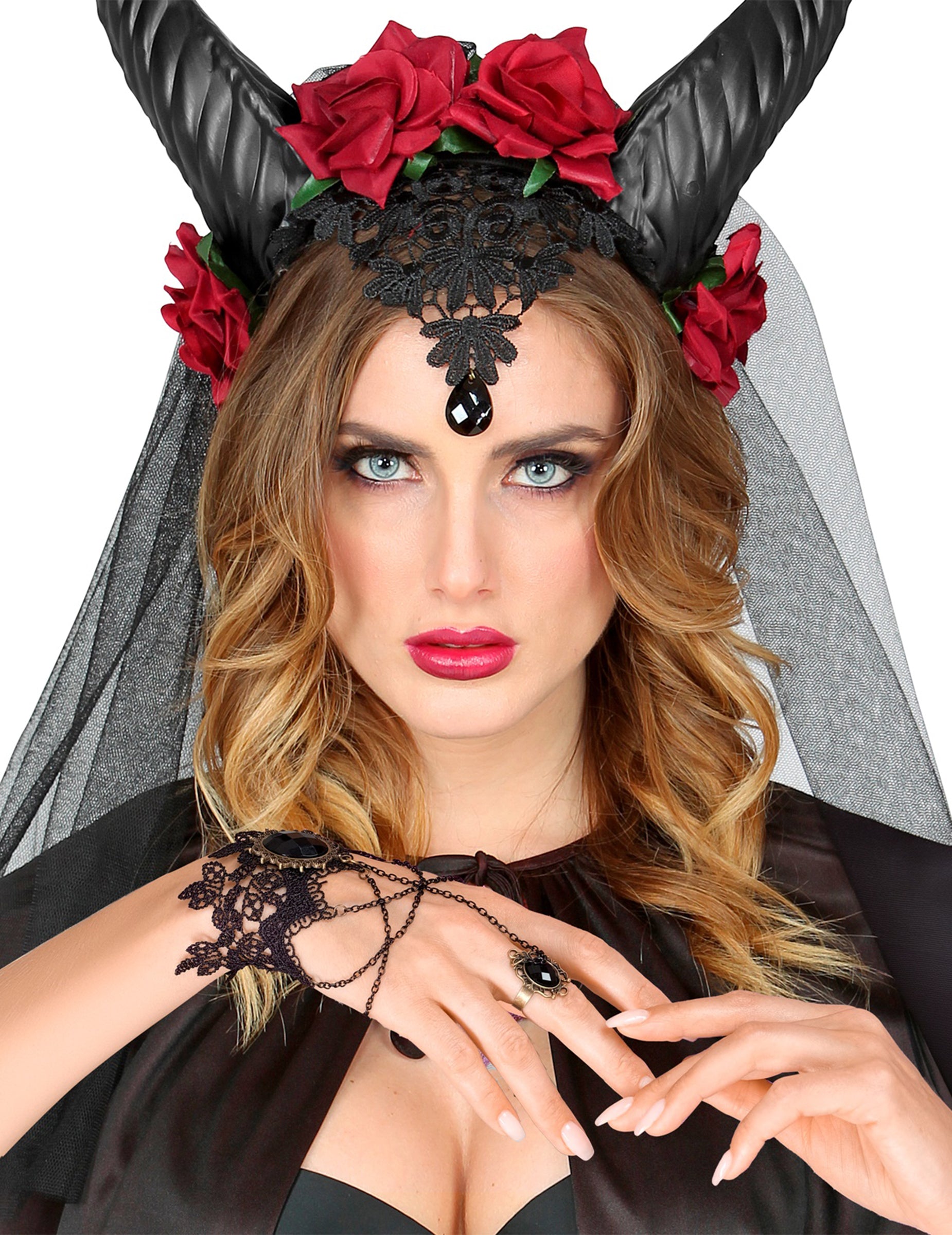 Ta črna čipkasta zapestnica je povezana z ustreznim obročem s finimi verigami, kar ustvarja šik in skrivnosten učinek. Črni kamen v vintage v slogu krasi tako zapestje kot prstan, za romantičen in temen videz. Idealen za spremljanje vampirja, čarovnice ali gotske dame kostum, ta dodatek prinaša čeden in izviren zaključek vašega videza Halloween.