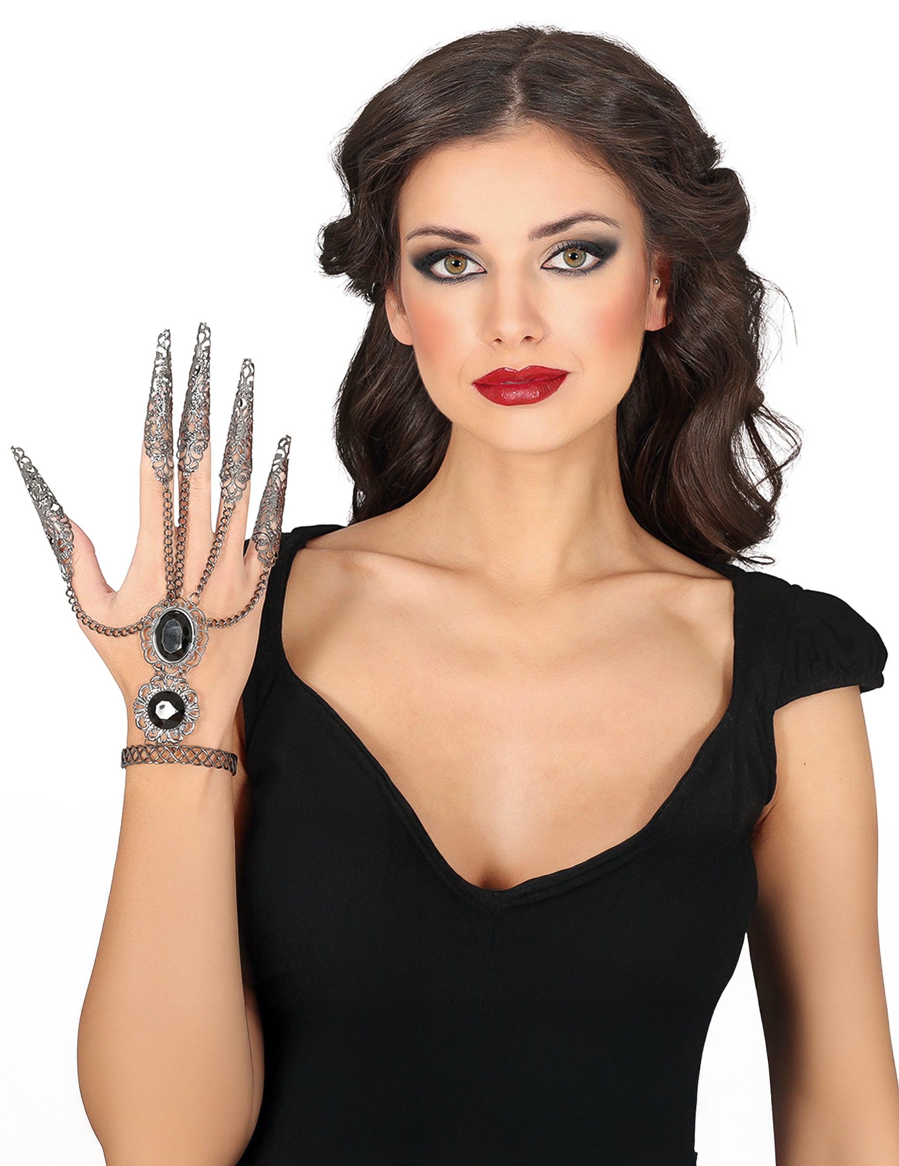 Ce bracelet gothique est fabriqué en métal et PVC, combinant finesse et solidité pour un rendu à la fois décoratif et confortable. Il relie une bague centrale à un bracelet via de petites chaînes métalliques, décorées de médaillons noirs au style victorien. Les griffes longues et sculptées accentuent l’effet effrayant sur la main, parfait pour un déguisement de sorcière, vampire ou noble ténébreuse. Un accessoire idéal pour ajouter une touche élégante et sombre à une tenue d’Halloween.