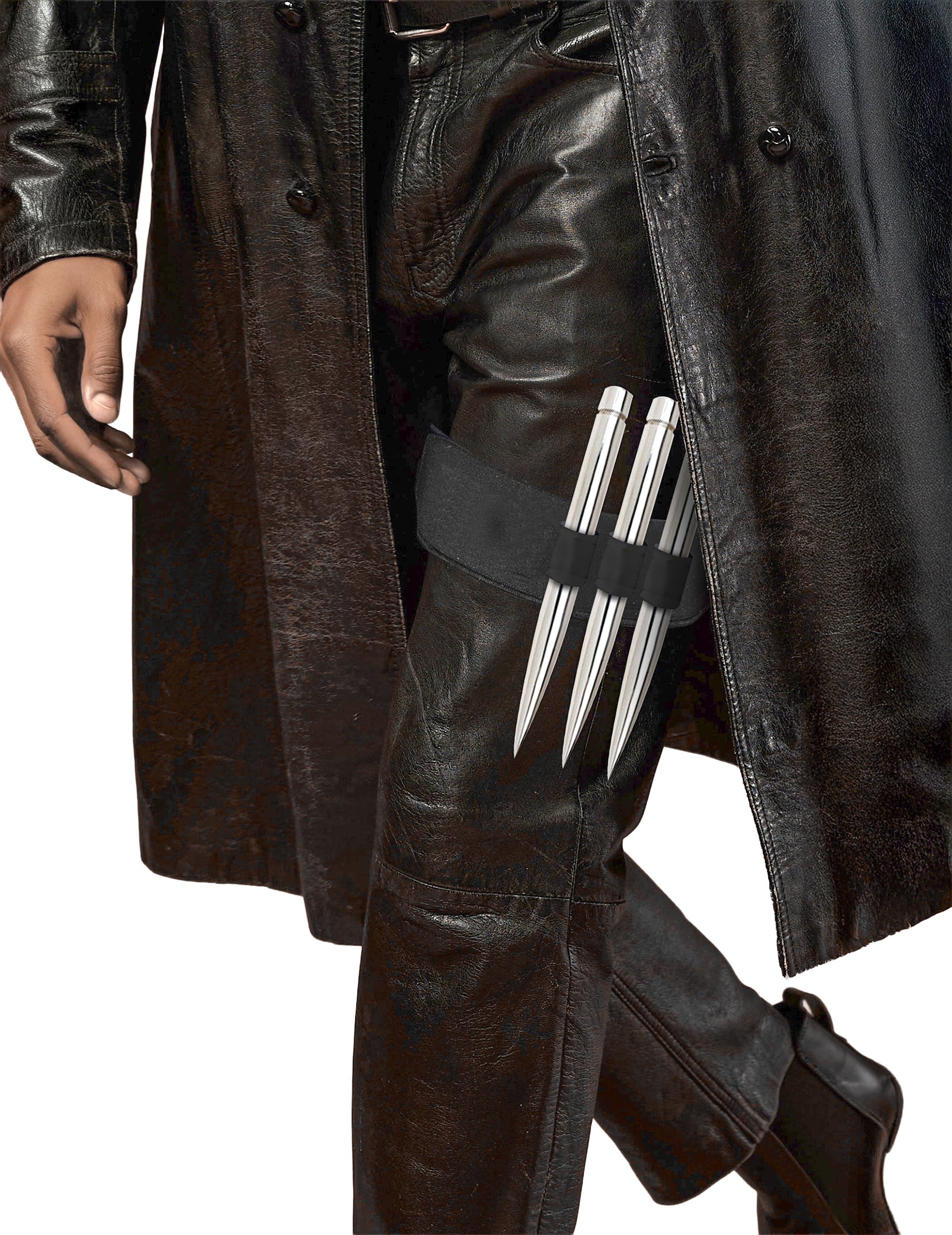 Ta stegenska opornica je opremljena s tremi srebrnimi lažnimi koli, pritrjenimi na črn trak, ki ga pritrdite okoli noge. Enostavna za namestitev, doda realističen in stilski pridih kostumu lovca ali temačnega bojevnika. Odličen dodatek h kostumu za noč čarovnic, saj prinaša močan vizualni učinek, kot da je pripravljena za uporabo proti nočnim bitjem v vsakem trenutku.