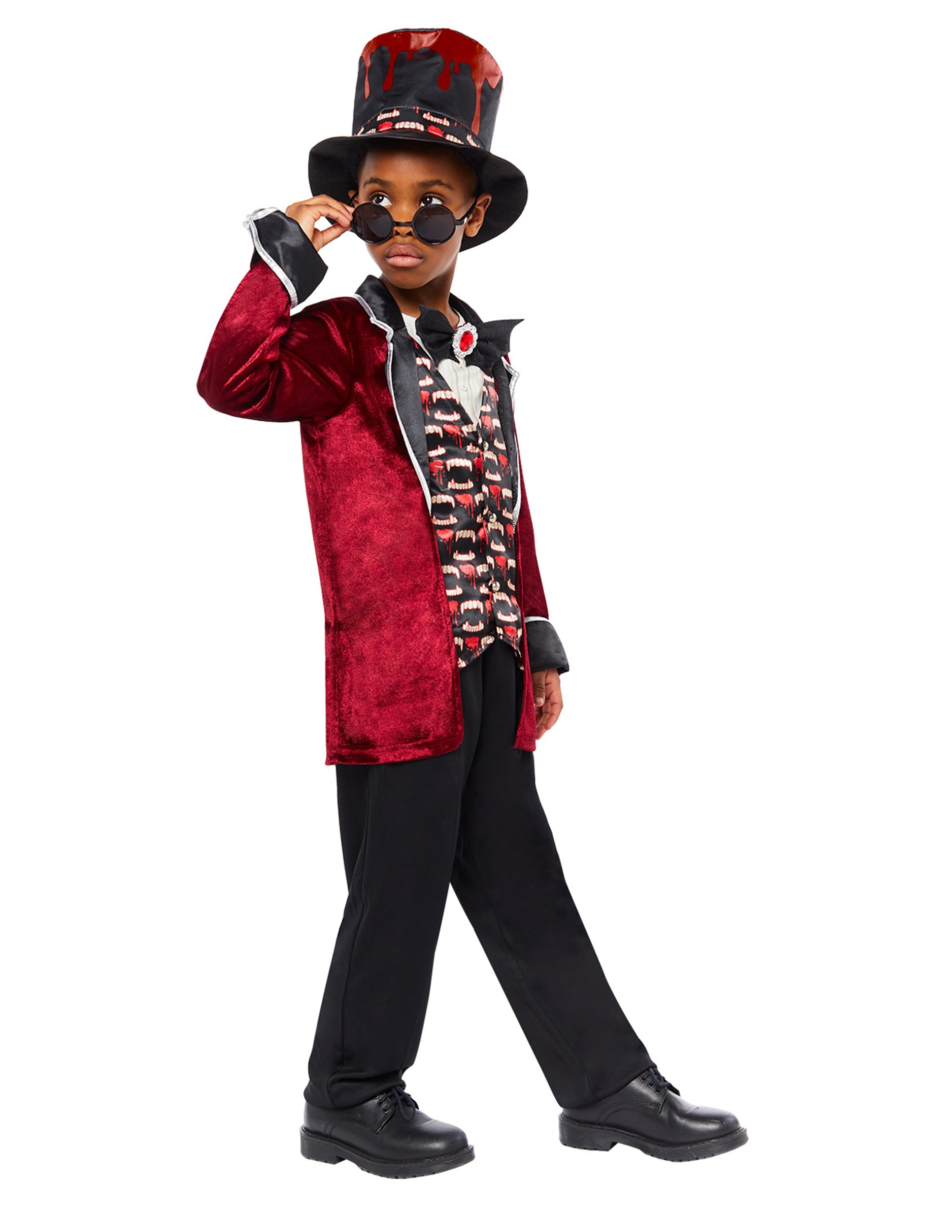 Ce déguisement de vampire satiné pour enfant se compose d’une veste rouge avec effet velours, d’un haut intégré façon chemise et gilet, d’un pantalon noir, d’un chapeau haut-de-forme et d’une paire de lunettes rondes. La veste à col est directement cousue à un gilet décoré de motifs de bouches de vampire, souligné par un nœud papillon et un médaillon rouge au centre. Le pantalon ample complète l’ensemble avec sobriété. Le chapeau noir et rouge au style excentrique et les lunettes noires apportent la touche finale pour un look à la fois élégant et effrayant, parfait pour Halloween.
