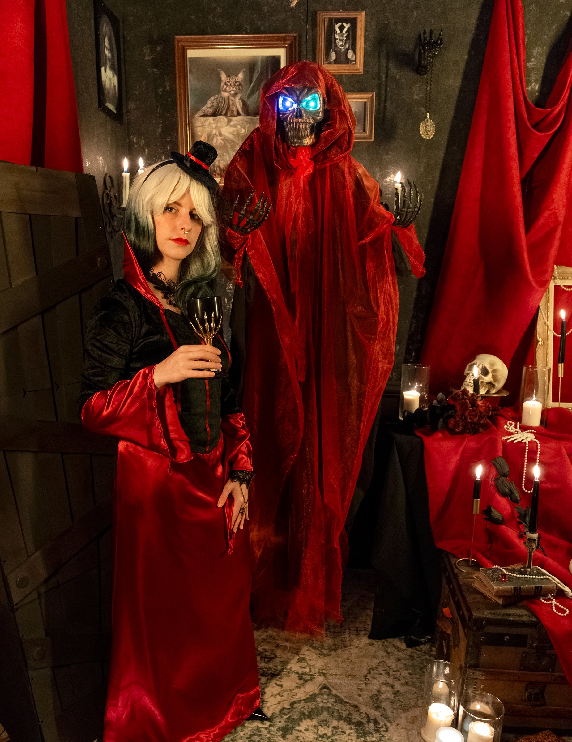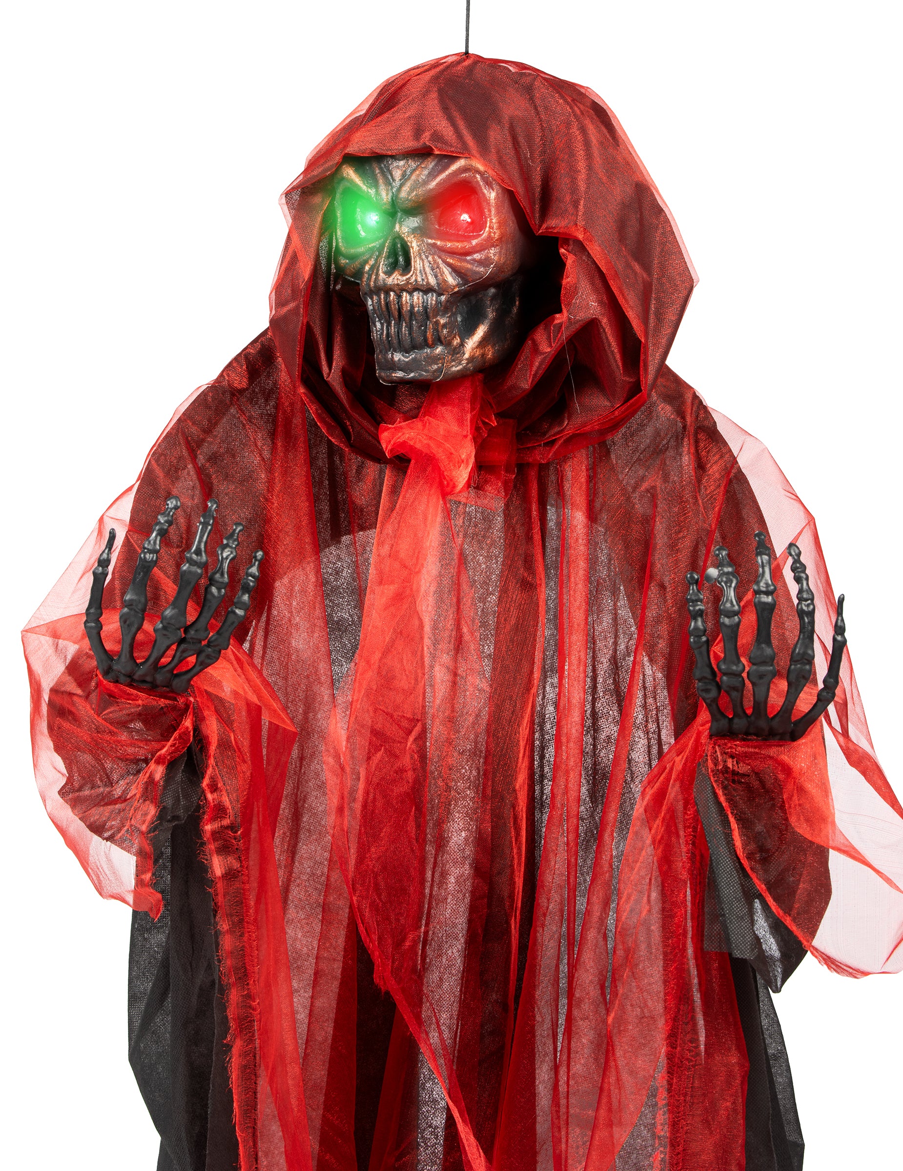 Naredite spektakularen vhod v grozo s tem 180 rdečim visečim demonom cm Približno, infernalna figura, zavita v črne in škrlatne tančice. Njegov mračen obraz, iztegnjene krempljeve roke in svetleče rdeče in zelene oči mu dajo presenetljiv videz, kot da bi pobegnil iz globin. Ta velika dekoracija je pripravljena za uporabo. Enostaven za obešanje zahvaljujoč integriranemu kavljem, je na voljo s svojimi baterijami, ki so že vključene za takojšnjo animacijo po namestitvi. Idealen za zabavo za noč čarovnic, grozljiv vhod v hišo, demonski prostor ali grozljiv okenski zaslon bo ta viseči demon ustvaril spektralno in potopno vzdušje iz prve luči mraka.