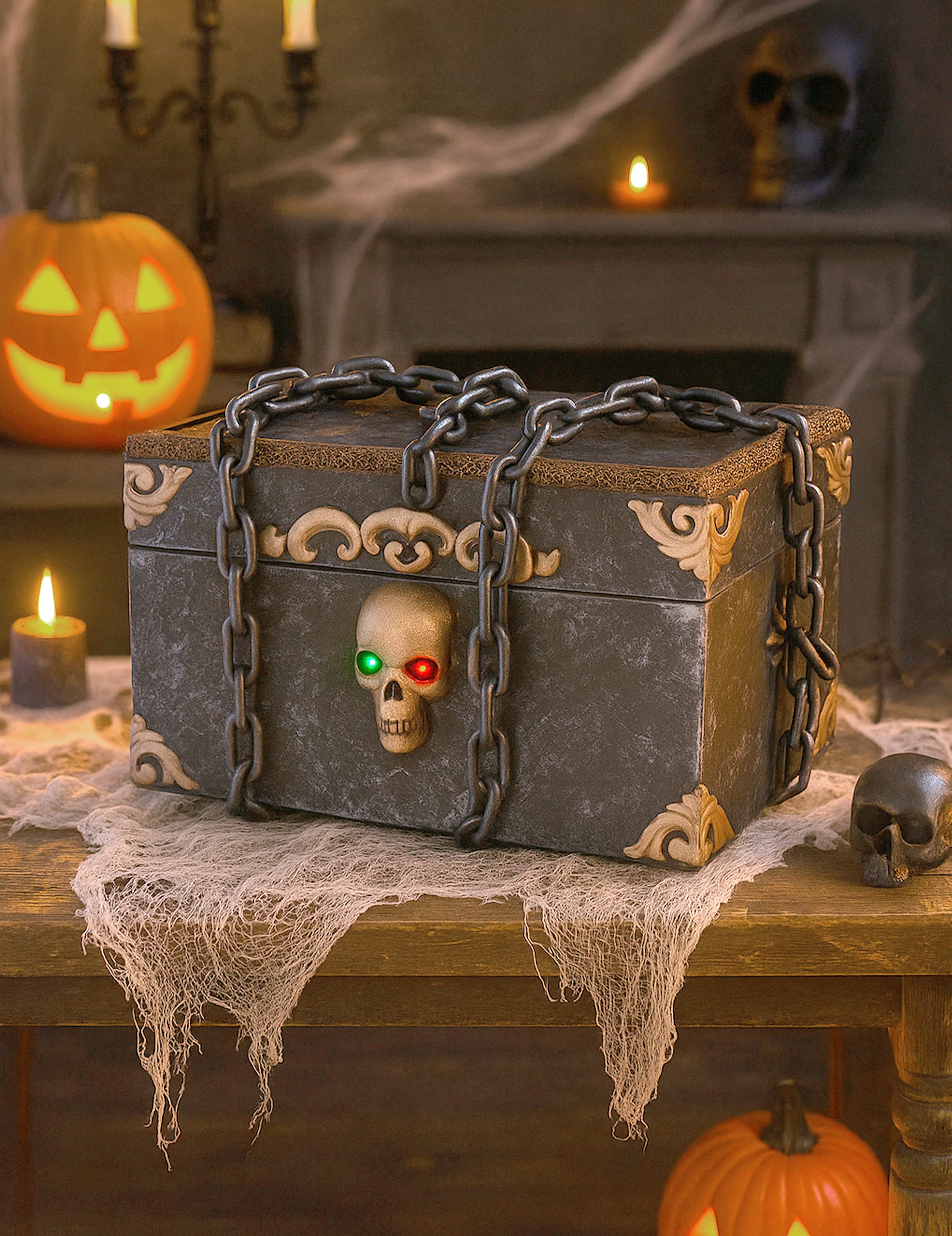 S tem animiranim zvokom in svetlostjo dodajte kanček gusarskega groze s prizorom, mogočno past, ki meri 50 x 31 x 31 cm Približno, ki se zdi, da vsebuje pozabljeno prekletstvo. Njegova dotrajana konstrukcija kovinskega učinka, debele črne verige in zlati okraski prikličejo plen, zapuščeno v preganjanem zadrževanju. Ampak to ni navaden prsni koš! Takoj, ko je zaznan zvok, se odpre in utripajo luči, mrzli zvoki odmevajo, in zastrašujoči sunki kažejo, da želi entiteta pobegniti. Ta dekoracija deluje s 3 aa baterijami (ni vključena) za potopno kombinacijo zvoka, svetlobe in gibanja. Kot nalašč za noč čarovnic, gusarski dekor, igra za pobeg ali tematsko vitrino, ta grozljivka obljublja zajamčene šoke vsakič, ko se odpre.