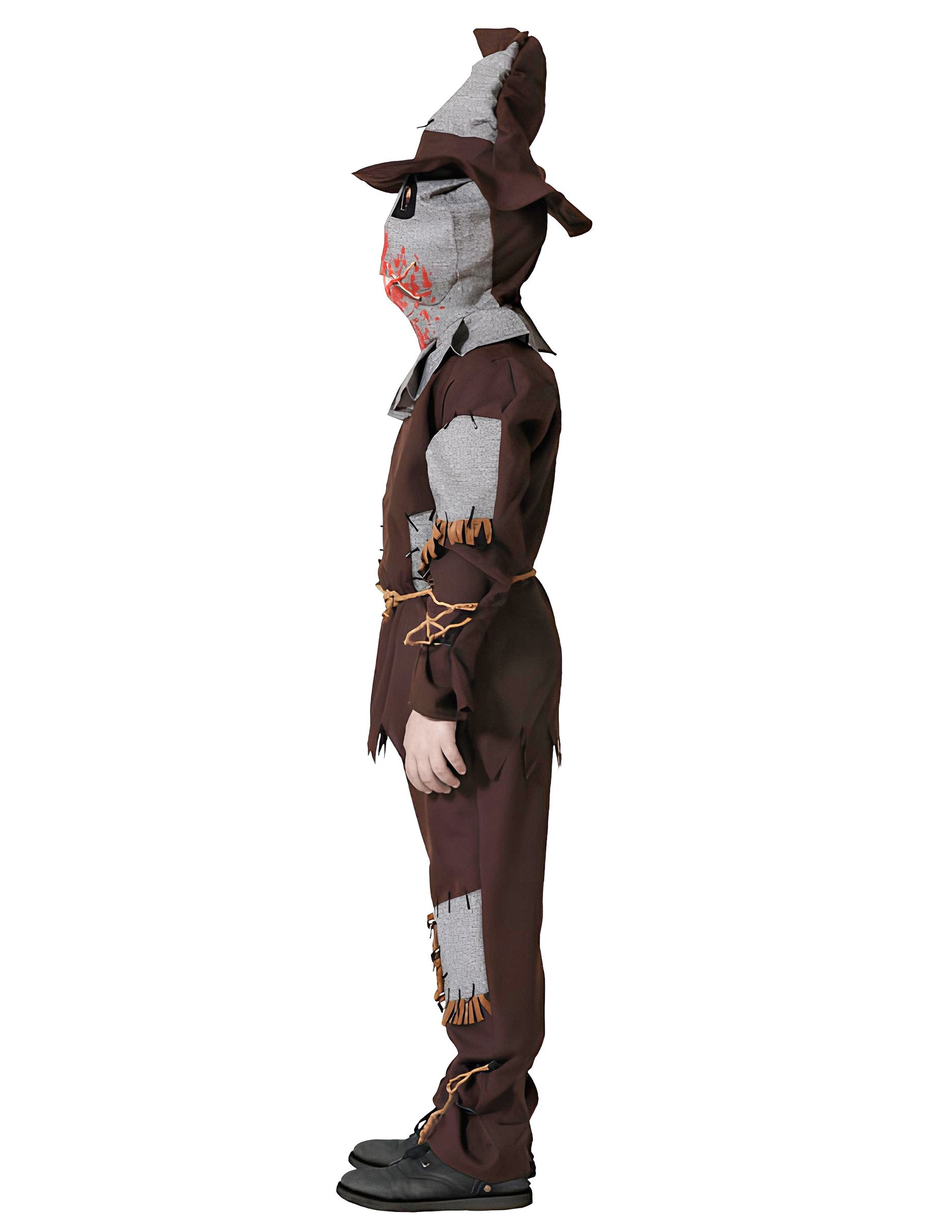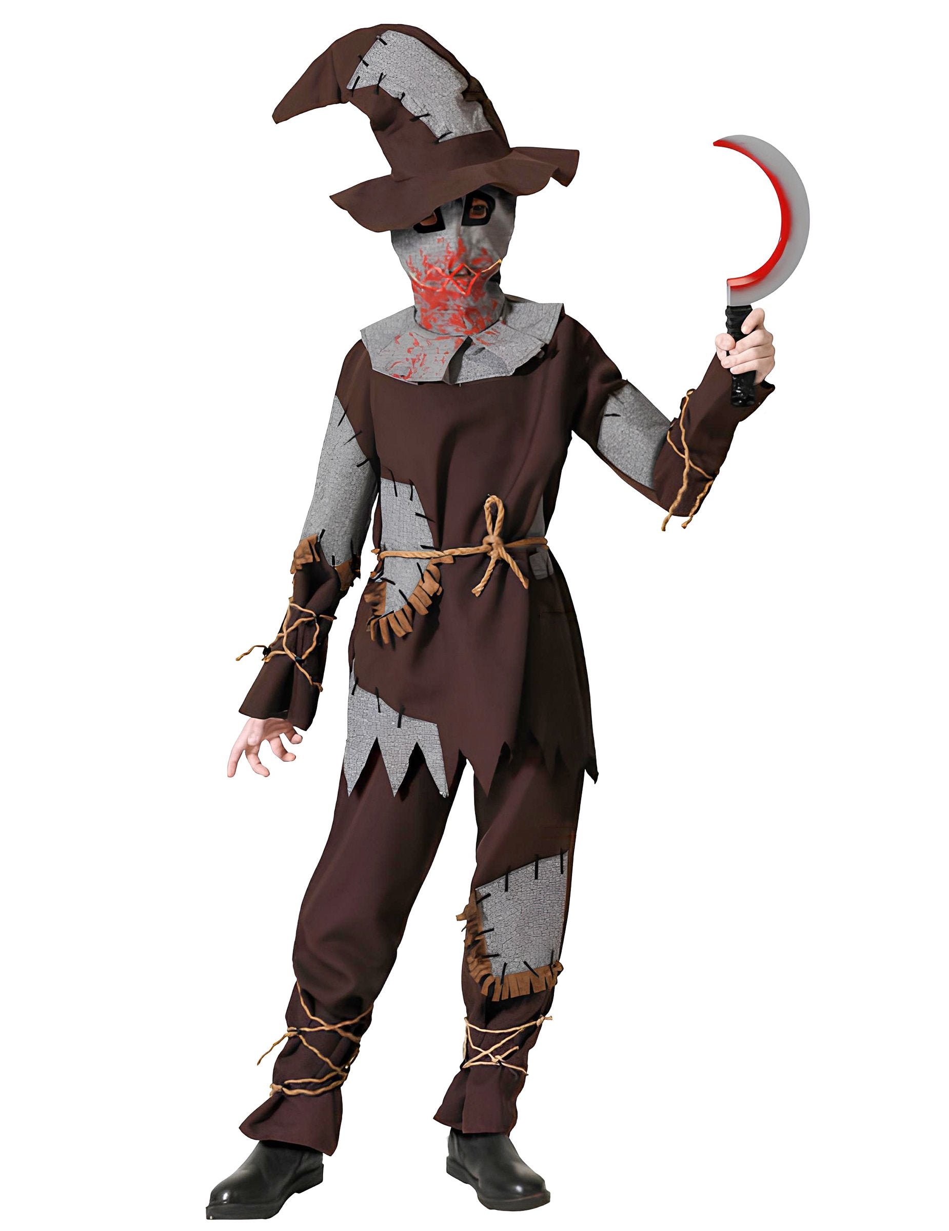Ce Déguisement Épouvantail ensanglanté garçon est idéal pour donner des frissons à Halloween ! Avec son style terrifiant et ses détails sanglants, il transforme votre enfant en véritable monstre venu des champs. Le costume comprend un t-shirt marron avec fausse couture et effets déchirés, un pantalon assorti avec des morceaux de toile grise intégrés, un chapeau pointu au style abîmé, une ceinture cordelette, et un masque effrayant avec des taches de sang autour de la bouche. Le tout imite à la perfection un épouvantail macabre tout droit sorti d’un cauchemar. Parfait pour Halloween, une fête costumée ou une soirée à thème horrifique, ce déguisement fera sensation auprès des petits amateurs de frissons. Un incontournable pour un look sinistre et réussi !