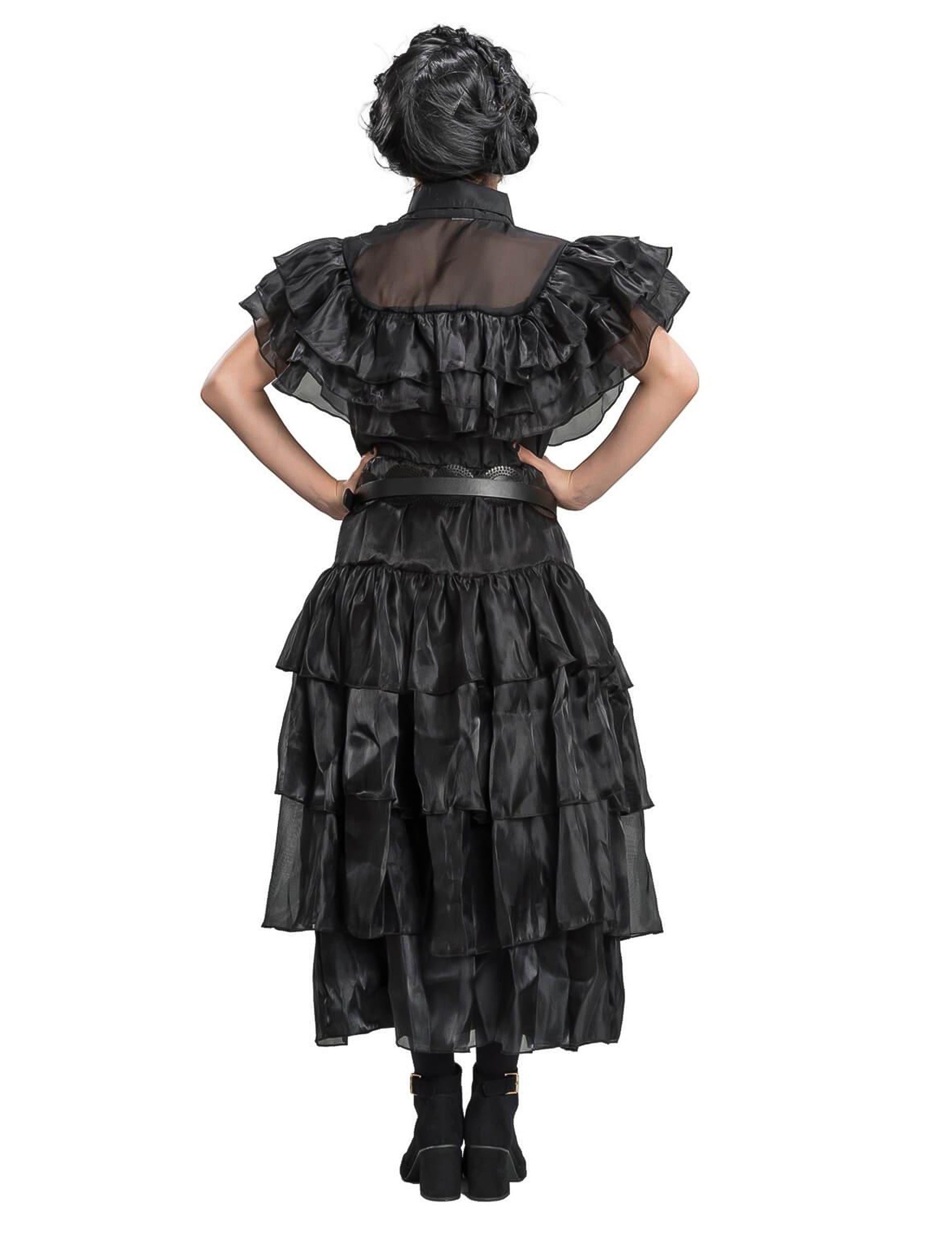 Ce déguisement Wednesday pour enfant se compose d’une robe longue noire à volants, évoquant la fameuse tenue de bal de Mercredi Addams. Le haut de la robe est orné de volants superposés et d’un col chemise boutonné, pour un style à la fois gothique et soigné. La jupe est constituée de plusieurs couches satinées à effet brillant, apportant du volume tout en conservant l’aura sombre du personnage. Une ceinture à boucle vient marquer la taille et structurer la silhouette. Un costume idéal pour incarner le charme macabre de Wednesday, parfait pour Halloween.
