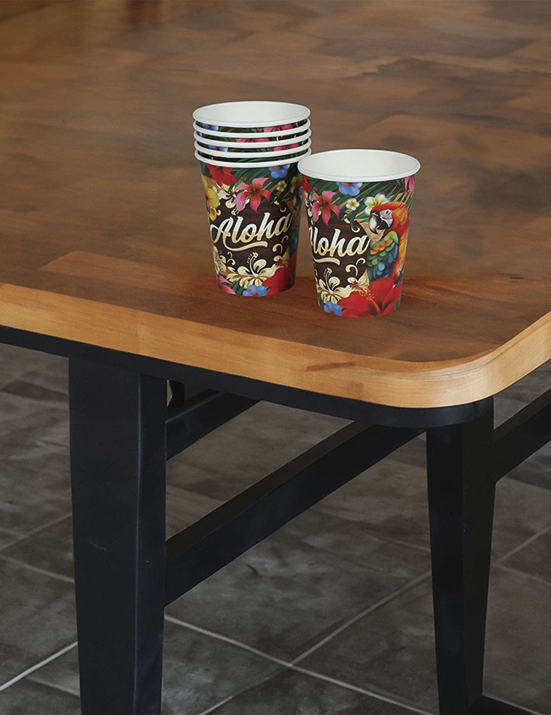 Ta komplet 6 papirnatih skodelic Aloha Havaji z zmogljivostjo 240 ml in višino 9 cm je kot nalašč za dokončno in barvito dekoracijo. Natisnjena s tropskimi cvetnimi vzorci in eksotičnimi papagaji so ta očala za enkratno uporabo zasnovana tako, da služijo vašim hladnim napitkom, hkrati pa dodajo sončno noto v svojo mizo. Kot nalašč za vrtno zabavo, otoški tematski večer ali poletni rojstni dan.