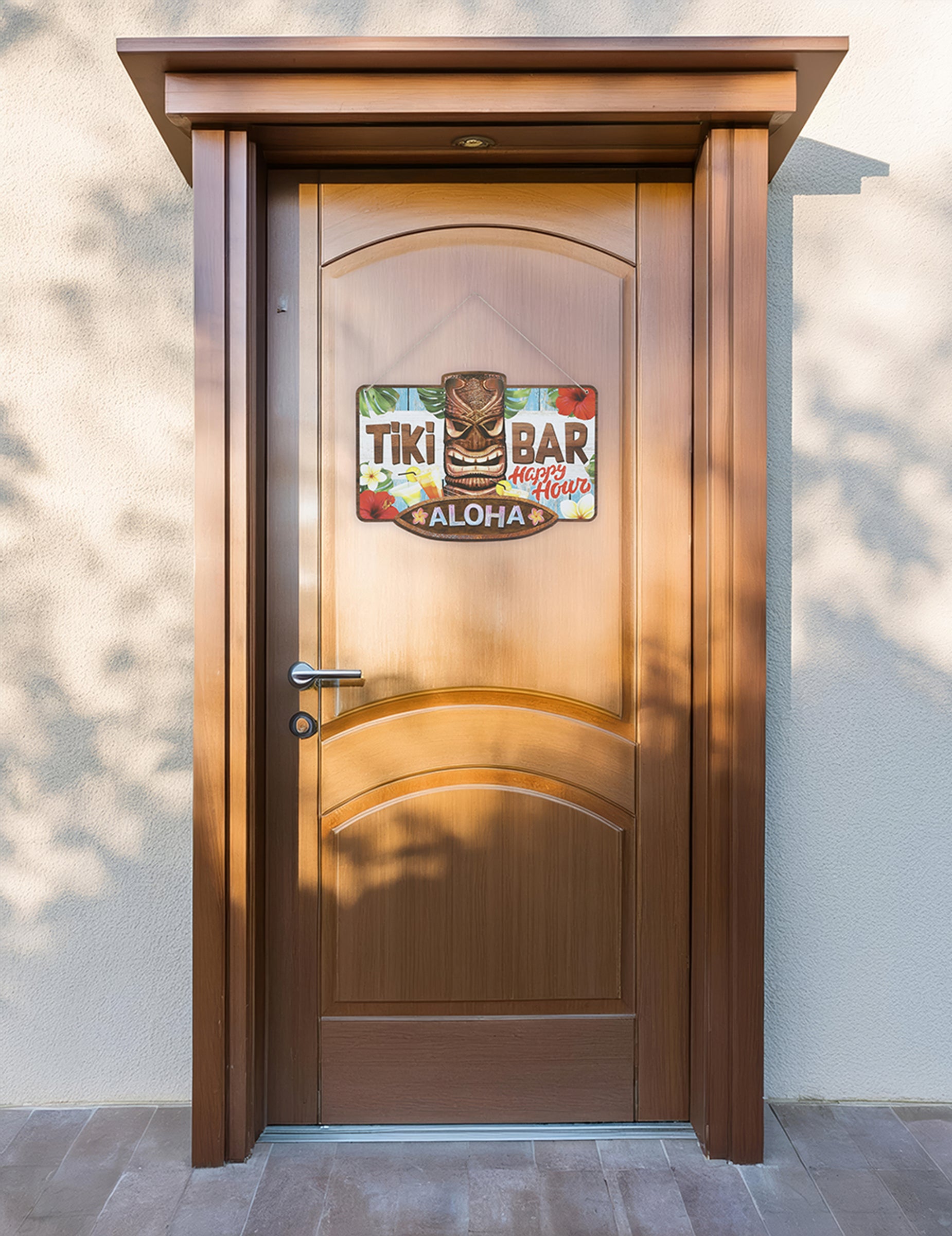 Ta 25 x 35 Tiki Bar Aloha Leseni znak cm Obešanje je idealen dekorativni element za tropsko vzdušje na sprejemu. S svetlimi barvami, tiki masko, havajskimi cvetovi in ​​napisom "Happy Hour", zlahka visi, zahvaljujoč svoji vrvici, da obleče vrata, steno ali koktajl. Idealen za eksotičnega aperitiva, prazničnega tematskega večera ali dogodka, navdihnjenega na otoku.
