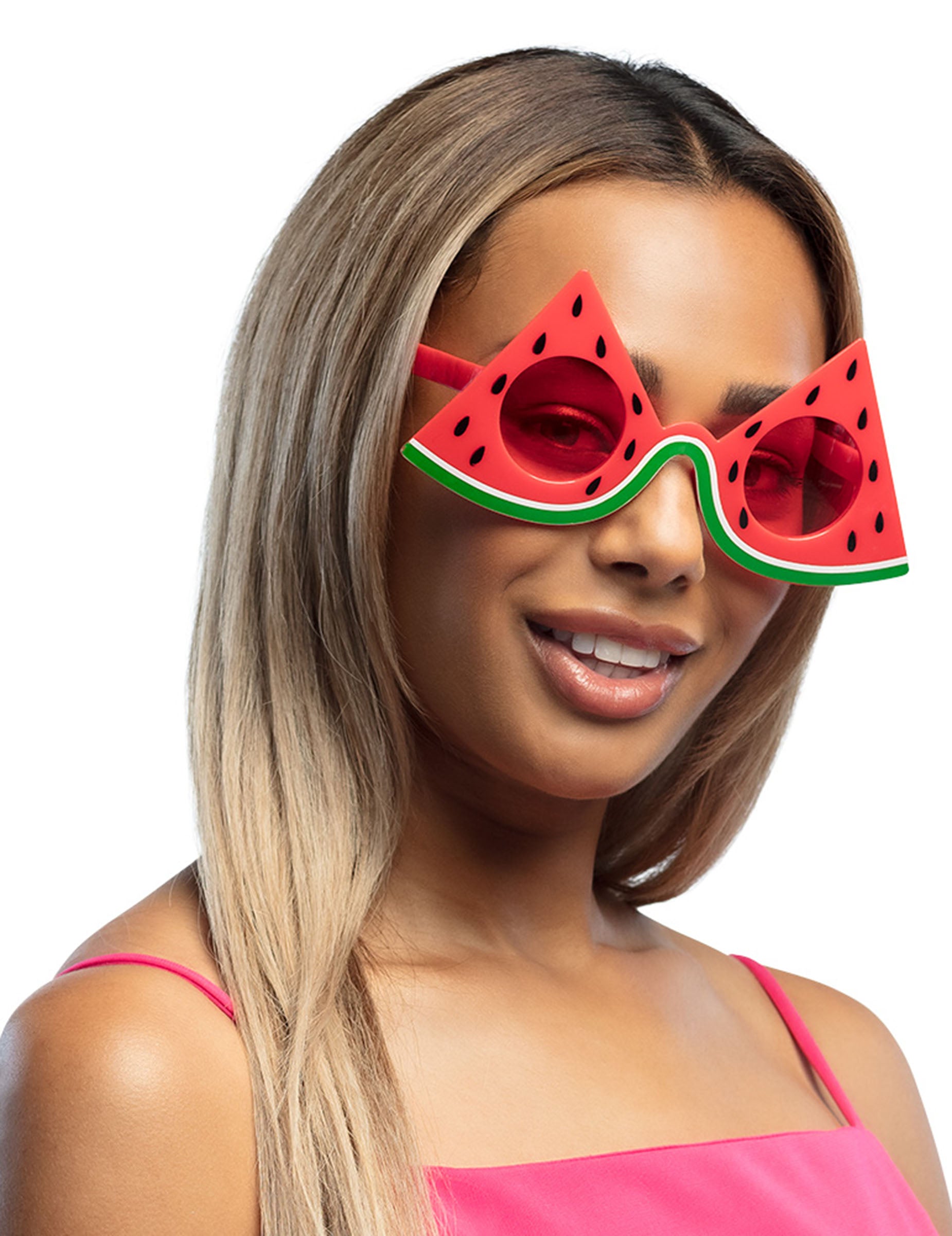 Njihov barvita trikotna oblika spominja na rezino lubenice, z rdeče zatemnjena očala in vzorci črnih semenSo kot nalašč za popestritev obleke na poletni zabavi.