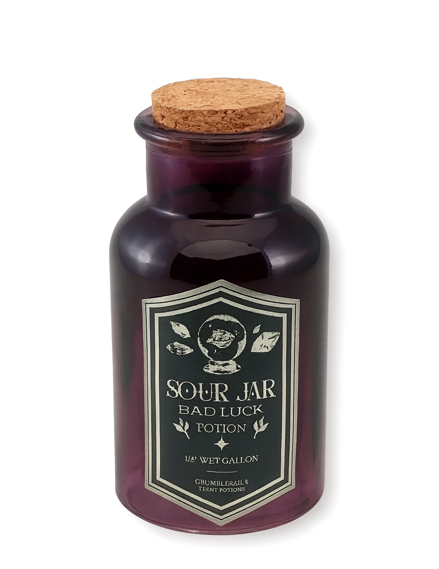 Ta vijolična stekla "kisla kozarec" 13.5 cm ujame oko s starim apotekarnim videzom. Njegova črna nalepka z ezoteričnim slogom v kombinaciji z rustikalnim zamaškom plute je predmet izbire za čarobni zaslon. V idealnem primeru dopolnjuje dekoracijo za noč čarovnic, prežeto s slabo srečo in skrivnostjo.