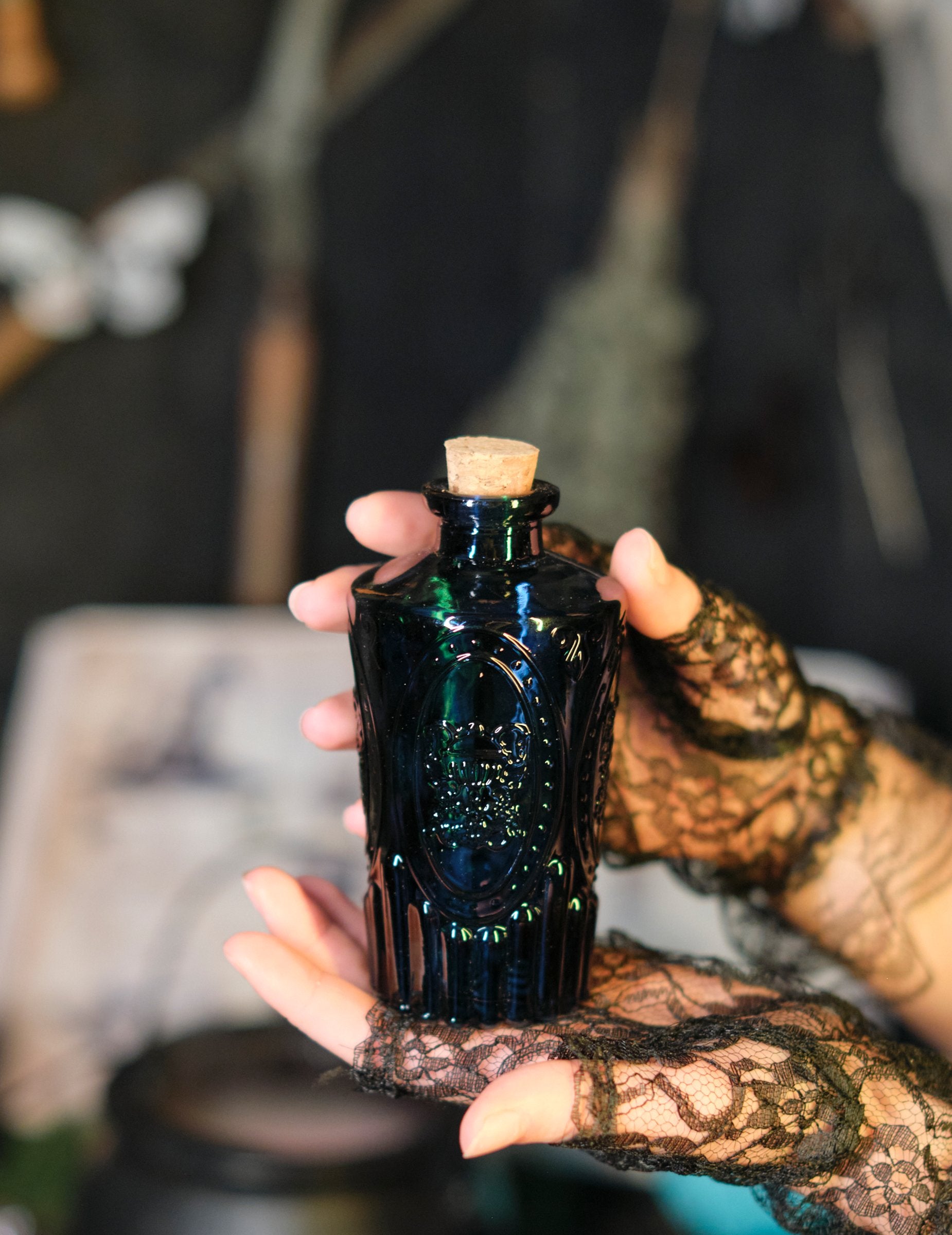 Ta dekorativna temno modra steklena viala meri 13,5 cm in počiva na premeru 7 cm. Njegova relieficirana zasnova v kombinaciji z naravnim zamaškim plutom vzbuja napitke iz starodavnih grimoirov. Postavljen v sredino mize ali na koščku pohištva, se popolnoma prilega v vesolje za noč čarovnic, ki je obarvano s čarobnostjo in skrivnostjo.