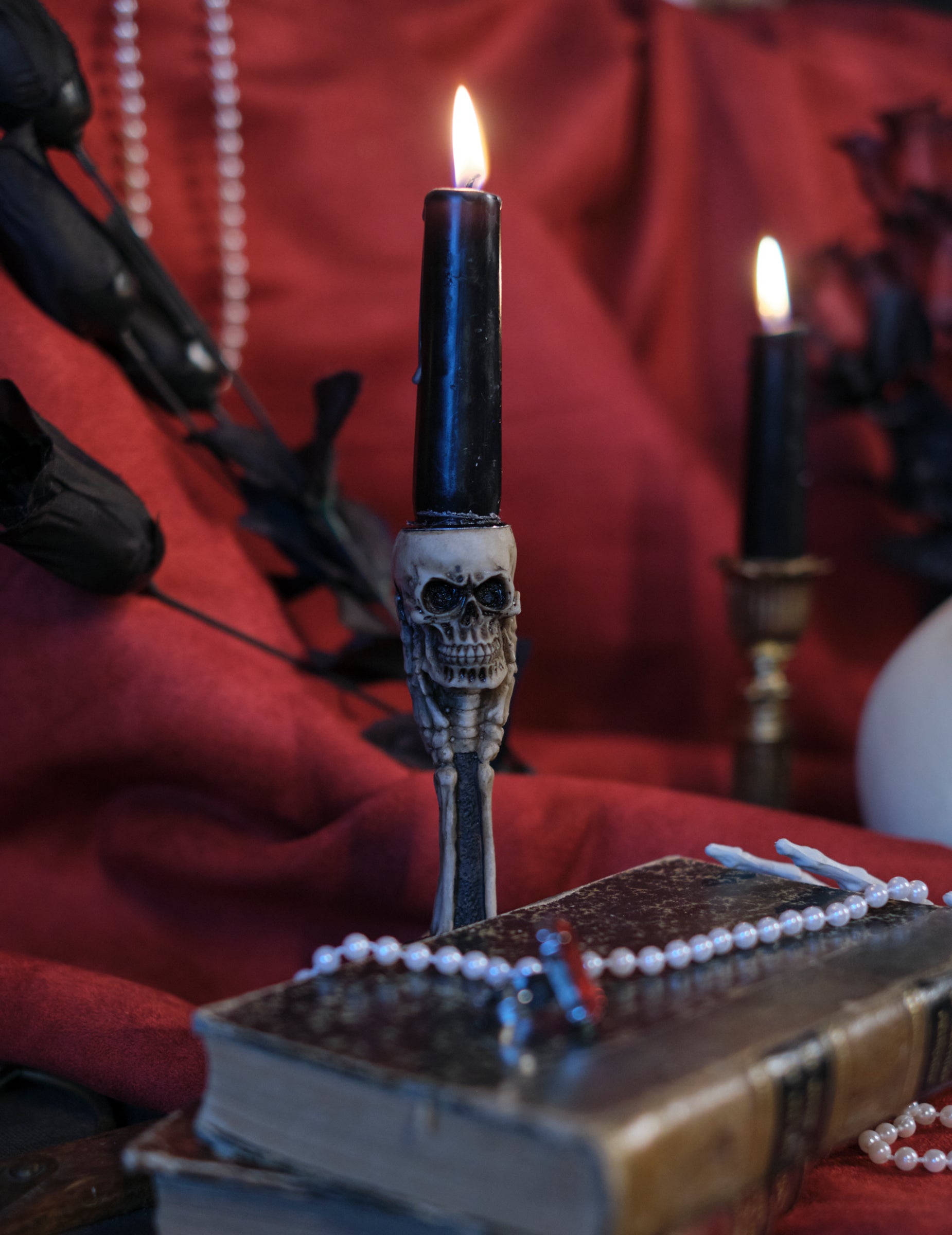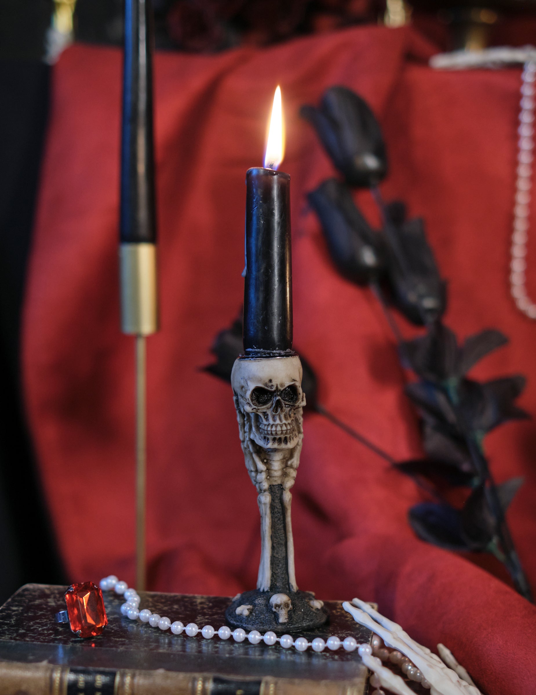 To 12,5 cm svečnik v obliki lobanje in kosti cm doda temen in izviren pridih vaši dekoraciji, idealen za poudarjanje mračnega ali gotskega vzdušja na vaših dogodkih.