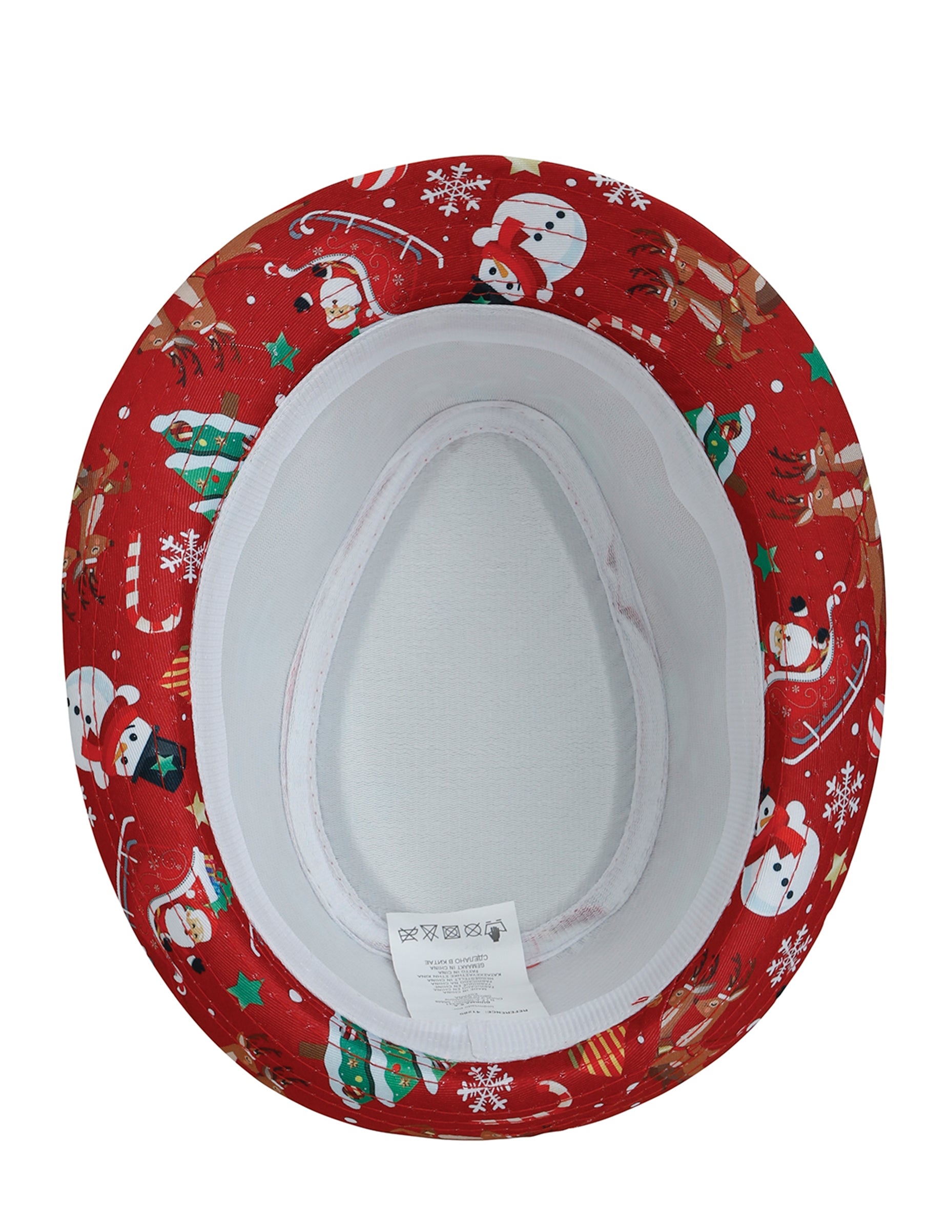 Okrašen s številnimi značilnimi simboli, kot so sani, sladkorna palčka, snežak, škratki in zvezde, ta barvit klobuk zagotovo ne ostane neopažen. Njegova klasična oblika v slogu borsalina je predstavljena v veseli in igrivi različici, popolni za praznične oprave.