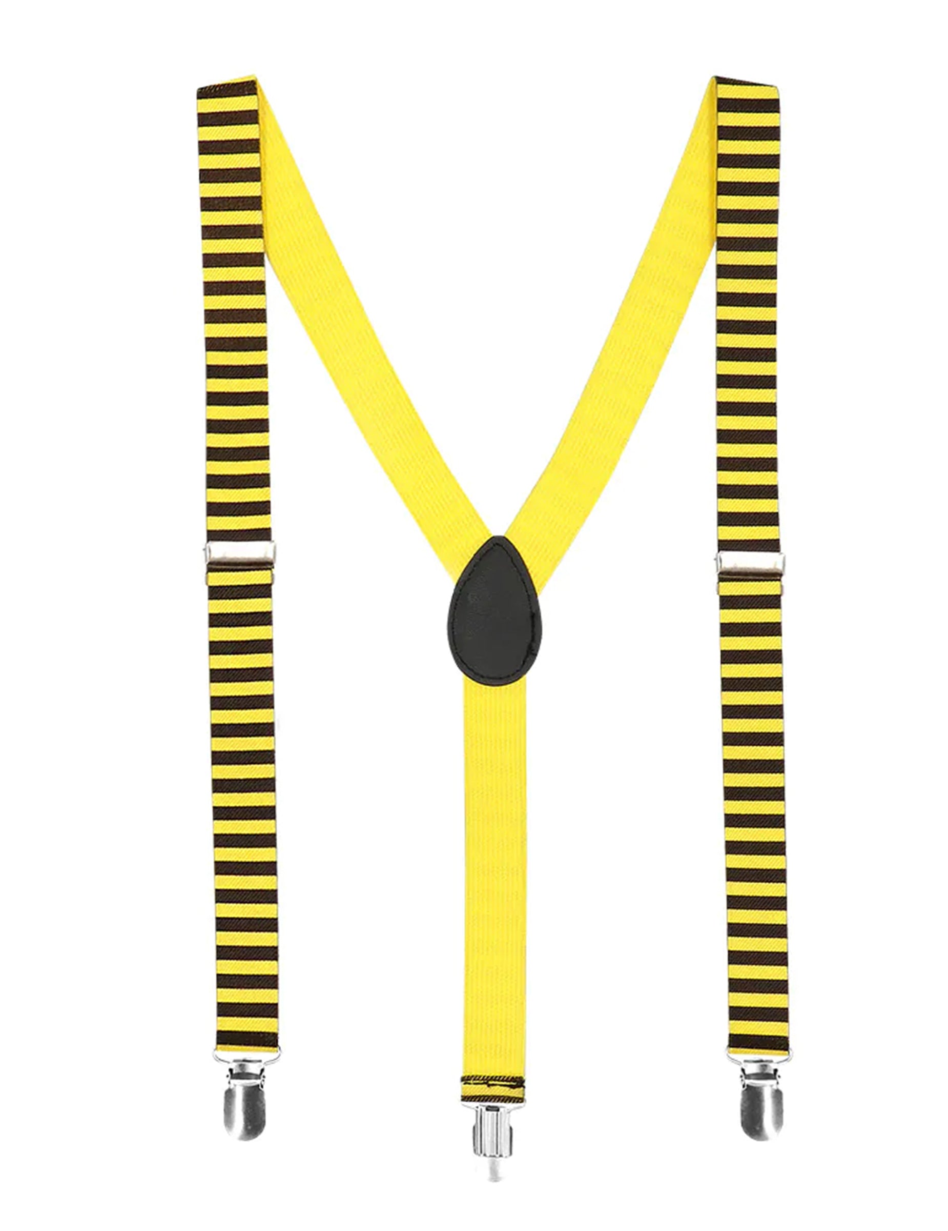 Ta komplet za dodatno opremo za odrasle je kot nalašč za sestavljanje smešne in barvite obleke na trenutek. Vključuje par rumenih in črnih črtastih suspenzorjev, ujemajočo se kravato in očala z vgrajenimi antenami za čudaški videz. Ta komplet idealen za karneval, domišljijsko obleko ali kostumski dogodek dodaja vašo obleko veselo in izvirno pridih. Enostaven za nošenje in kombiniranje, zagotavlja rahlo in praznično vzdušje.