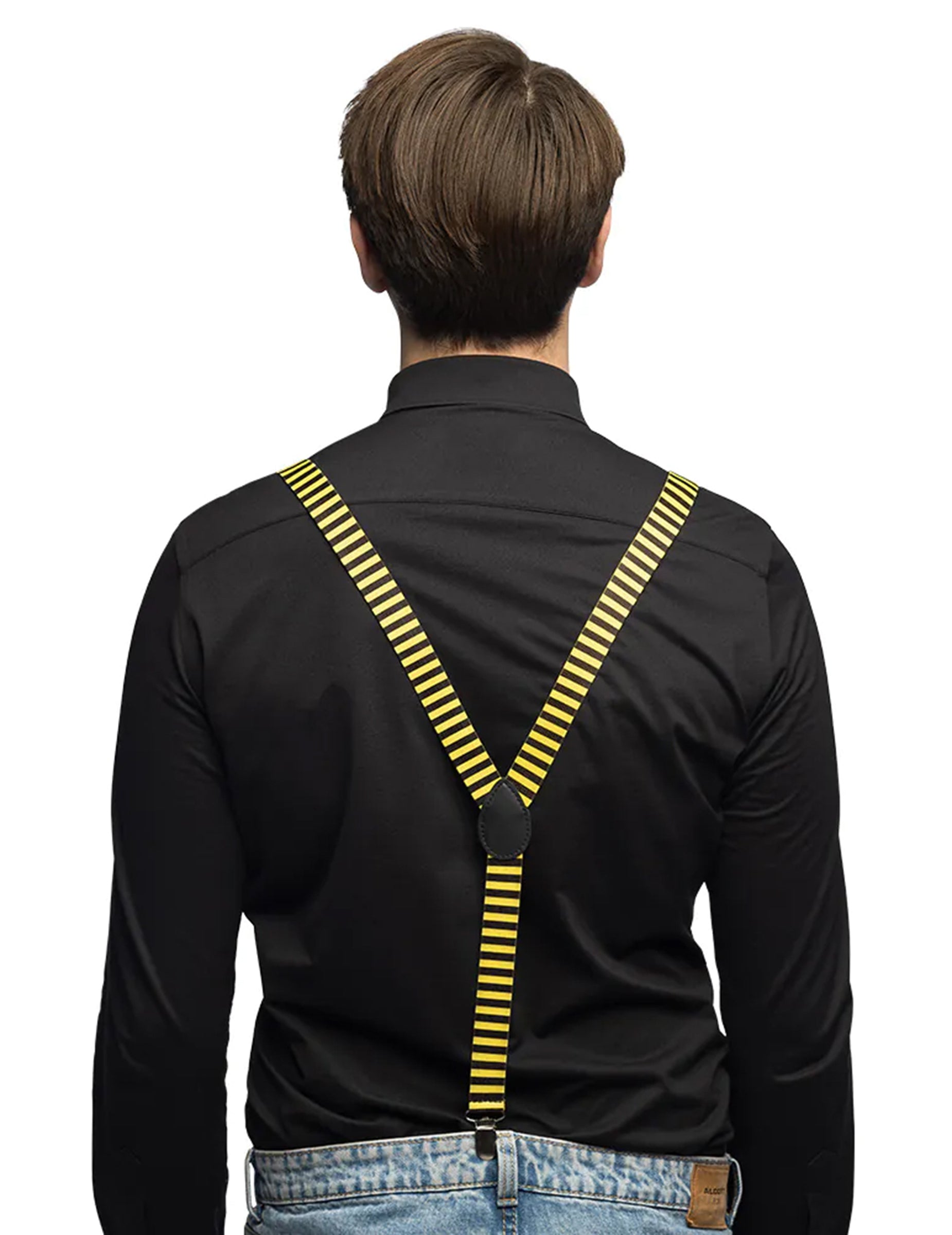 Ckomplet pripomočkov za odrasle čebele Ta komplet je popoln za bliskovito ustvarjanje zabavne in barvite obleke. Vključuje par rumenih in črno-črnih črtastih naramnic, ujemajočo se metuljčko in očala z vgrajenimi antenami za nenavaden videz.