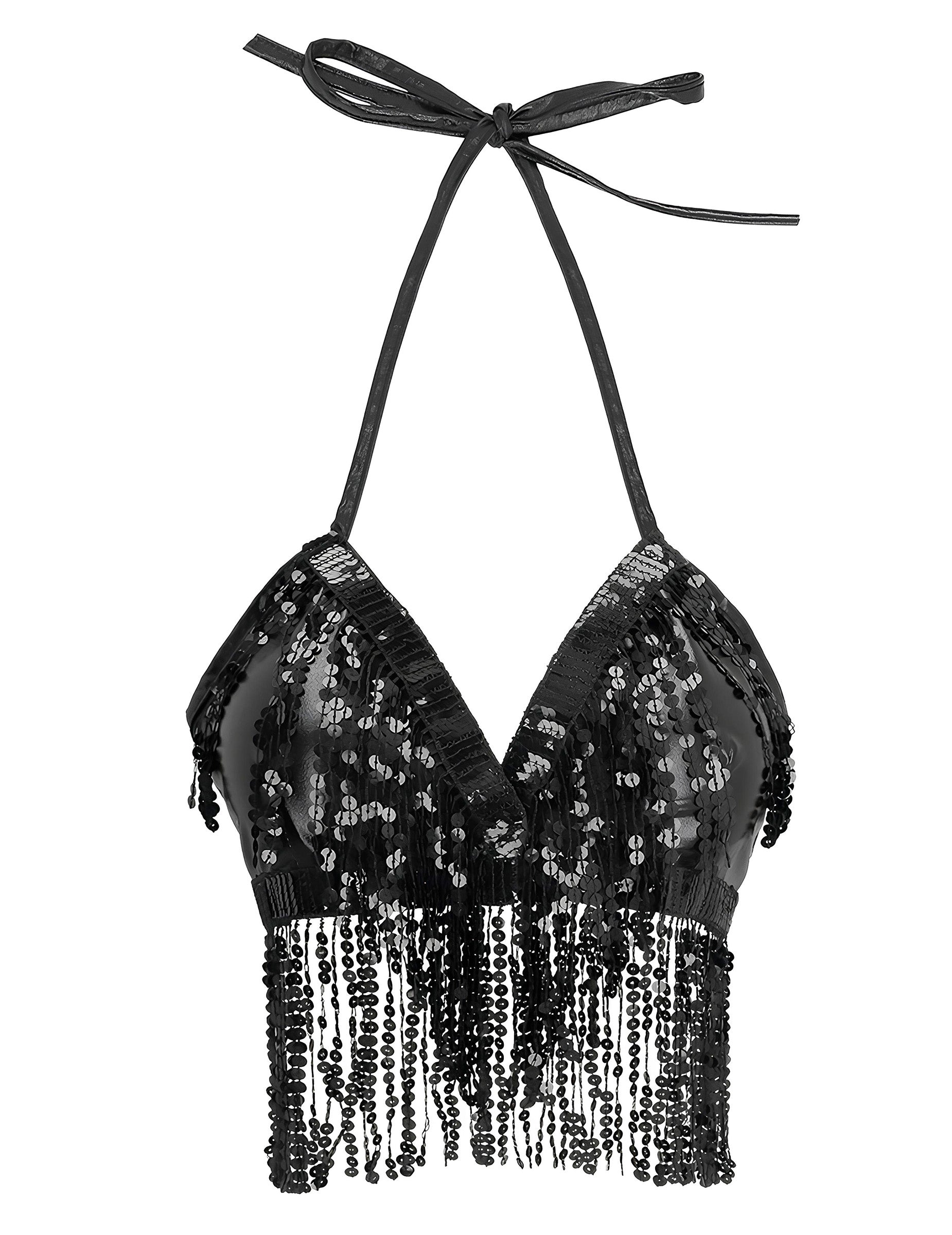 Faites sensation avec ce magnifique top noir recouvert de sequins brillants et orné de franges élégantes qui bougent avec fluidité à chaque pas. Élégant et glamour, il est idéal pour illuminer vos soirées et attirer tous les regards. Grâce à ses liens à nouer, il s’ajuste parfaitement à votre silhouette et garantit un confort optimal tout en mettant en valeur vos mouvements. Parfait pour les soirées disco, spectacles, festivals, carnavals ou fêtes déguisées.
