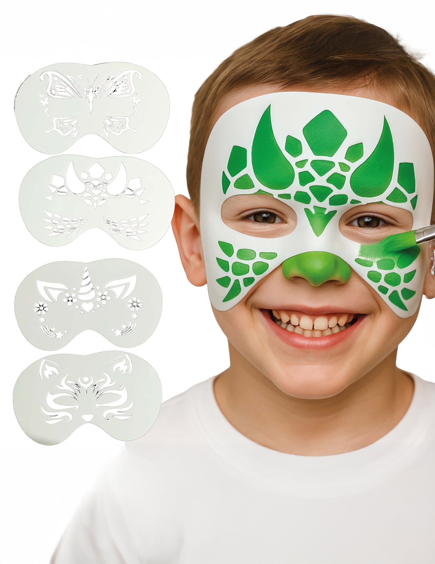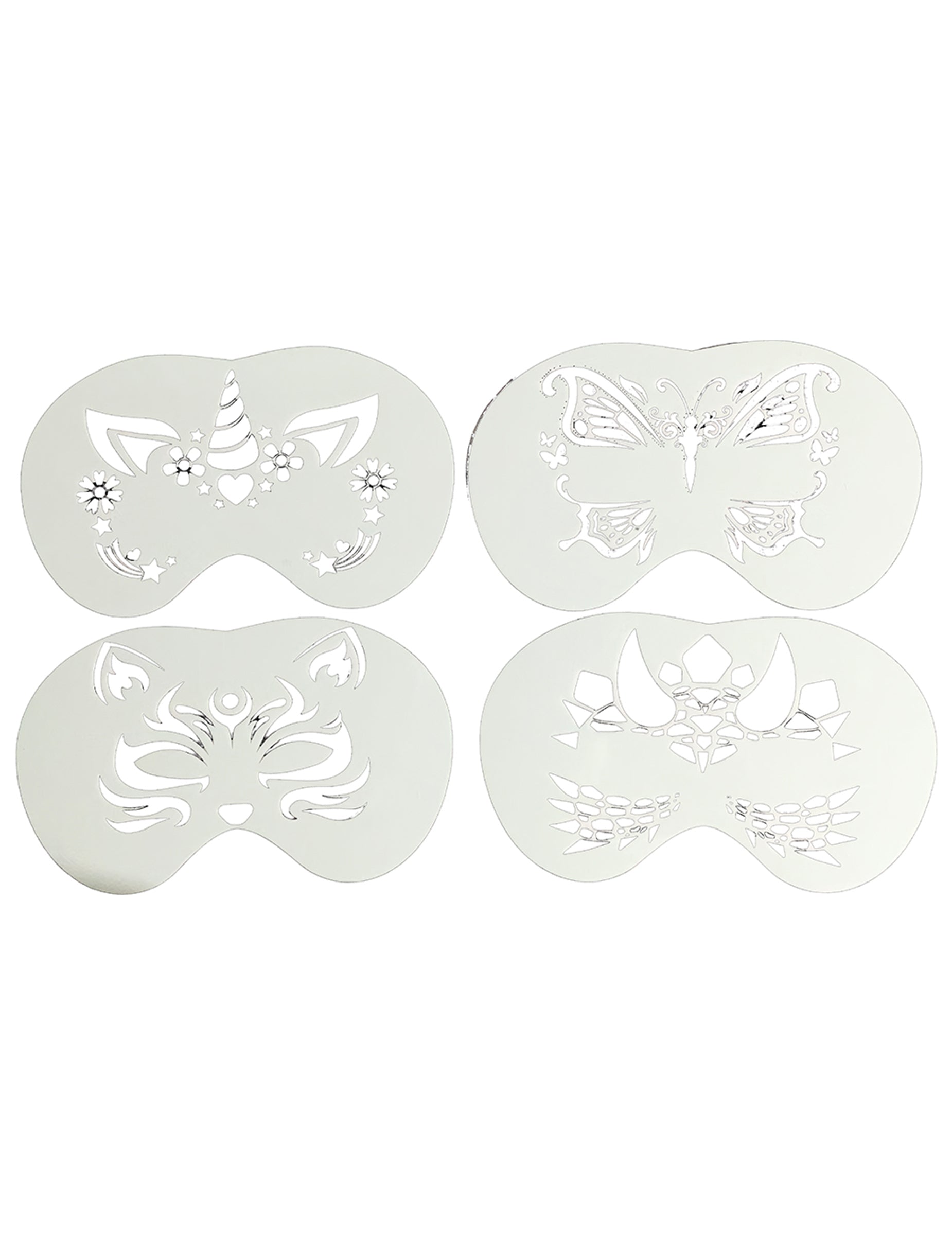 Ta komplet vsebuje štiri šablone za večkratno uporabo, posebej zasnovane za otroke. Omogočajo vam hitro ustvarjanje originalnih poslikav obraza v obliki zmaja/dinozavra, metulja, samoroga in mačke. Zaradi natančnega reza jih je enostavno nanesti na obraz in zagotavljajo čist rezultat, tudi za začetnike. Te šablone so odlične za rojstne dneve, karnevale, šolske zabave ali noč čarovnic ter zagotavljajo zabavno, hitro in ustvarjalno poslikavo obraza.