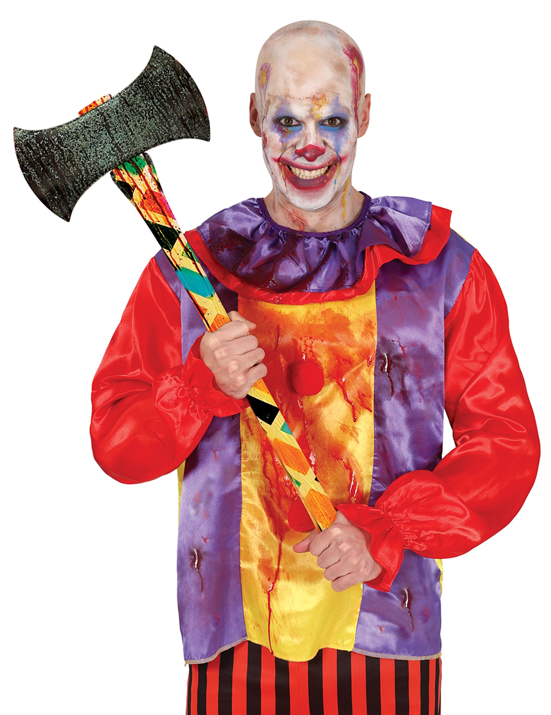 Ta klovnska sekira dolžine približno 73 cm je popolno orožje za širjenje strahu. Z ročajem v pisanih cirkuških barvah in črnim rezilom s postarano patino ustvarja kontrast med otroškim svetom predstave in brutalnostjo strašljivega dodatka.