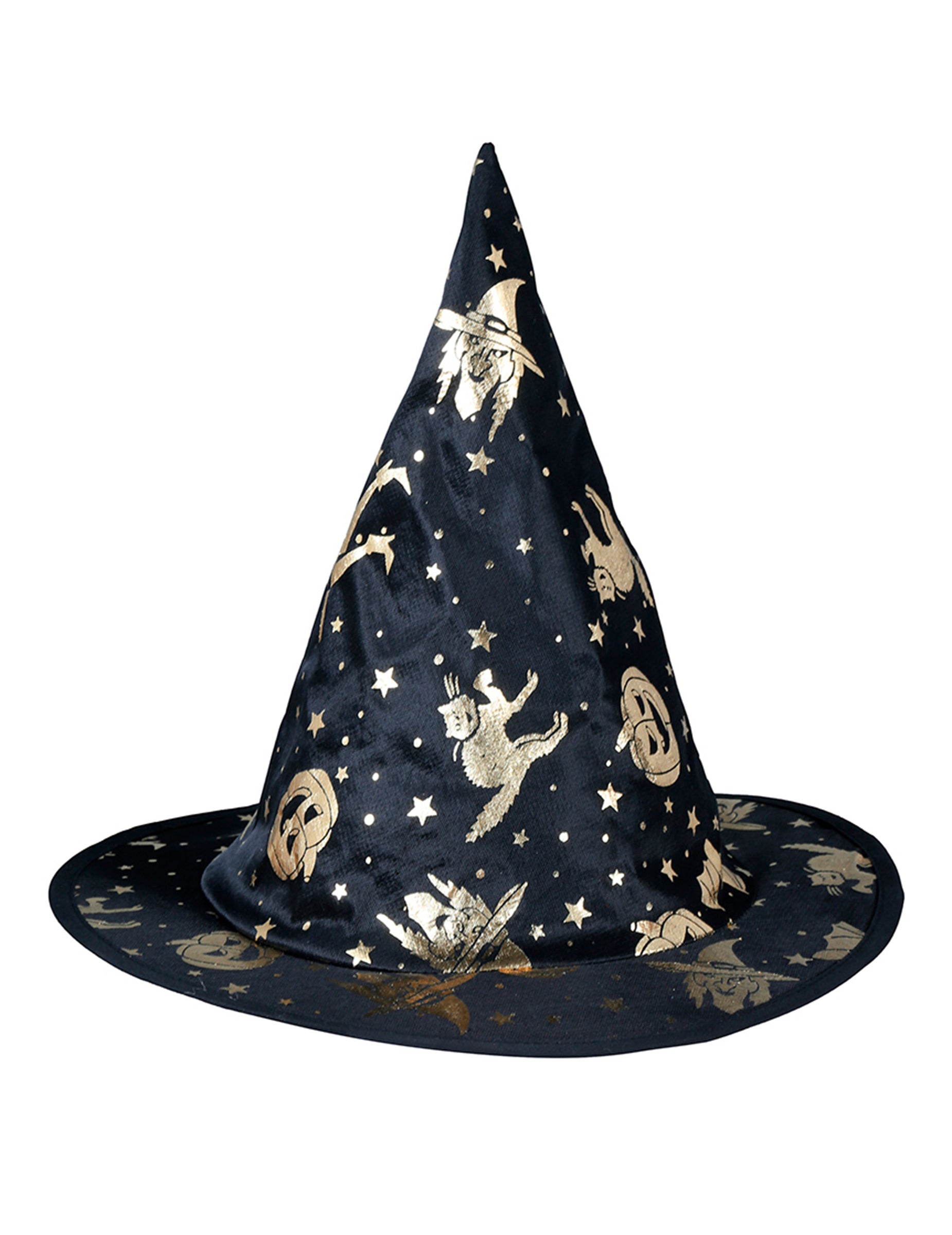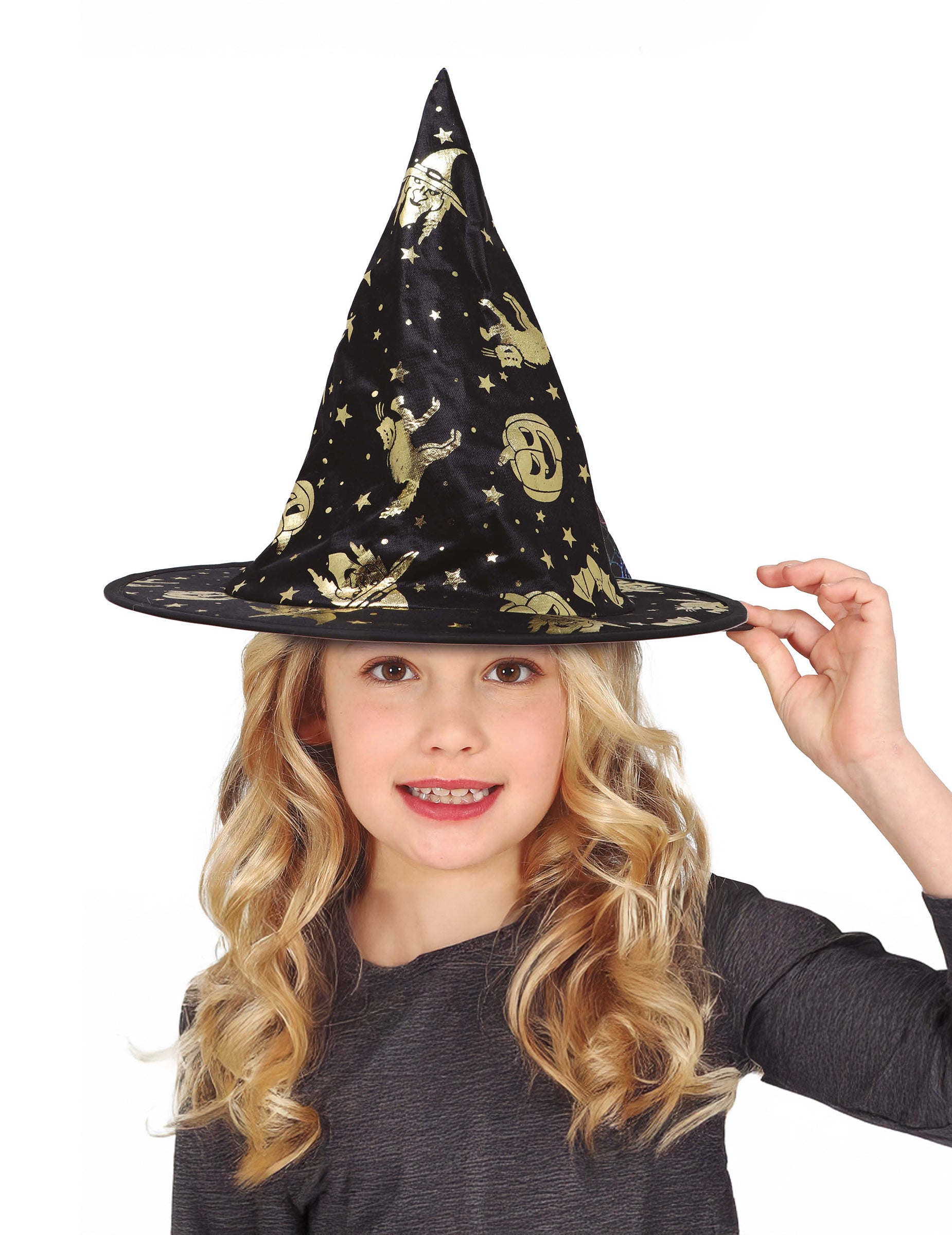 Ta čarovniški klobuk v črni barvi z bleščečimi zlatimi vzorci je popoln dodatek za dopolnitev otroškega čarovniškega kostuma. Njegova špičasta oblika in širok trd rob poskrbita za skrivnosten in eleganten videz, idealen za bleščanje na Noč čarovnic ali na pustnih zabavah.