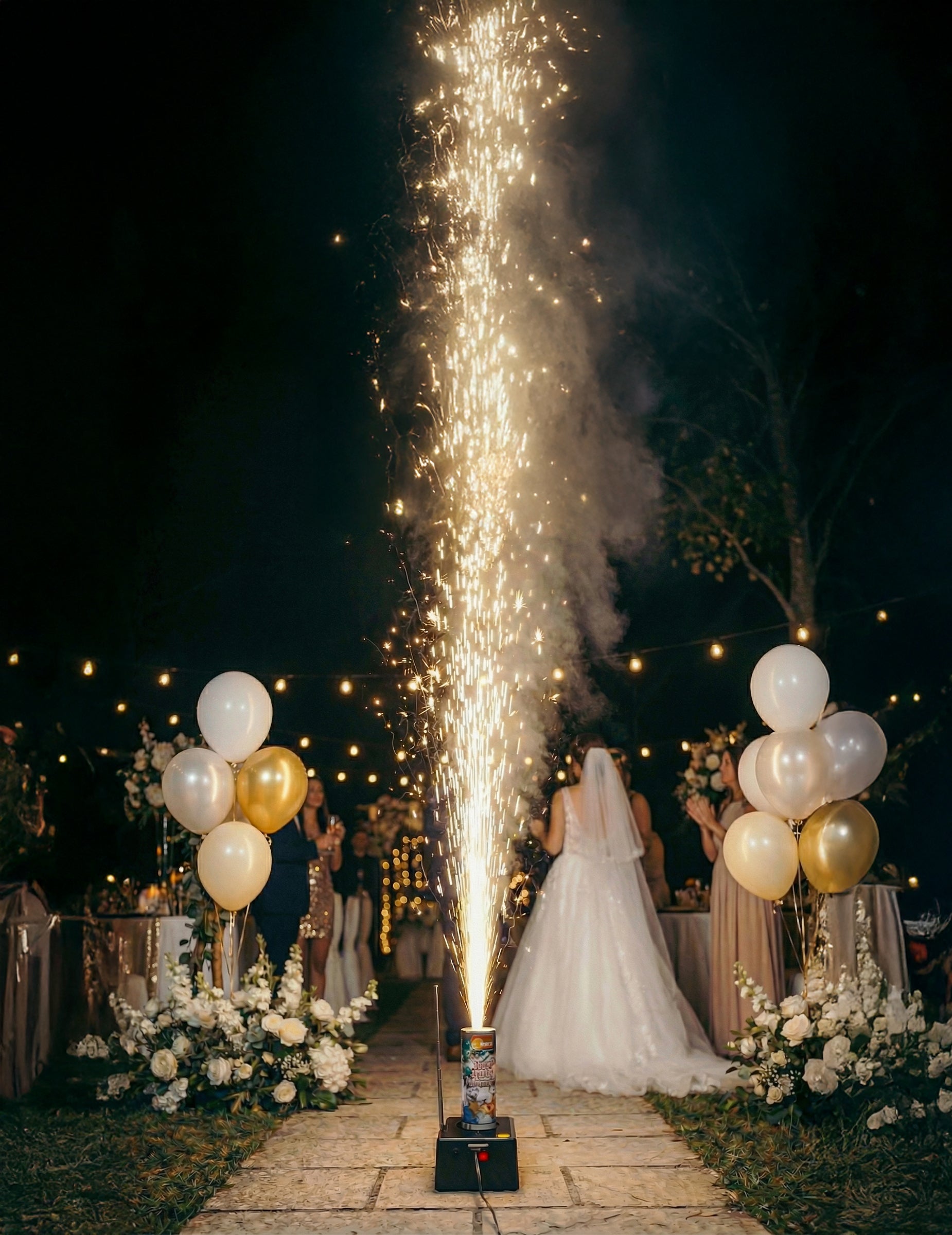 Ta zlata scenska fontana izstreli impresiven steber zlatih isker do treh metrov višine za približno trideset sekund. Njen spektakularen učinek takoj spremeni vaš praznični dekor v pravo scensko doživetje.