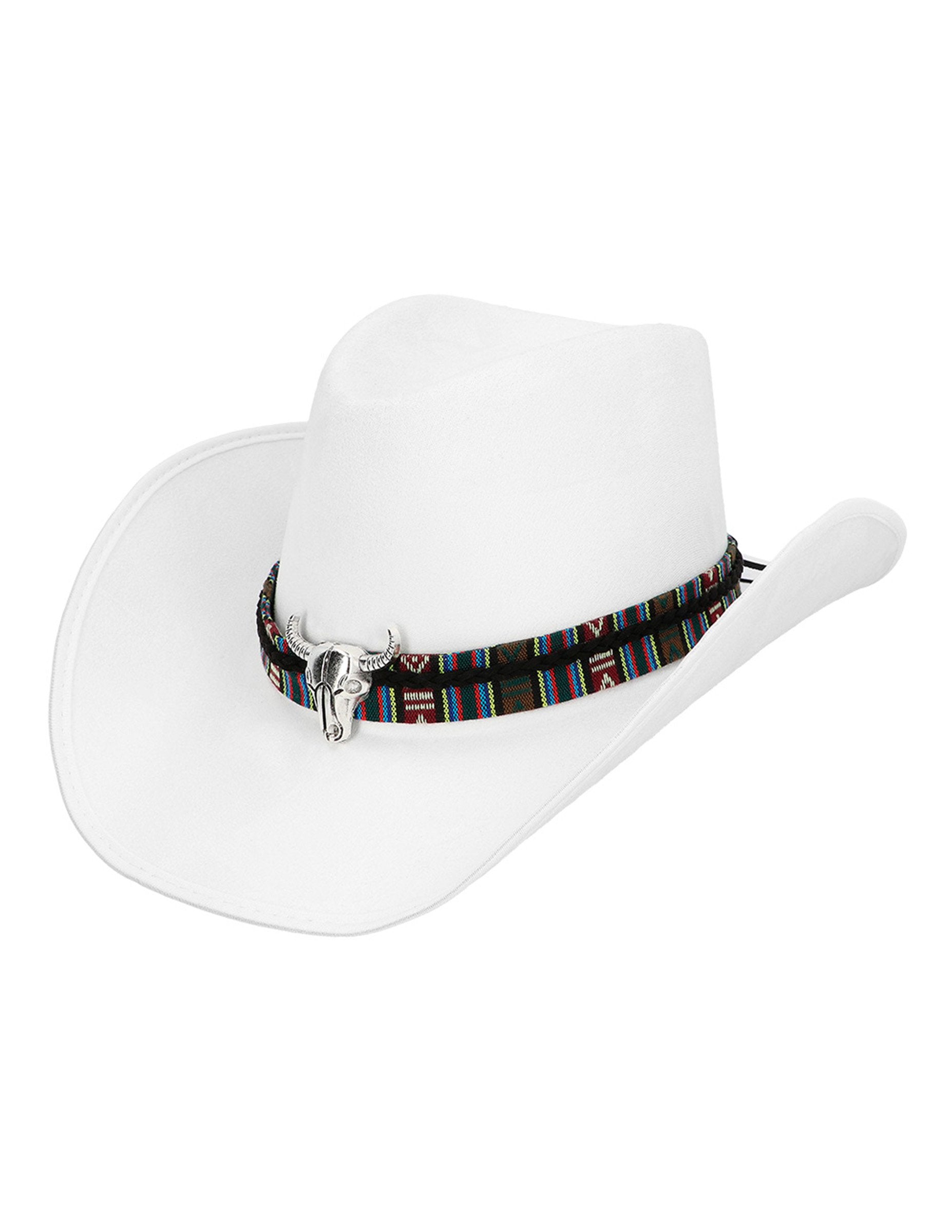 Ta bel kavbojski klobuk za odrasle ima značilno kovinsko bizonsko glavo, nameščeno na okrasnem traku z etničnimi vzorci. Njegova svetla barva in material, podoben semišu, mu dajeta živahen in pristen slog. Idealen dodatek za dopolnitev obleke za karneval, silvestrovo ali dogodek z zahodnjaško tematiko.