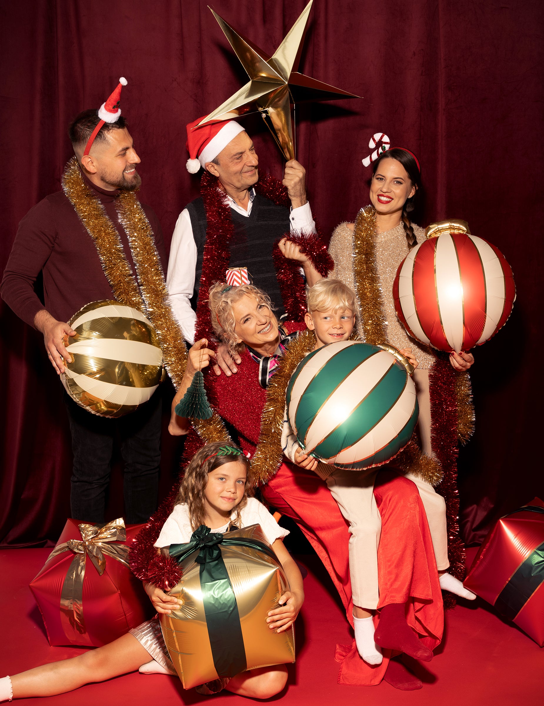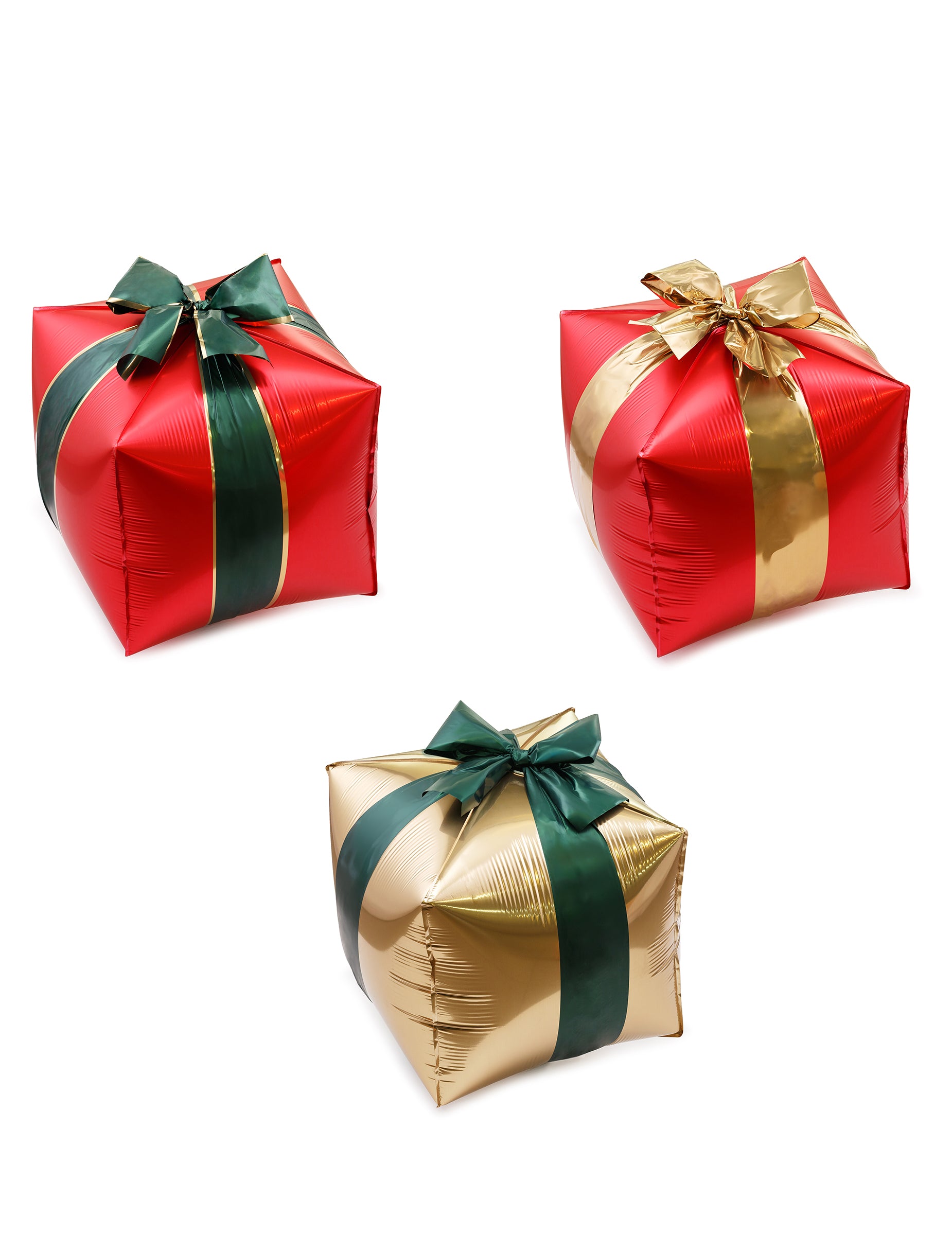 Aluminijasti baloni Božična darila 34 x 36 cm posnemajo videz čudovitih daril, okrašenih z bleščečimi trakovi in bogatimi pentljami. Vsak kockast balon je na voljo v tradicionalni paleti zlate, živo rdeče in temno zelene barve, ki pričarajo pravo božično vzdušje.