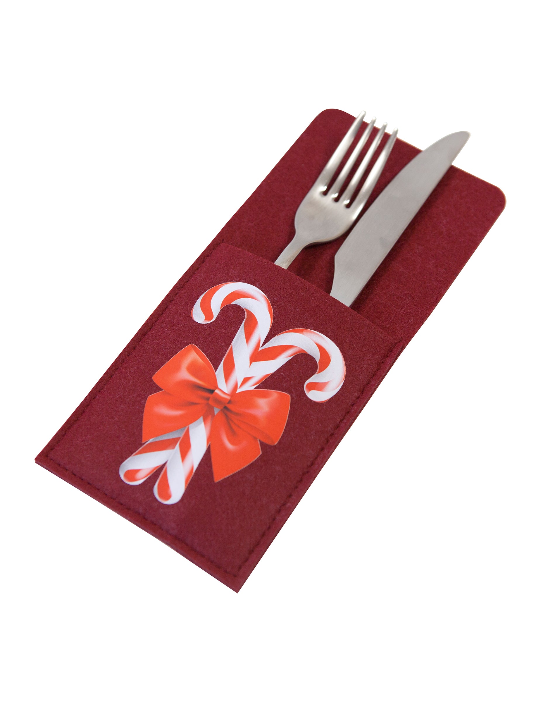 Ta komplet dveh vrečke za jedilni pribor Izdelana je iz rdečega filca in ima očarljiv motiv sladkorne palčke, okrašen s trakom za toplo in vabljivo vzdušje. Mehka in enostavna za namestitev, doda vašemu ... Božična mizaTi dodatki so idealni za elegantno razstavljanje vaših pripomočkov med prazniki in odlično dopolnjujejo dekoracija tradicionalno rdečo in belo.